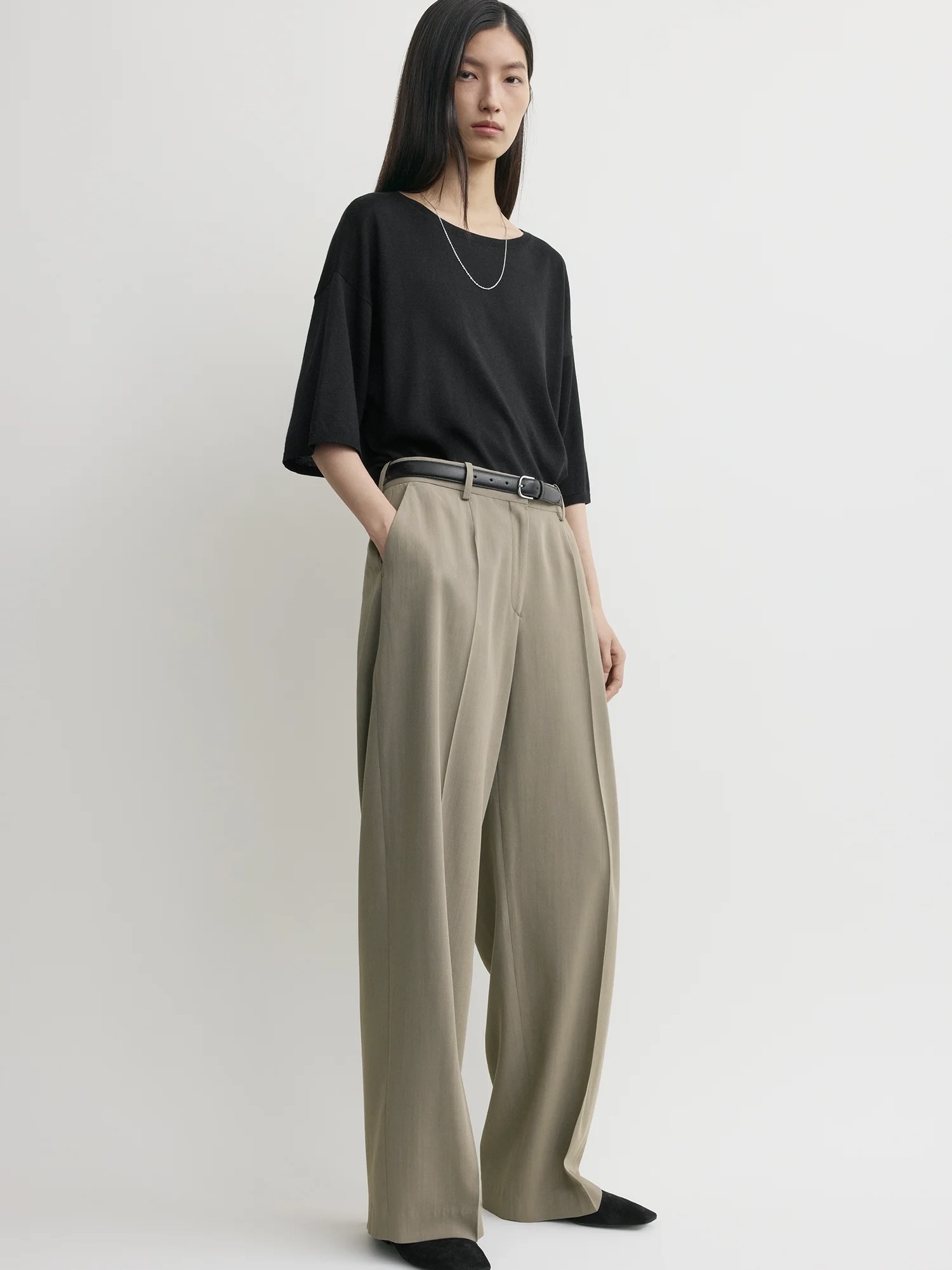 Høst-vinter 25s definerende bukser har en vid, rett silhuett som smalner forsiktig av mot falden. De er skreddersydd av en flytende viskose-ullblanding med en strukturert linning, lav midje og en ren front med presis innskjæring. Style dem med en innslengt topp for å fremheve det sjenerøse benfallet.