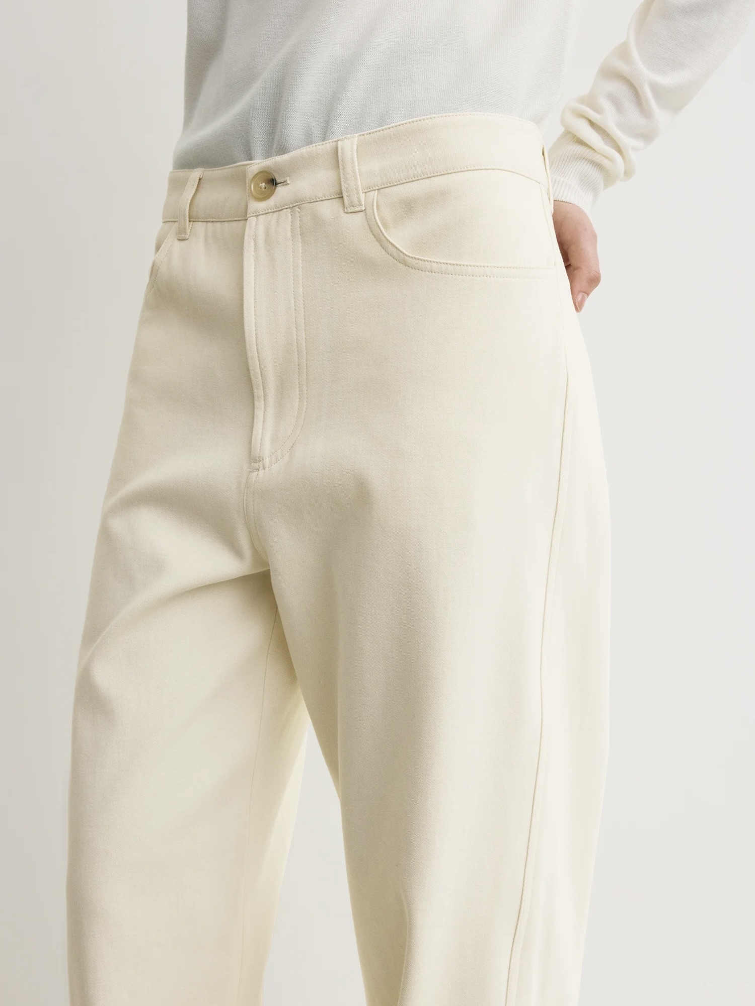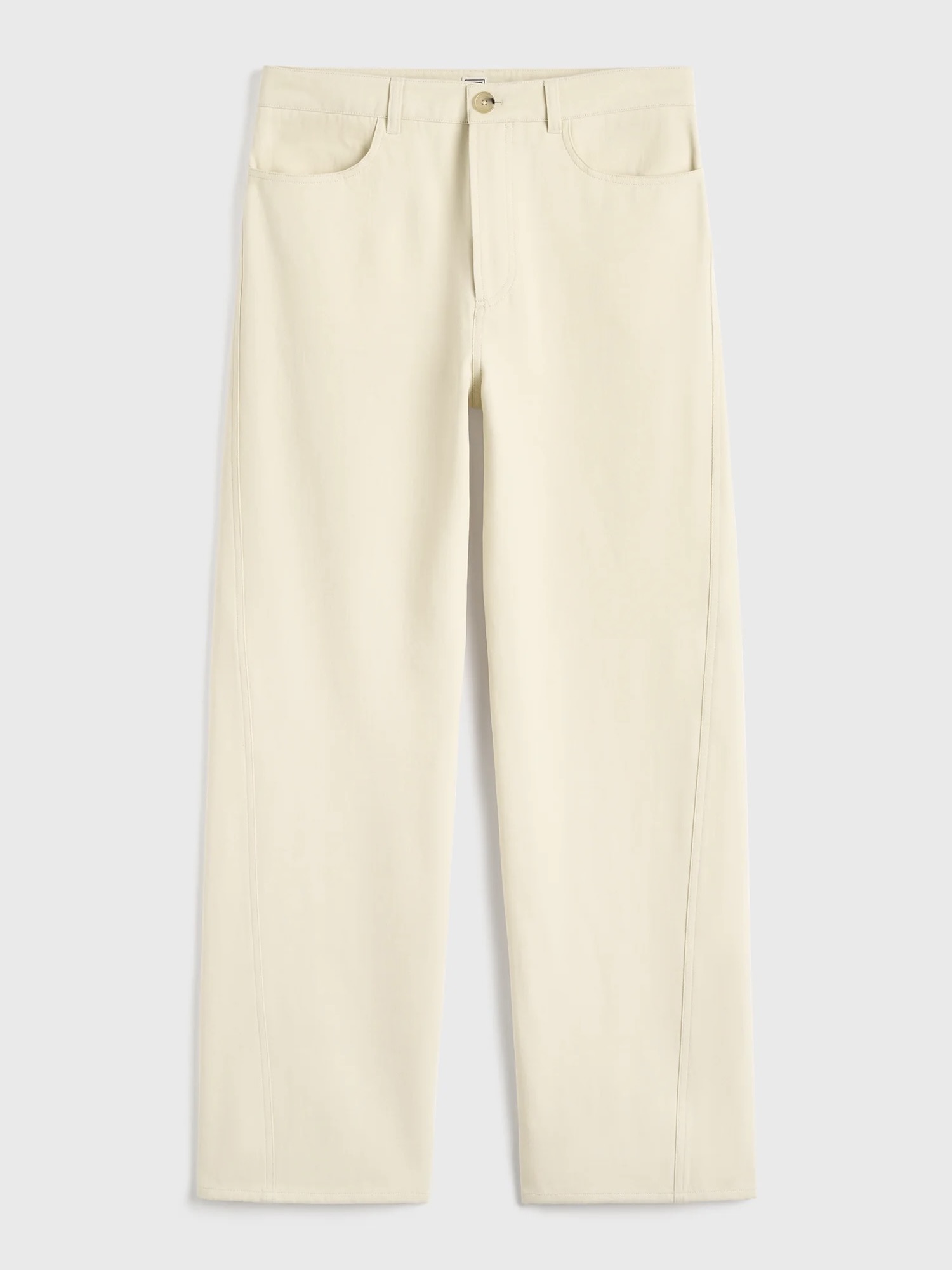 TOTEME Twisted seam denim, oppkalt etter sine signaturvridde sømmer, er gjenskapt som skreddersydde bukser med en overdimensjonert, avslappet passform for hverdagsbruk. Laget av ekstra myk bomull, har beltehemper, lommer foran og bak og glidelåsgylf.