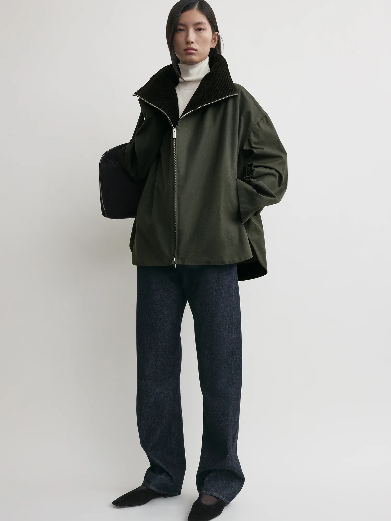 Dette overdimensjonerte plagget er en nytolkning av Toteme sin Country-jakke, og har en romslig, traktutringning fôret med kordfløyel – et uttrykk for kolleksjonens fokus på å finne ly mot elementene. Den er laget av vannavvisende, vokset bomull med toveisglidelås og presise jetlommer.
