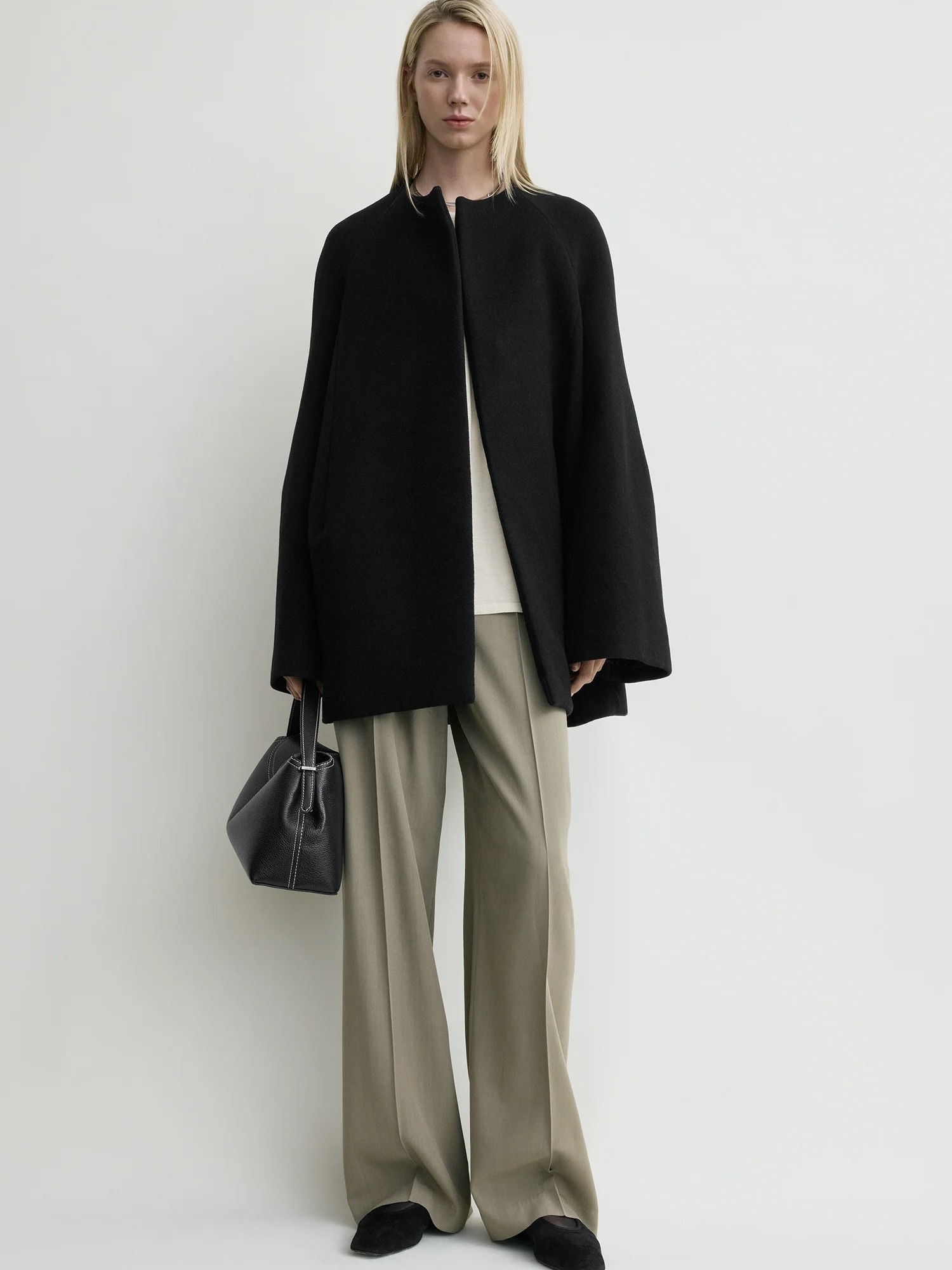 Kåpe med skulpturelle klokkeermer som utstråler en følelse av gammeldags Hollywood-glamour. Den har en omhyggelig raglankonstruksjon som støtter den minimalistiske, krageløse halsutringningen, og er laget av varm ullfilt med en kort, overdimensjonert silhuett. Bruk den over skreddersydd plagg til jobb og over en kjole til kvelden.