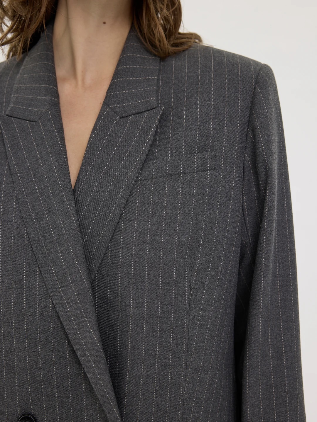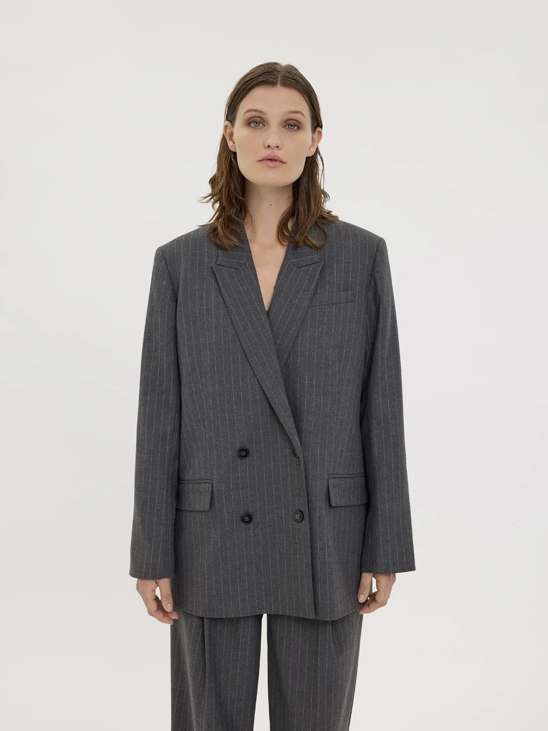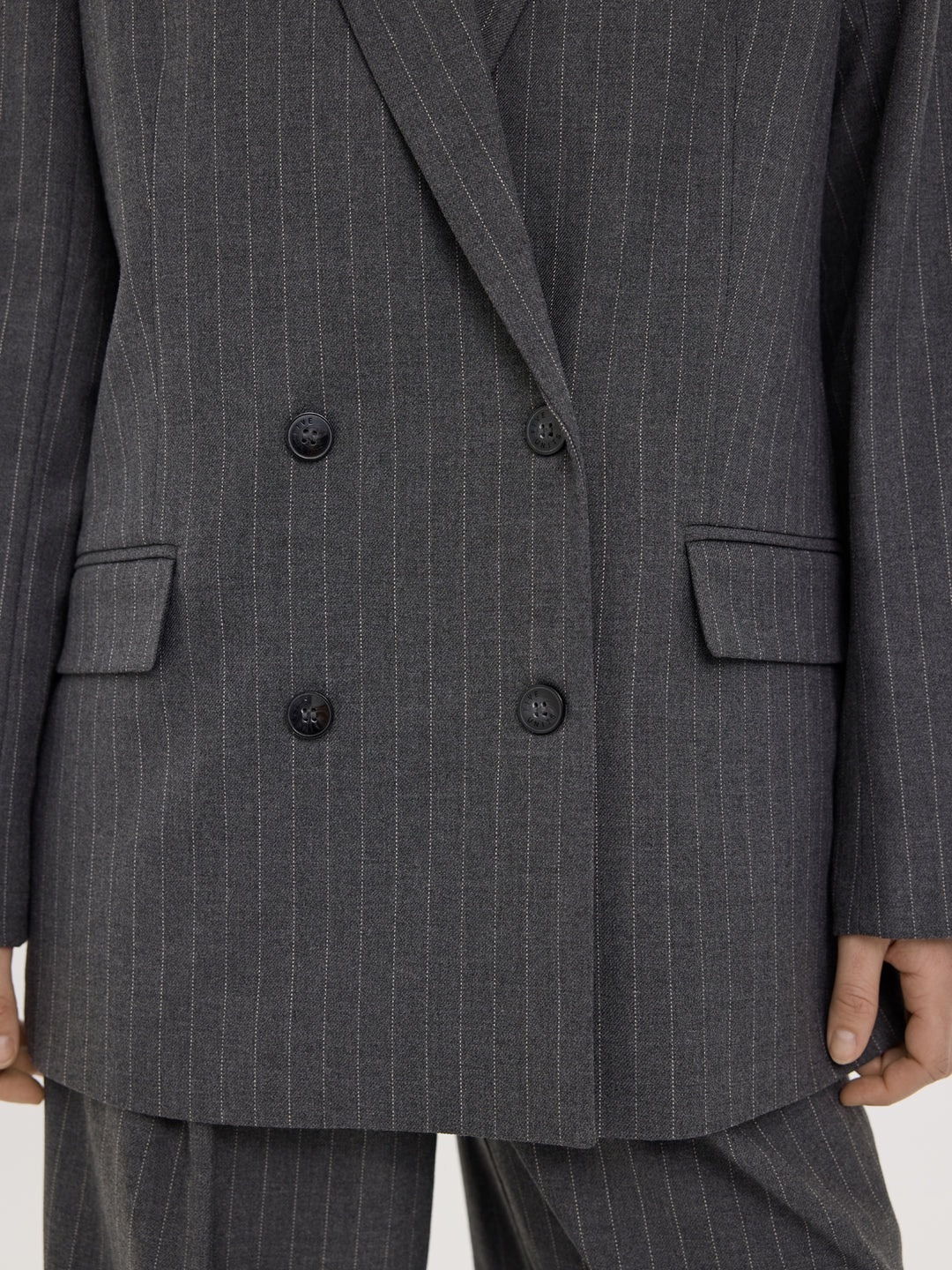 Denne dobbeltspenstede blazeren er et must i enhver moderne garderobe. Den har en oversized passform og er delikat skreddersydd med hakk og myke skulderputer som rammer inn figuren din. Den har lommer med klaff foran og logoknapper, samt en splitt bak som gir deg bevegelsesfrihet.
