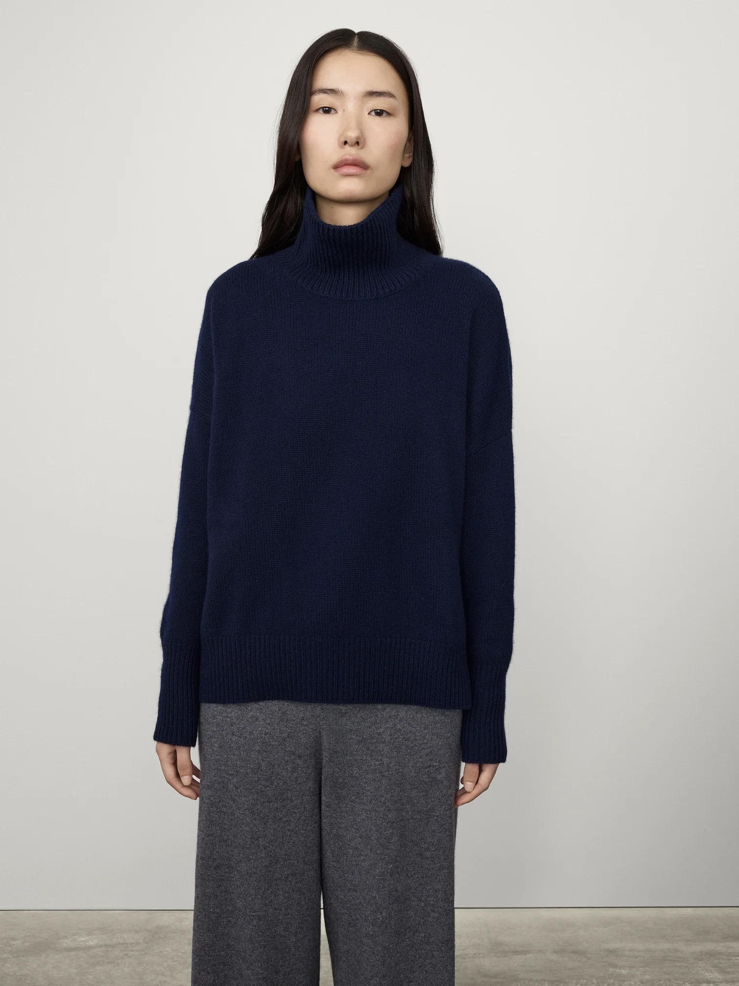 Heidi-genseren er laget av rik, kraftig strikket kasjmir. Den kokongformede silhuetten gjøres mer innbydende av en omsluttende høy hals, senkede skuldre, lange ermer og en fald som faller ned til lengre lengder bak.