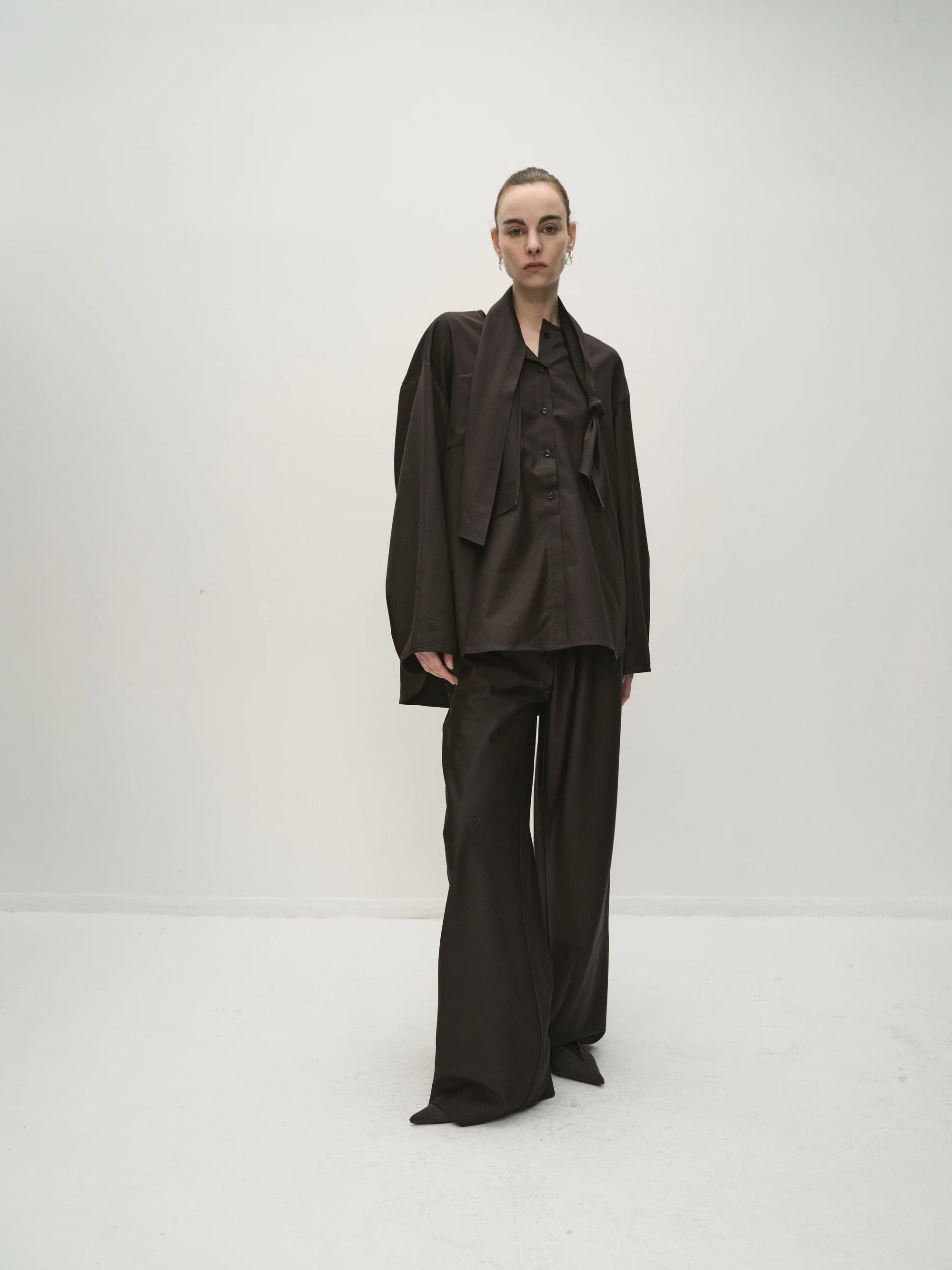 Bukser med diskret teksturert vev. Elastisk linning med snøring. Lett og flagrende stoff.
