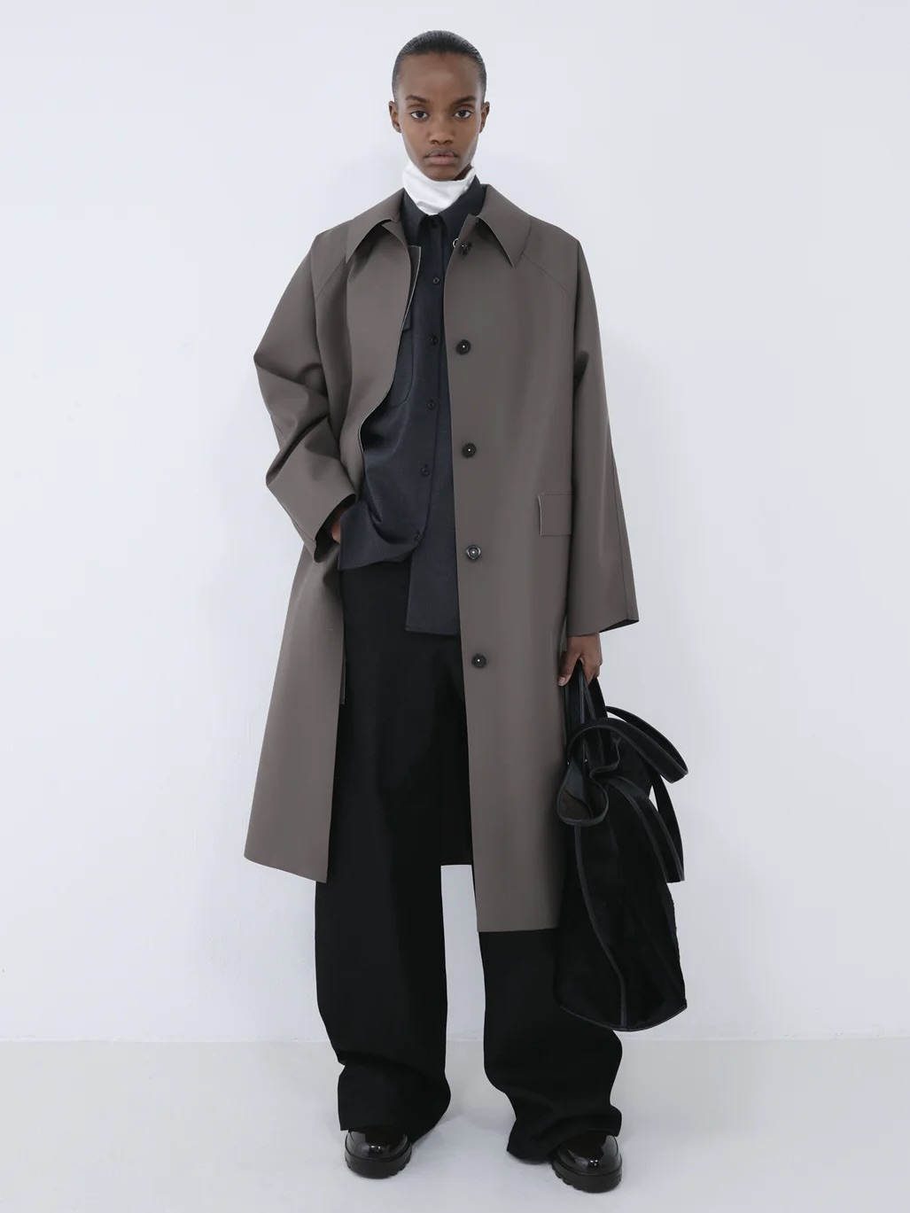 Original gummi i fargen ash. Funksjonelle detaljer som teipede sømmer gjør jakken fullstendig vannavvisende. Utskjæringer på baksiden av jakken gir komfortabel luftsirkulasjon. Jakken har en overdimensjonert og firkantet form med rå kanter, spredt krage, knappelukking foran, lange ermer og sidelommer.