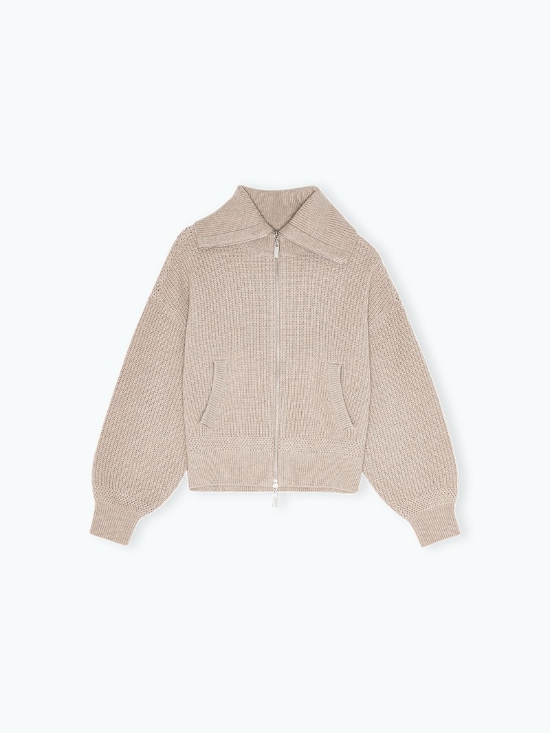 Knitted Cropped Bomber Beige er laget av en myk blanding av 95 % merinoull og 5 % kasjmir, begge foretrukne materialer kjent for sin eksepsjonelle kvalitet og komfort. Bomberjakken har glidelås foran, ribbekant i fald og mansjetter, og to lommer foran.