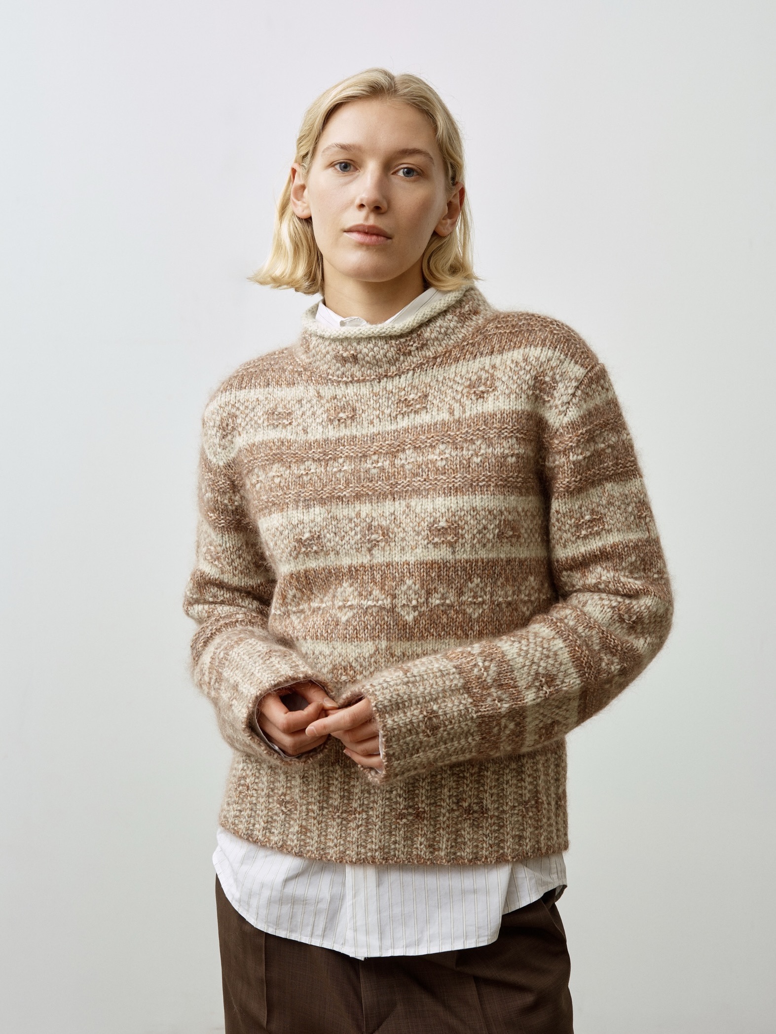 Inspirert av en av Devolds mest ikoniske gensere, Alnes, som ble designet for Devold av Olmes Carretti tilbake i 1995. Nå gjenskapt og strikket med forskjellige teknikker for å skape dybde. Laget av fin lana merino, kid mohair og silke. Mønsteret i 100 % norsk ull gir et røffere utseende.