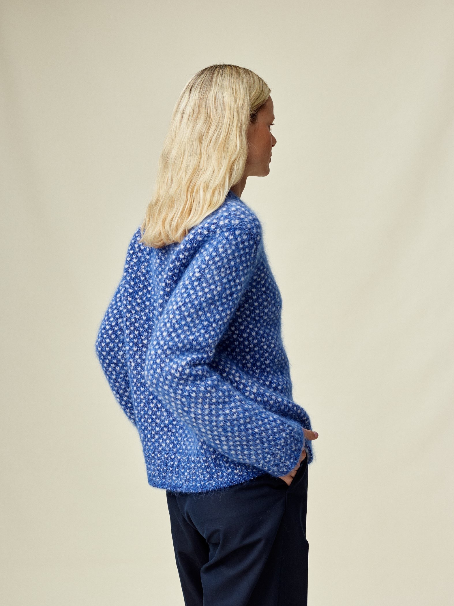 Inspirert av en av Devolds mest ikoniske gensere, Nordsjø. Designet som en kraftig strikkegenser med et uregelmessig mønster detaljert gjennom hele plagget og strikket i flere farger for å skape dybde. Laget av fin lana merino, kid mohair og silke. Mønsteret i 100 % norsk ull gir et røffere utseende. Kan styles som unisex.