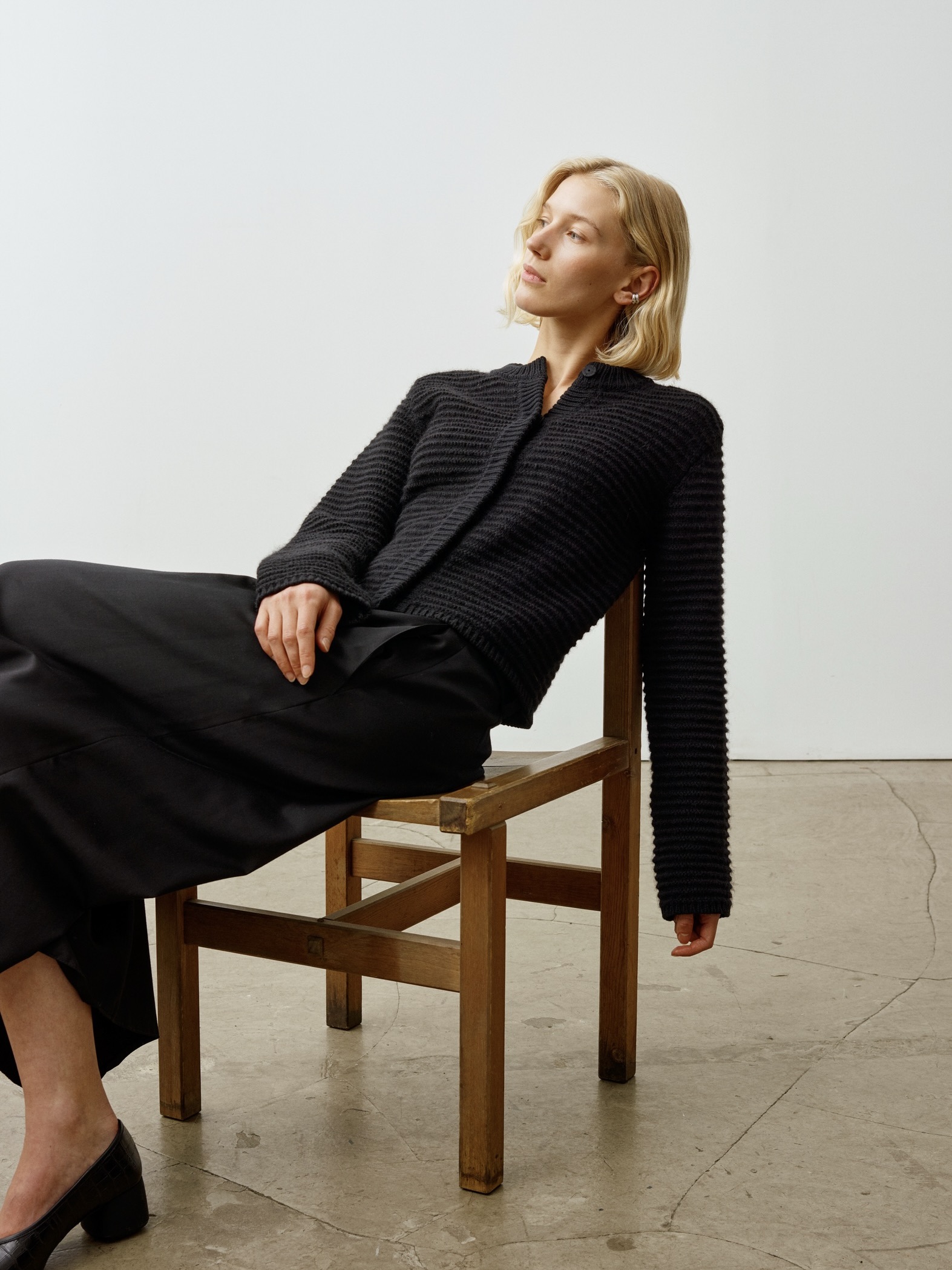 Damecardigan, nå tilgjengelig i svart og off-white. Laget av ultrafin merinoull og kasjmir, med skjulte trykknapper. Strikket i forskjellige garn og teknikker, noe som gir stripene i hele plagget en 3D-effekt.