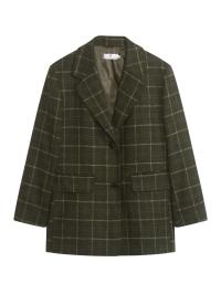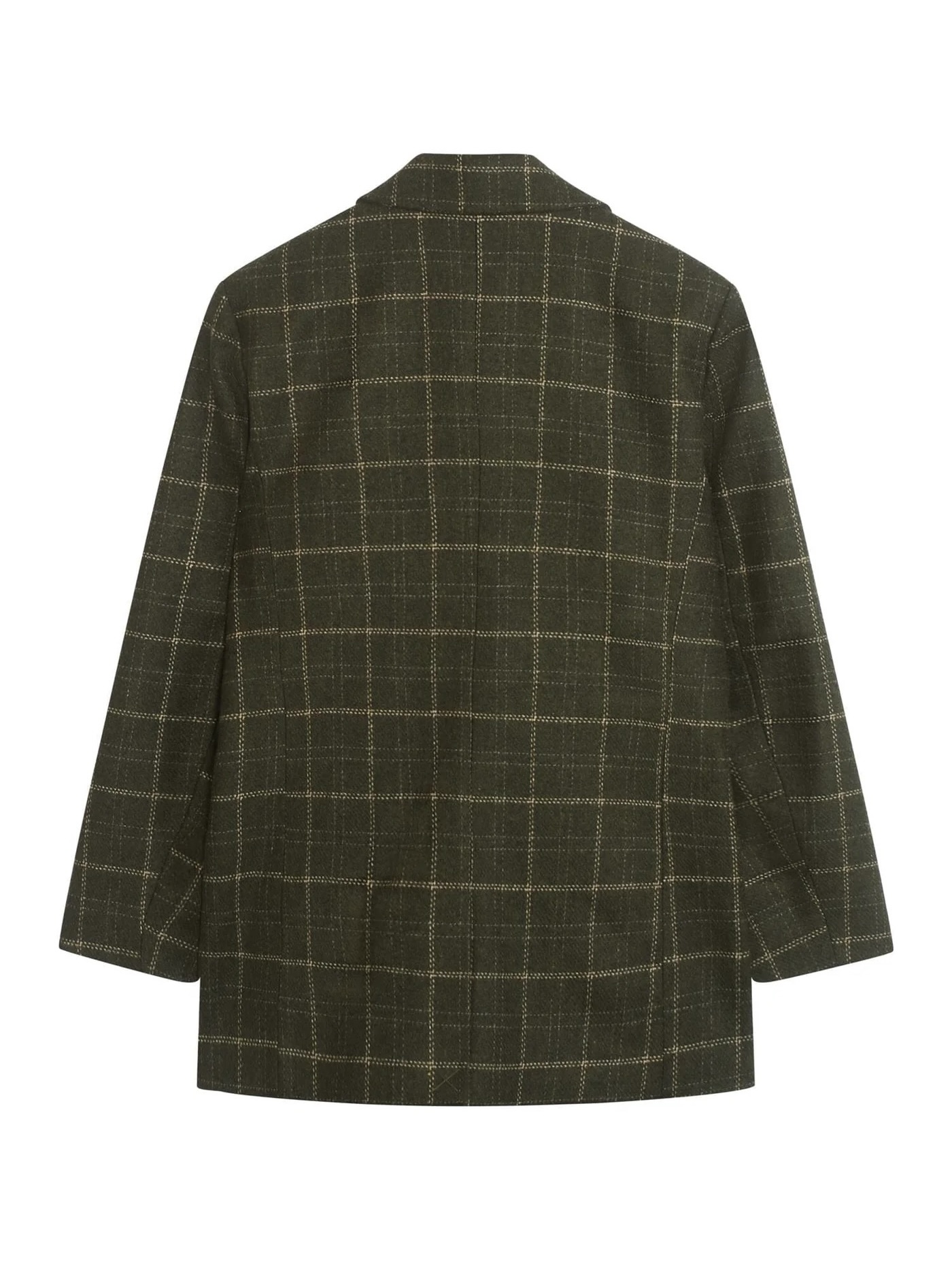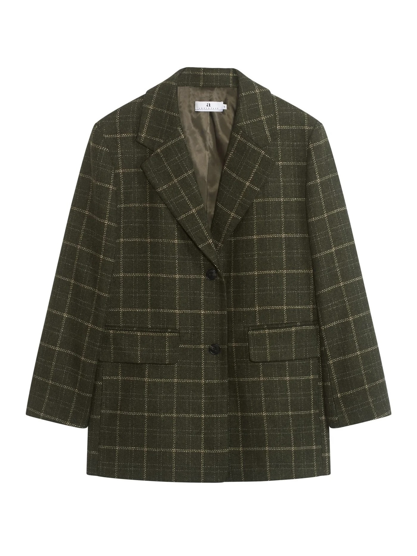 Kul tweedblazer i en tynn ullblend. Modellen er designet med bredt jakkeslag, to frontlommer og splitt i ryggen. Noe overdimensjonert fasong.