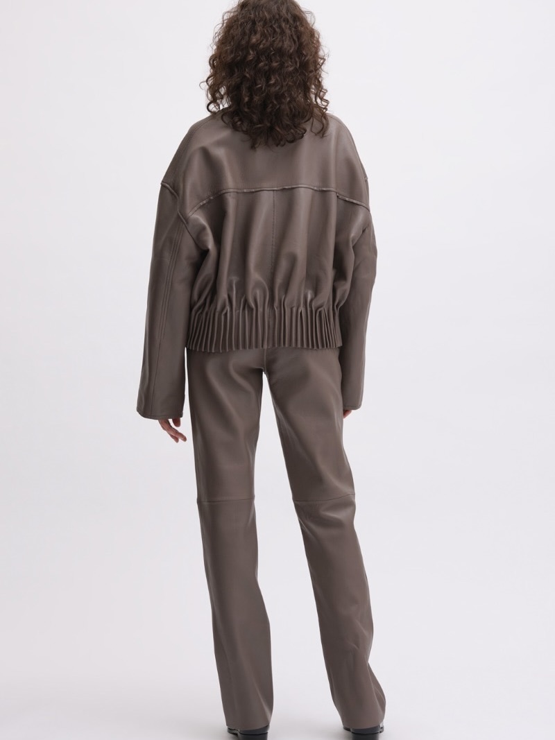 Bonded Leather Jacket Brown er laget av glatt lammeskinn med høy krage og glidelås. Baksiden har en karakteristisk delvis elastisk kant for en strukturert passform, og jakken har diskrete sidelommer. Jakken er fôret.
