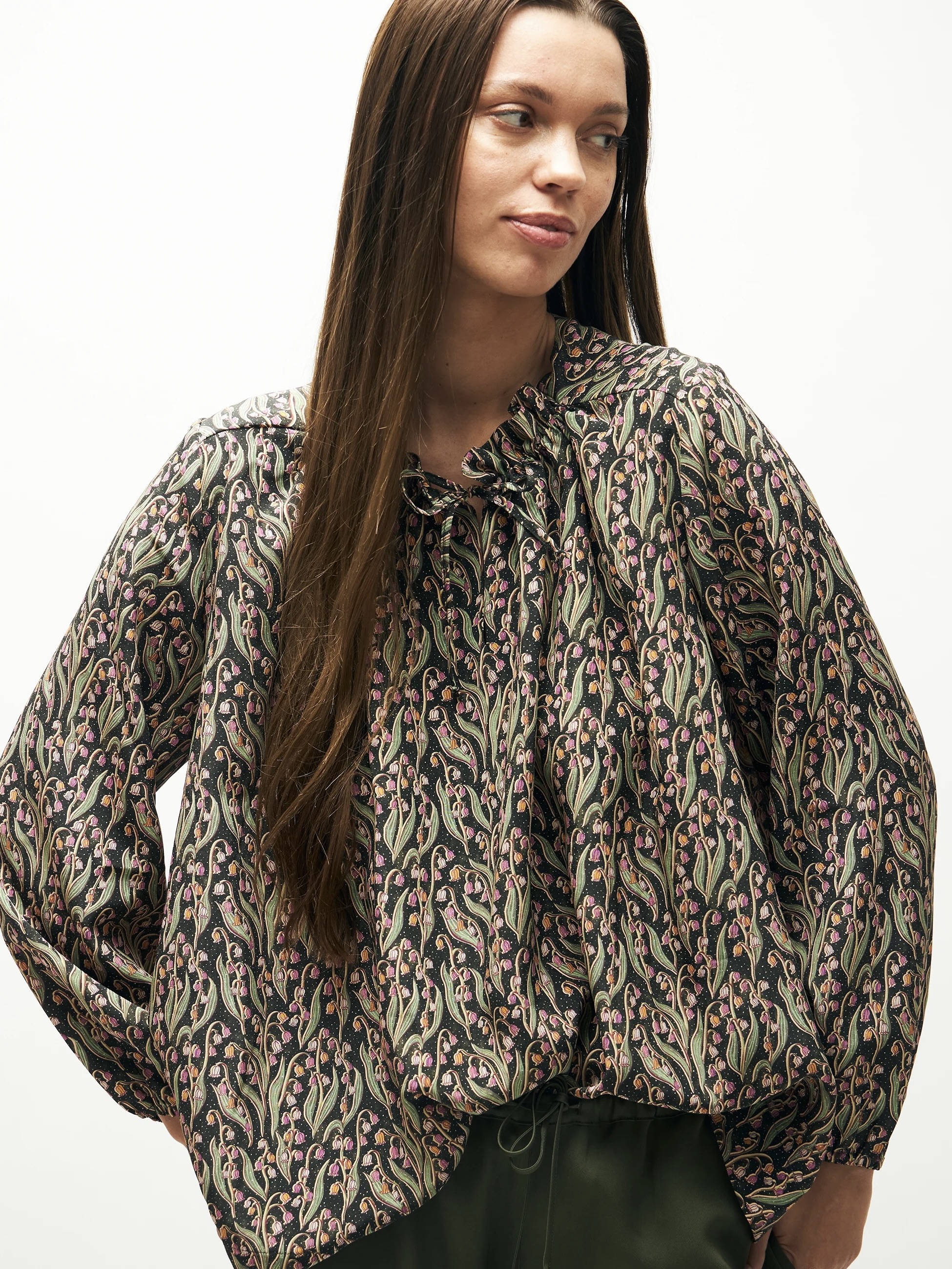 Nini Shirt er laget av 100 % silke og har en avslappet silhuett med knyting i halsen. Det poetiske «Kielo»-trykket tilfører mykhet og sjarm – noe som gjør henne til et enkelt valg for både hverdagslig eleganse og oppløftede øyeblikk.