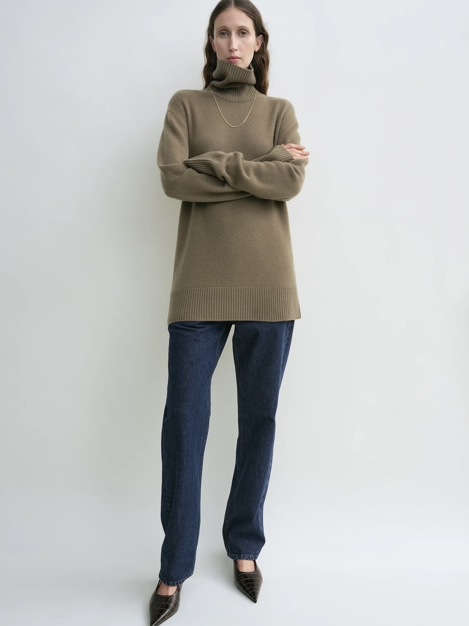 Designerens merknad: «I jakten på å skape den perfekte kasjmir-høyhalskragen, kuttet vi denne til en rett passform med en litt lengre kant. Den børstede overflaten gir den en utrolig myk følelse.»