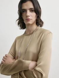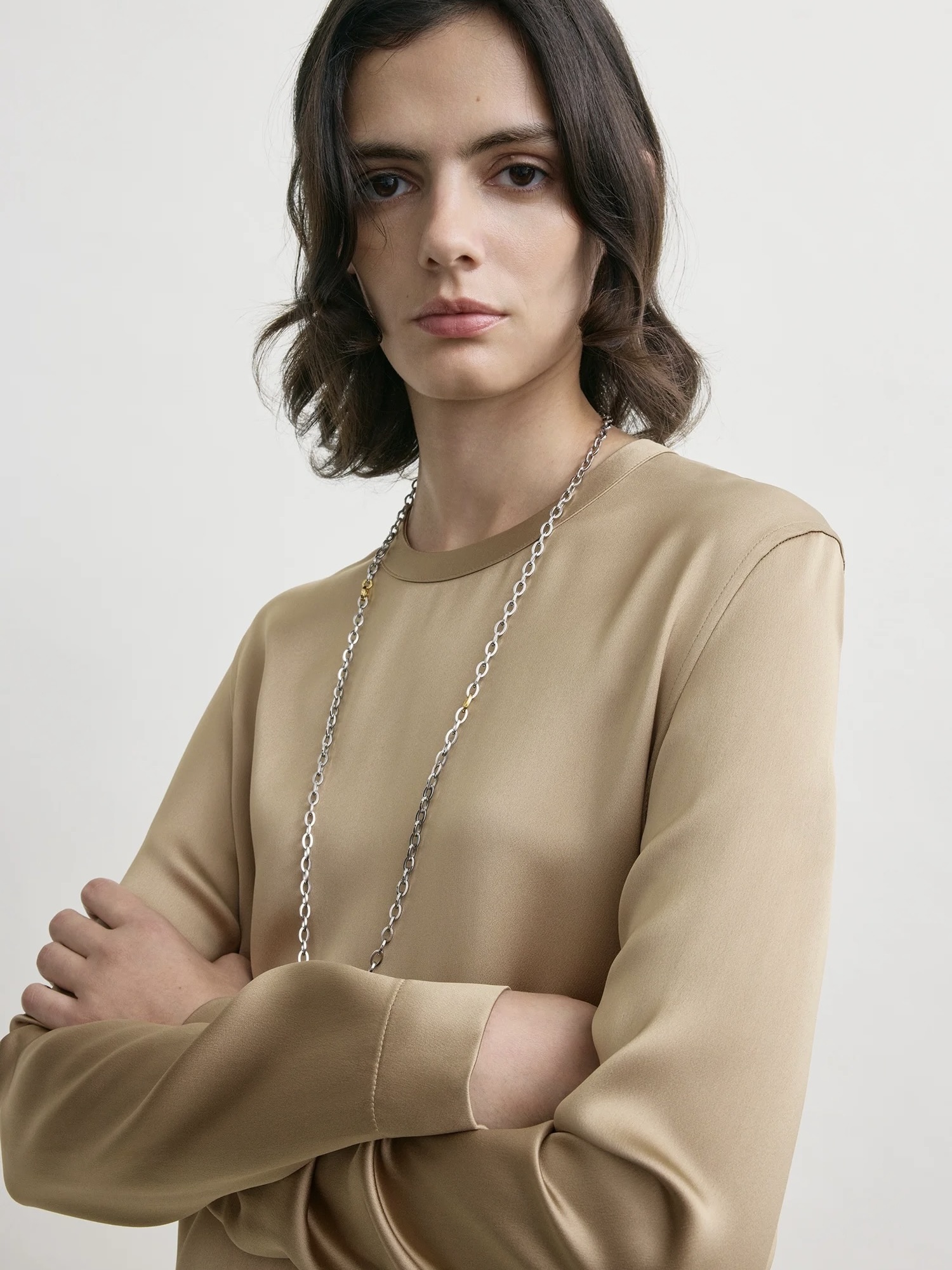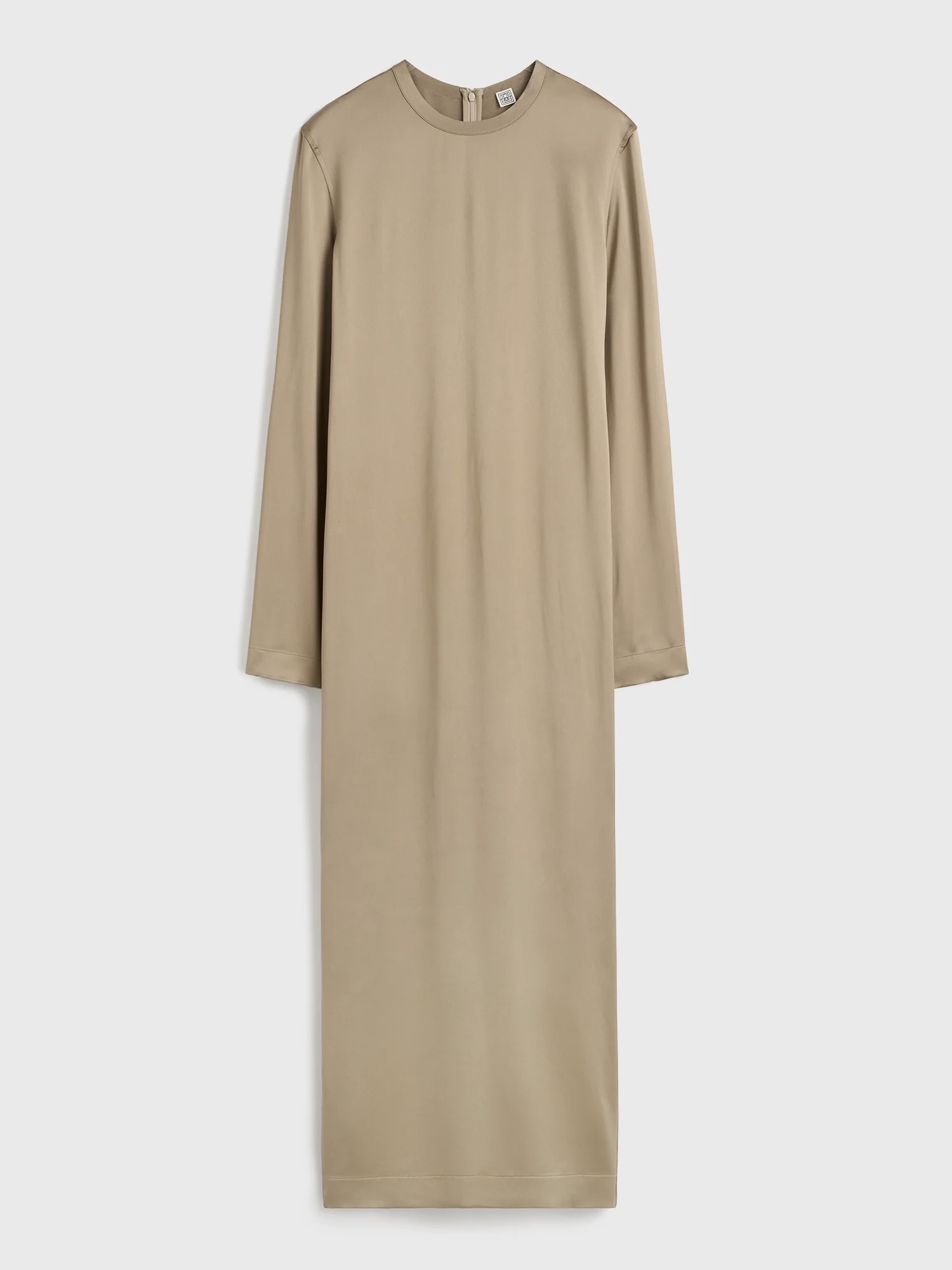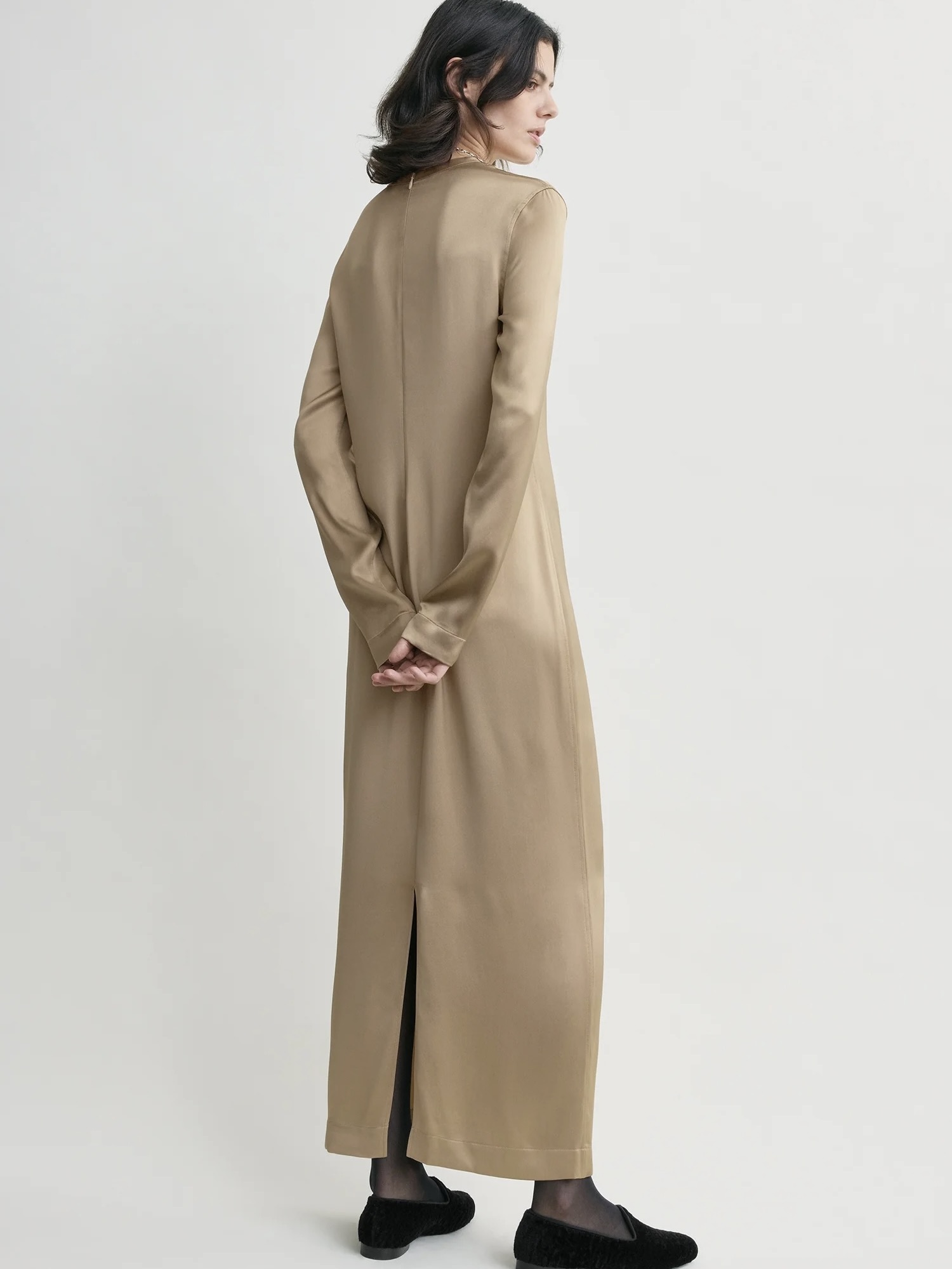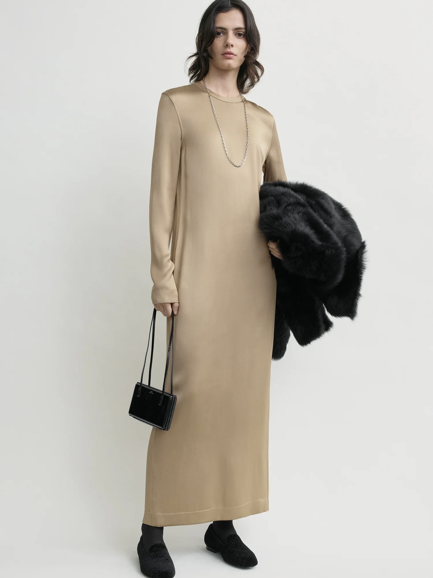 Langermet, gulvlang festkjole i skinnende og flytende sateng, med minimalistisk rund hals. Bruk den for uanstrengt overgang fra dag til kveld.