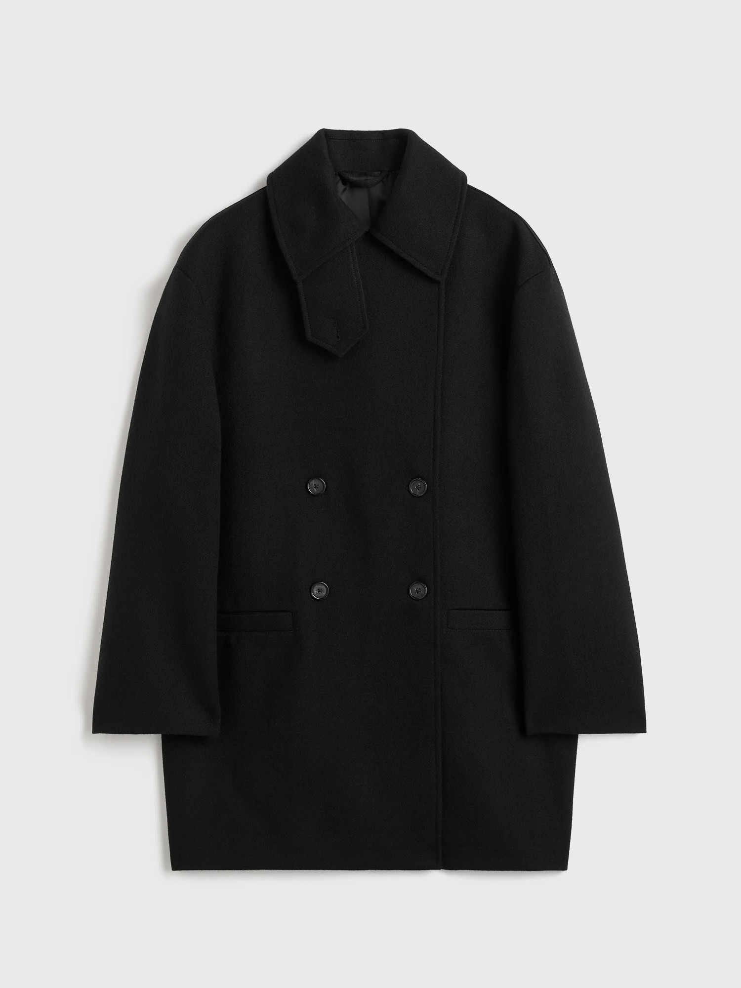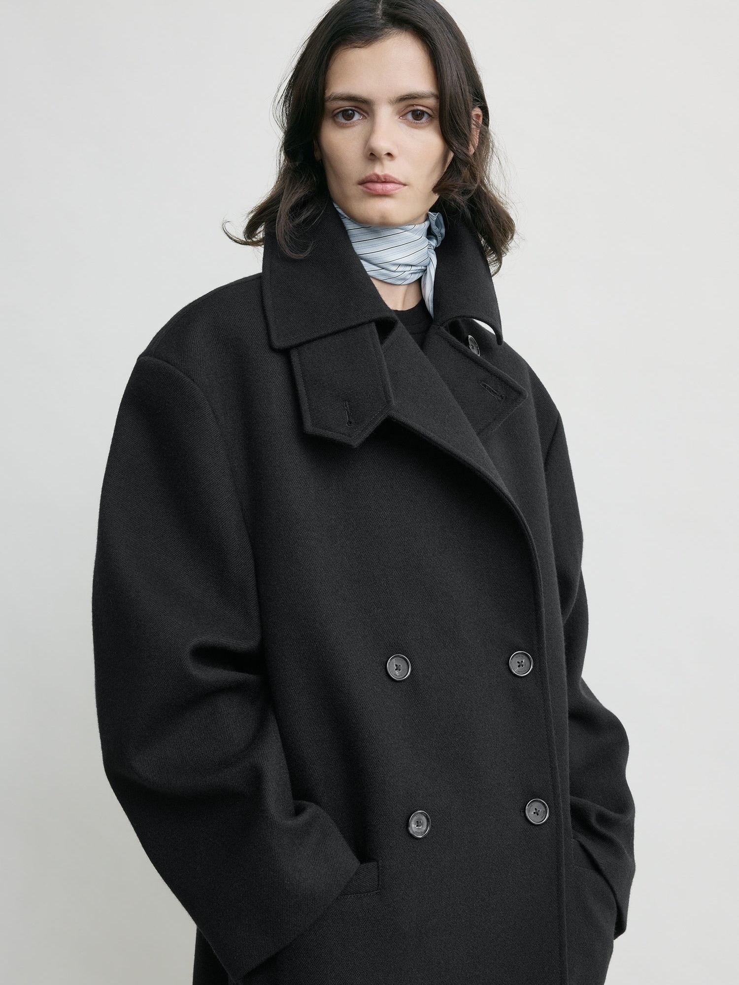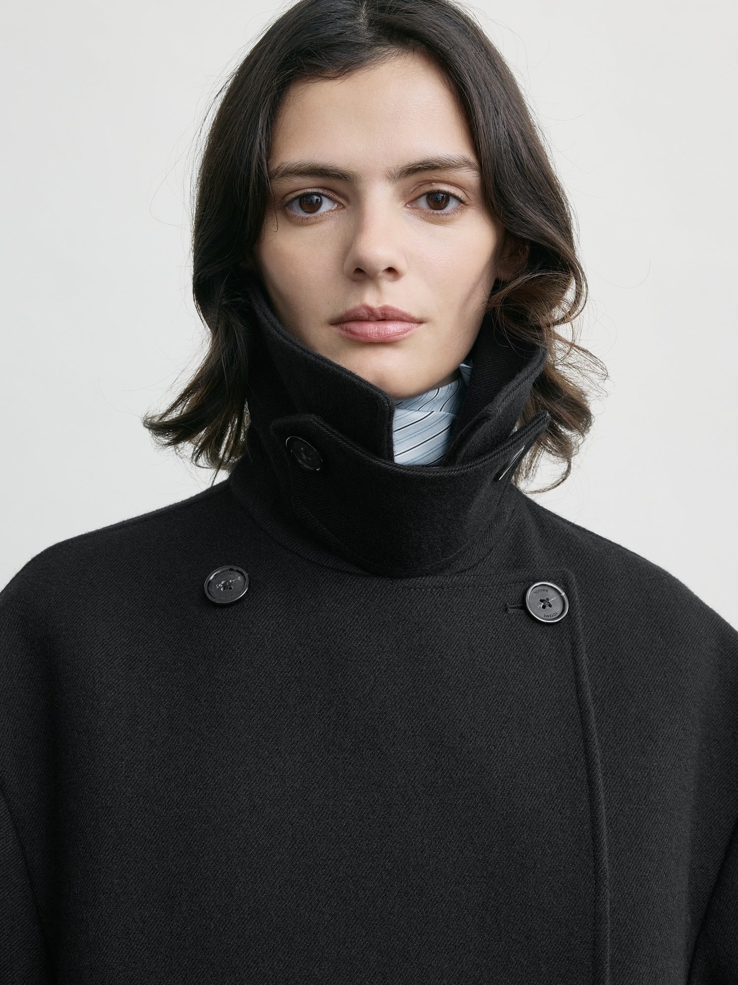 Denne dobbeltspente kåpen er en skulpturell nytolkning av en tradisjonell peacoat, og har en vid, overdimensjonert silhuett som gir en kokongeffekt. Style den oppreist med låsen lukket for å beskytte deg mot elementene.