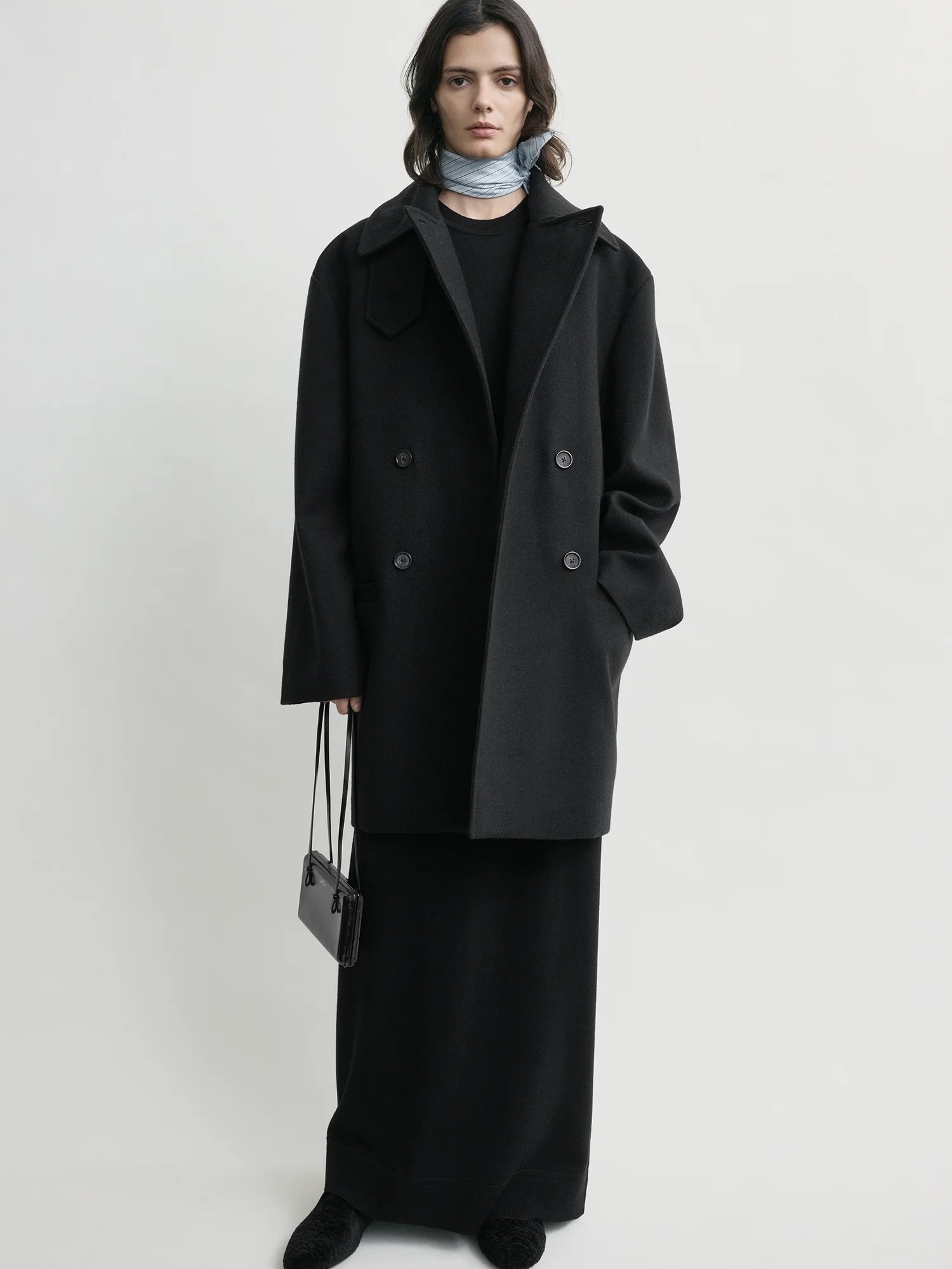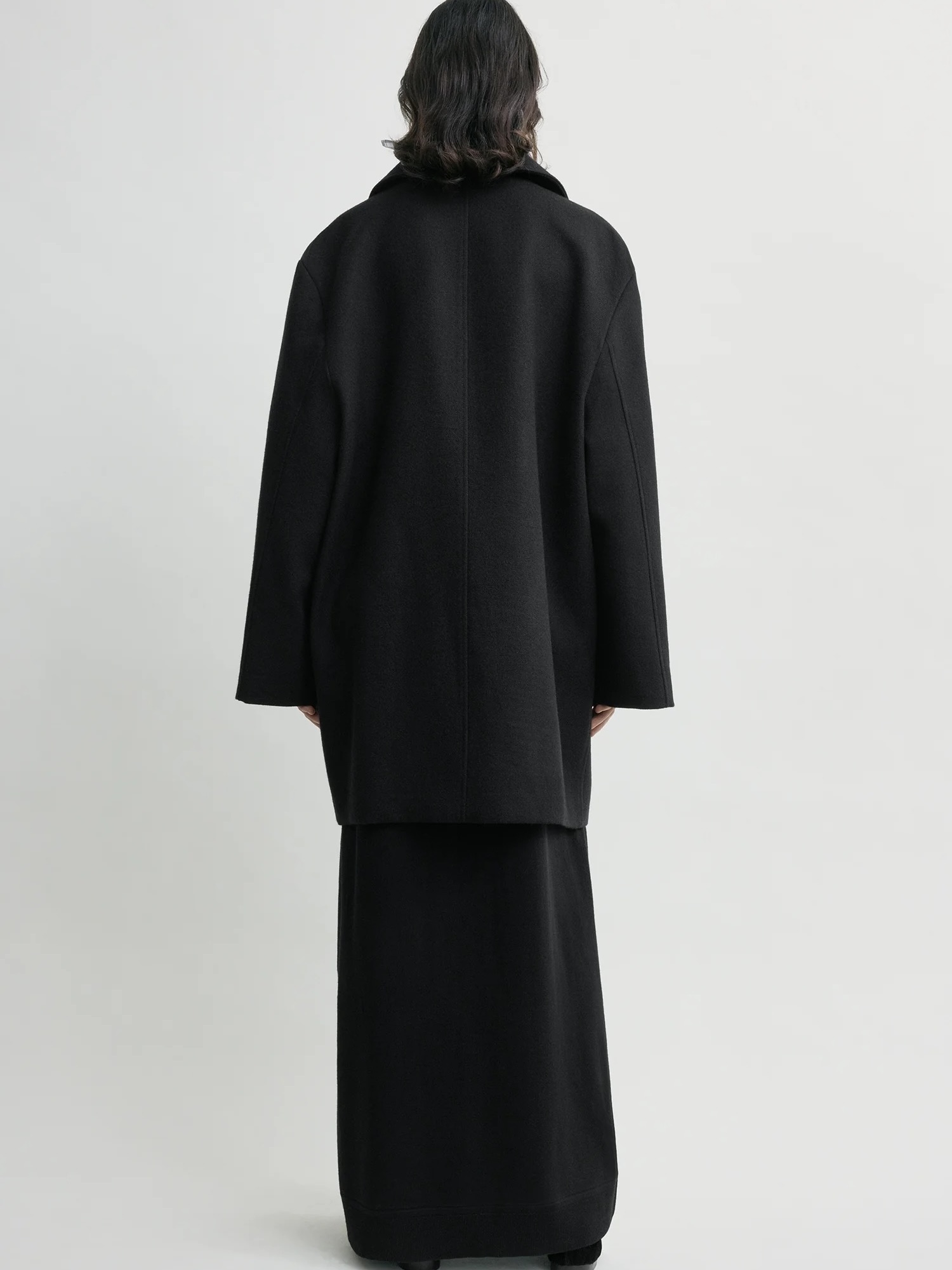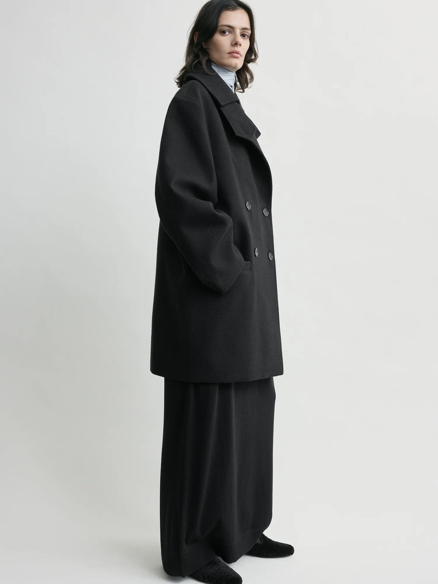 Denne dobbeltspente kåpen er en skulpturell nytolkning av en tradisjonell peacoat, og har en vid, overdimensjonert silhuett som gir en kokongeffekt. Style den oppreist med låsen lukket for å beskytte deg mot elementene.