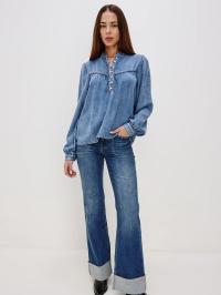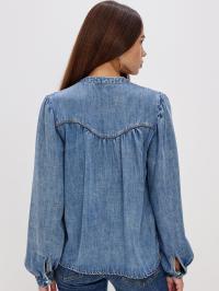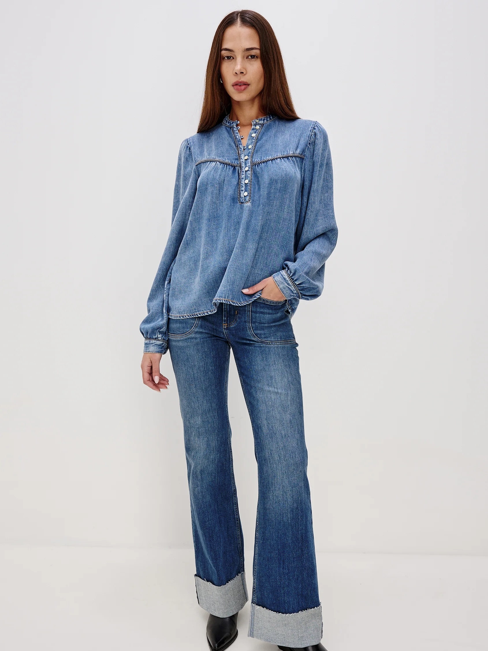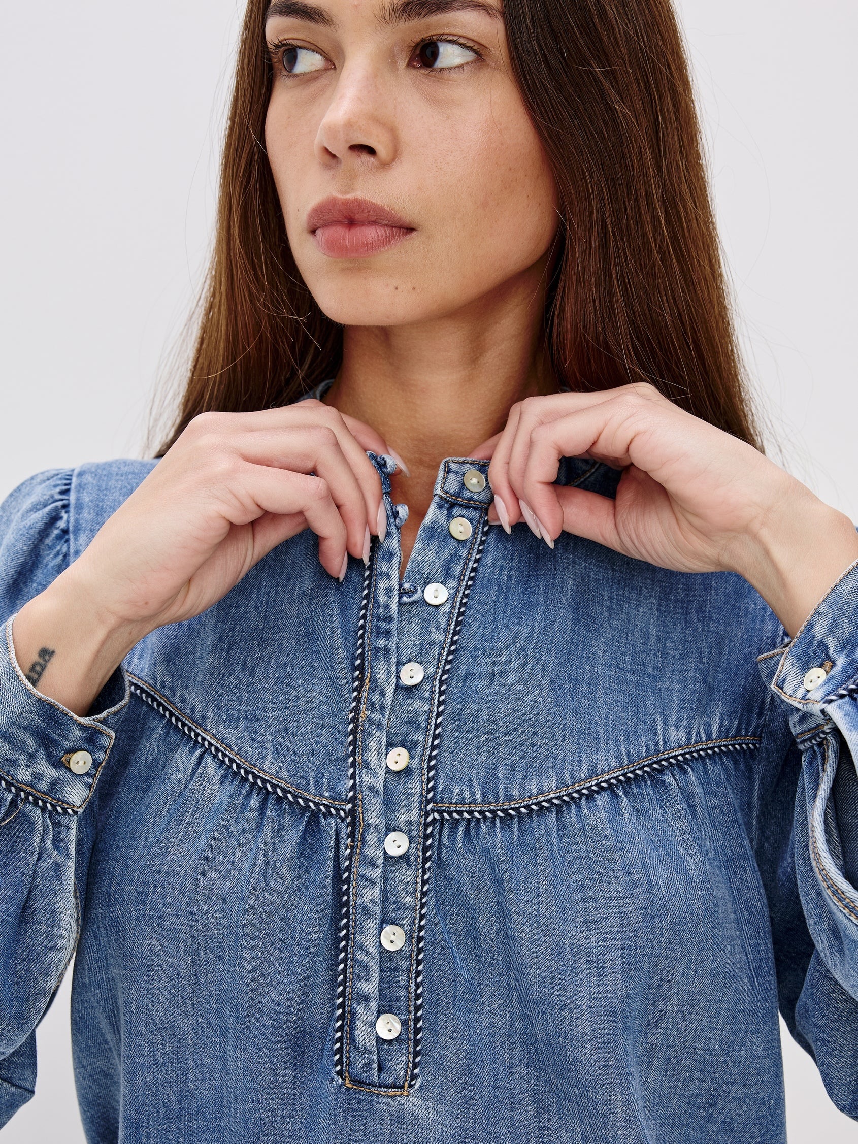 Sunna er en tidløs denimskjorte med en klassisk vask. Den har en halv frontknapp med skallknapper, tofarget vridd kantbånd, høy hals og lange puffermer med tettsittende mansjetter.