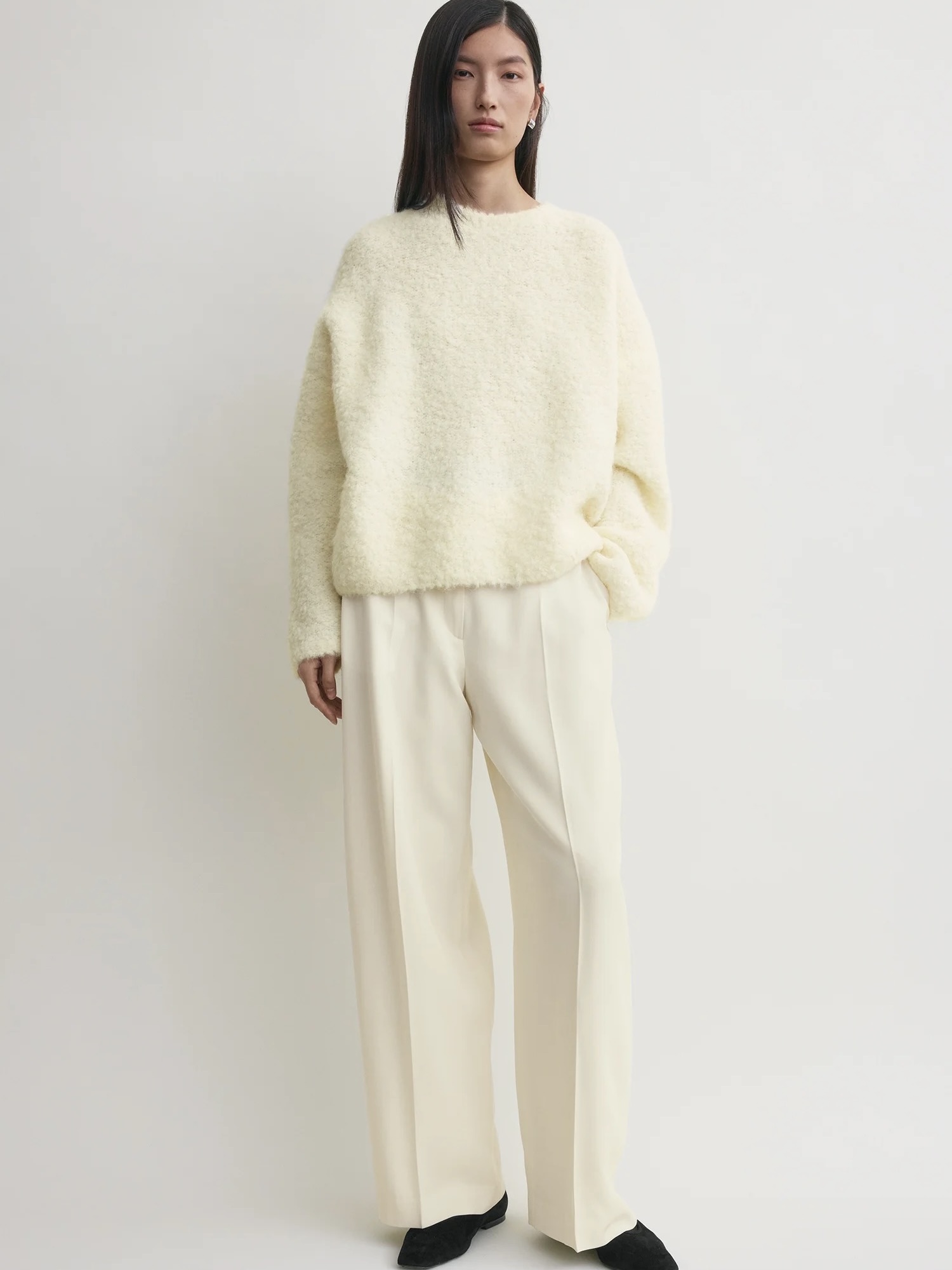 Signatur TOTEME-genser strikket i en luftig og krøllete bouclé av alpakkablanding med en myk teddytekstur. Den har en dramatisk firkantet silhuett med overdimensjonerte proporsjoner og ekstra lange ermer.