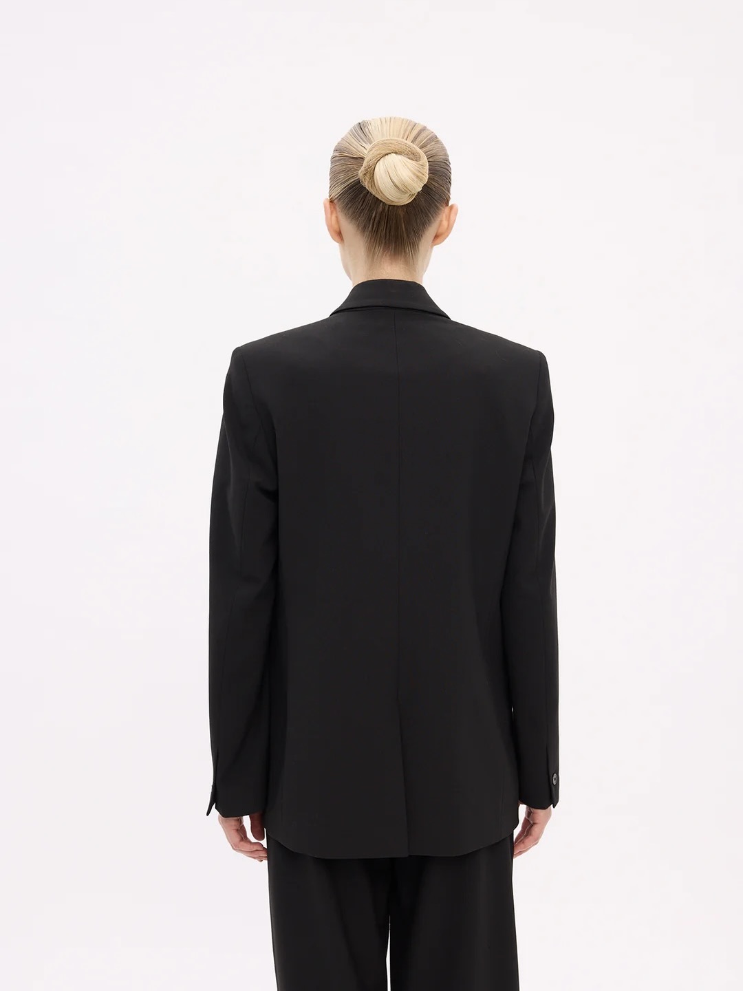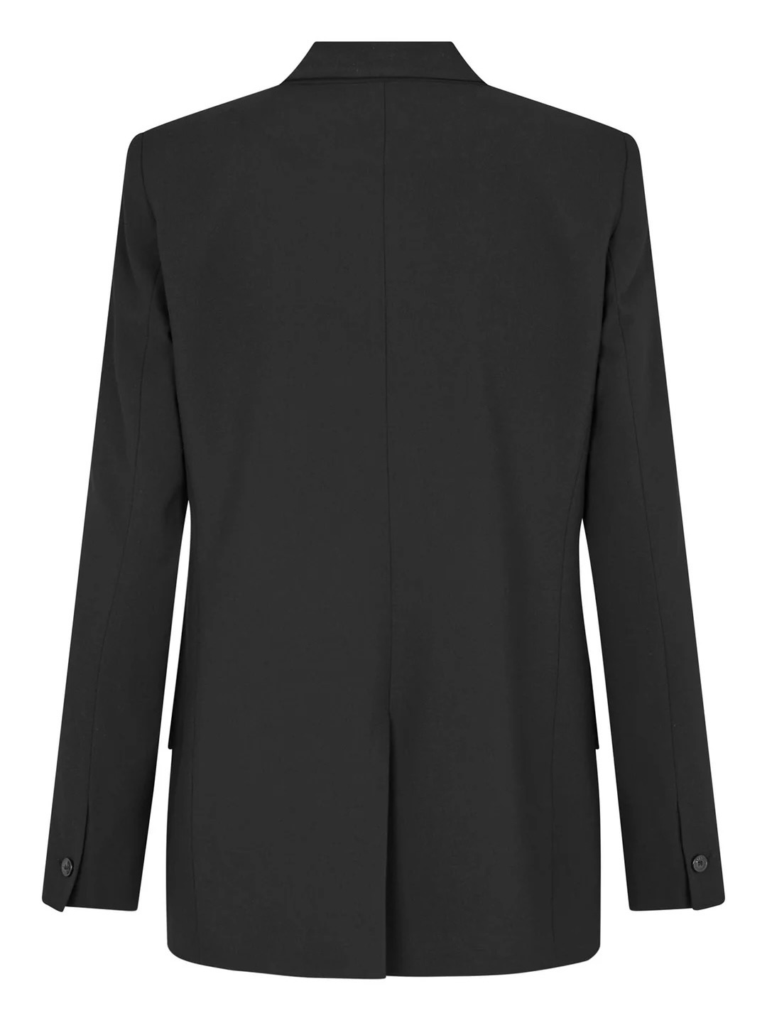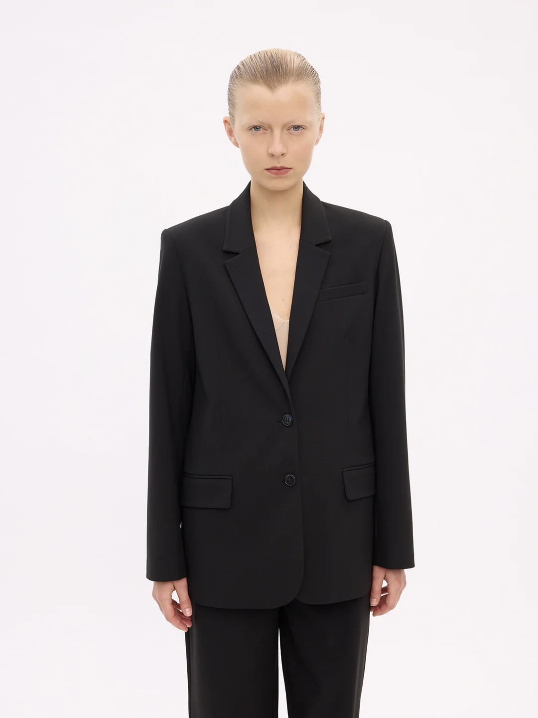 HannahFV har en rett, enkeltspent silhuett og en myk, skulpturell stil med minimale detaljer som logoknapper, et hakket slag, en funksjonell brystlomme og lommer med klaff foran. Sidespalter og myke skulderputer rammer inn kroppen, mens en splitt bak sikrer bevegelsesfrihet.