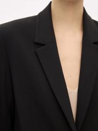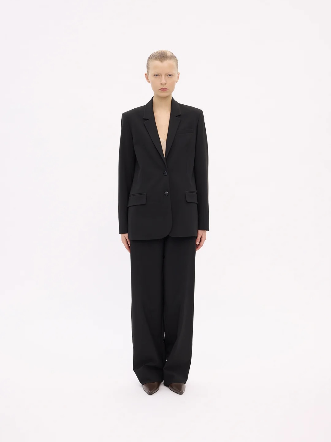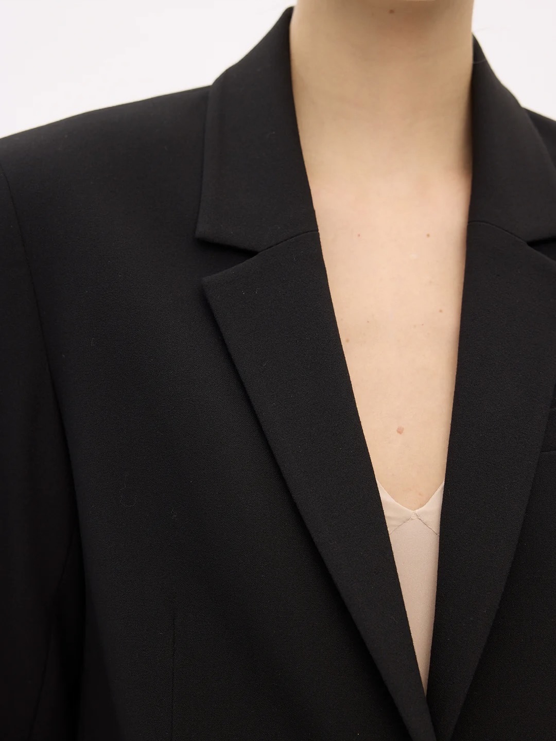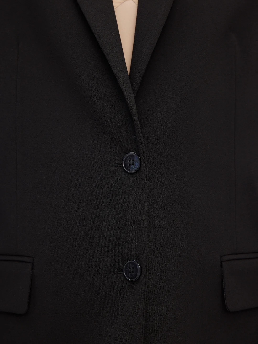 HannahFV har en rett, enkeltspent silhuett og en myk, skulpturell stil med minimale detaljer som logoknapper, et hakket slag, en funksjonell brystlomme og lommer med klaff foran. Sidespalter og myke skulderputer rammer inn kroppen, mens en splitt bak sikrer bevegelsesfrihet.