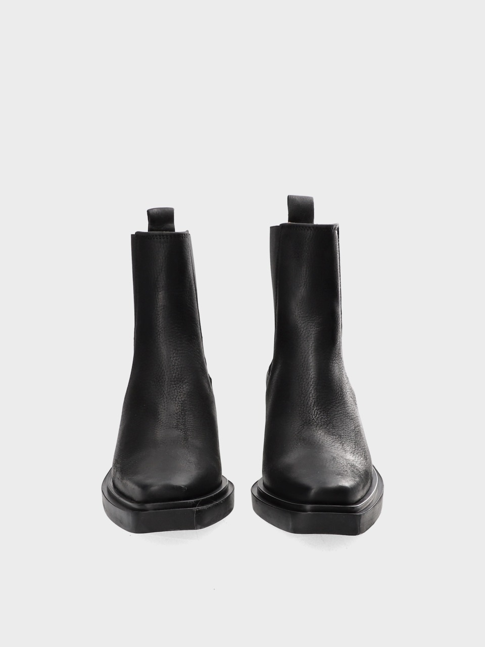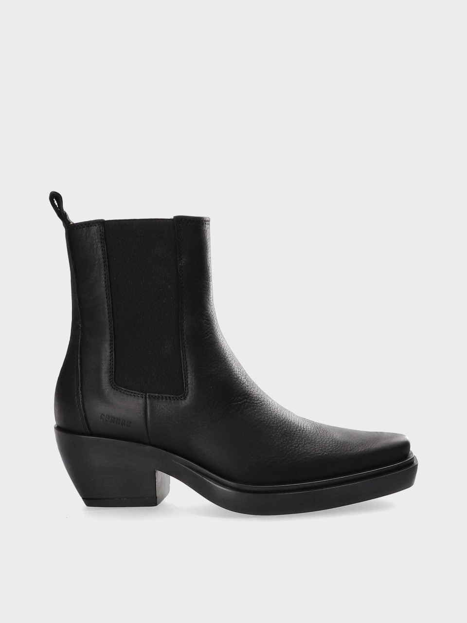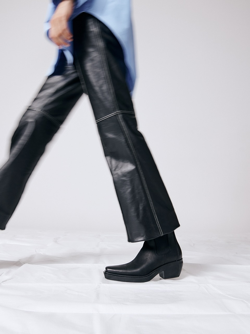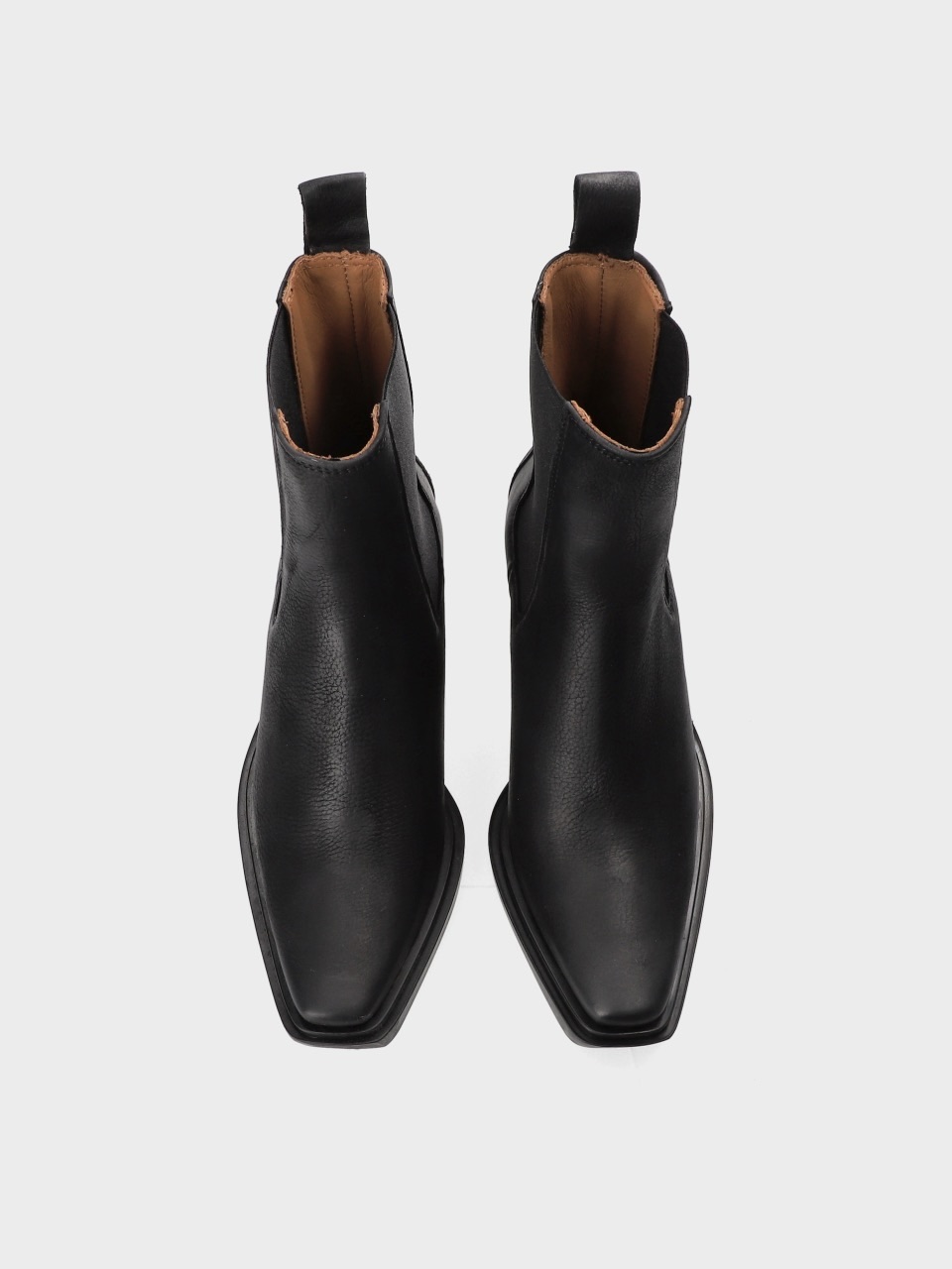 Chelsea-støvletter i vokset nubukskinn til mellomleggen. Texano-inspirert silhuett. Slankt skaft. Elastiske sidepaneler. Broderte detaljer. Logo på siden. Rektangulær, spiss tå. Trekkflik bak. Glatt gummisåle med skråstilt blokkhæl. Minimalistiske Texano-ankelstøvletter i et monokromatisk utseende.