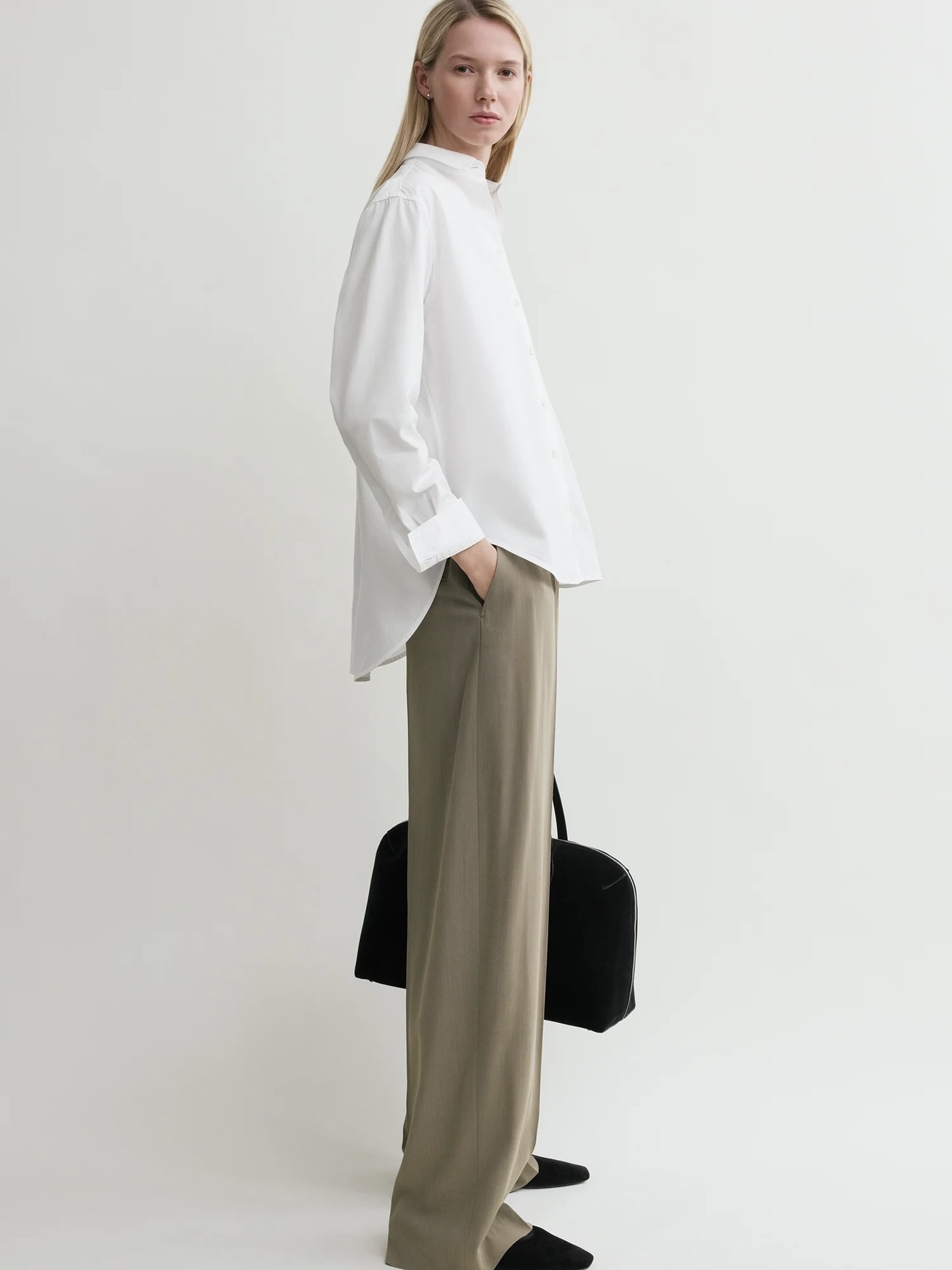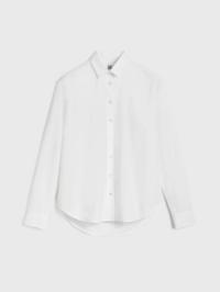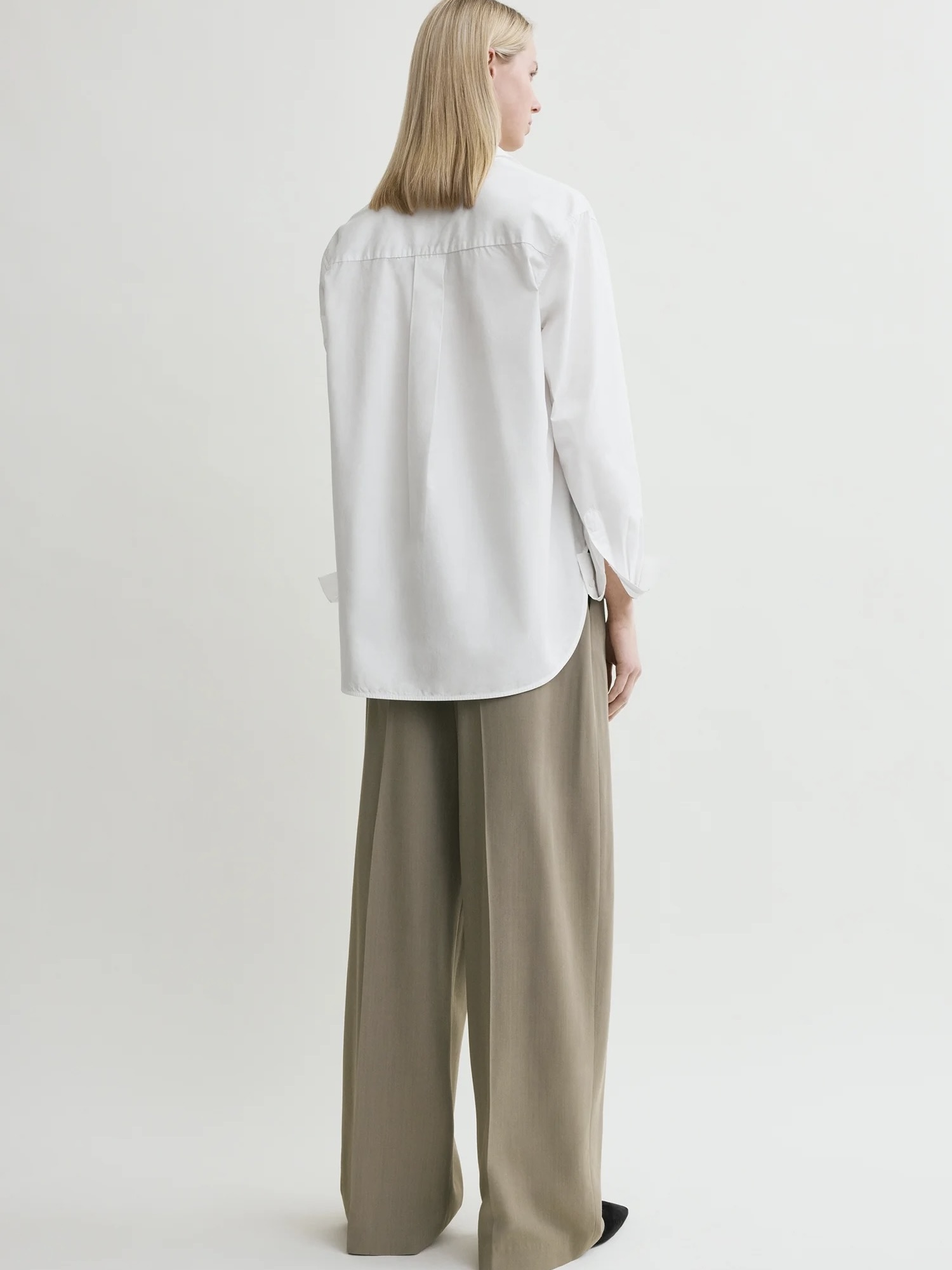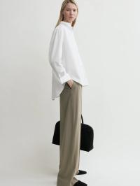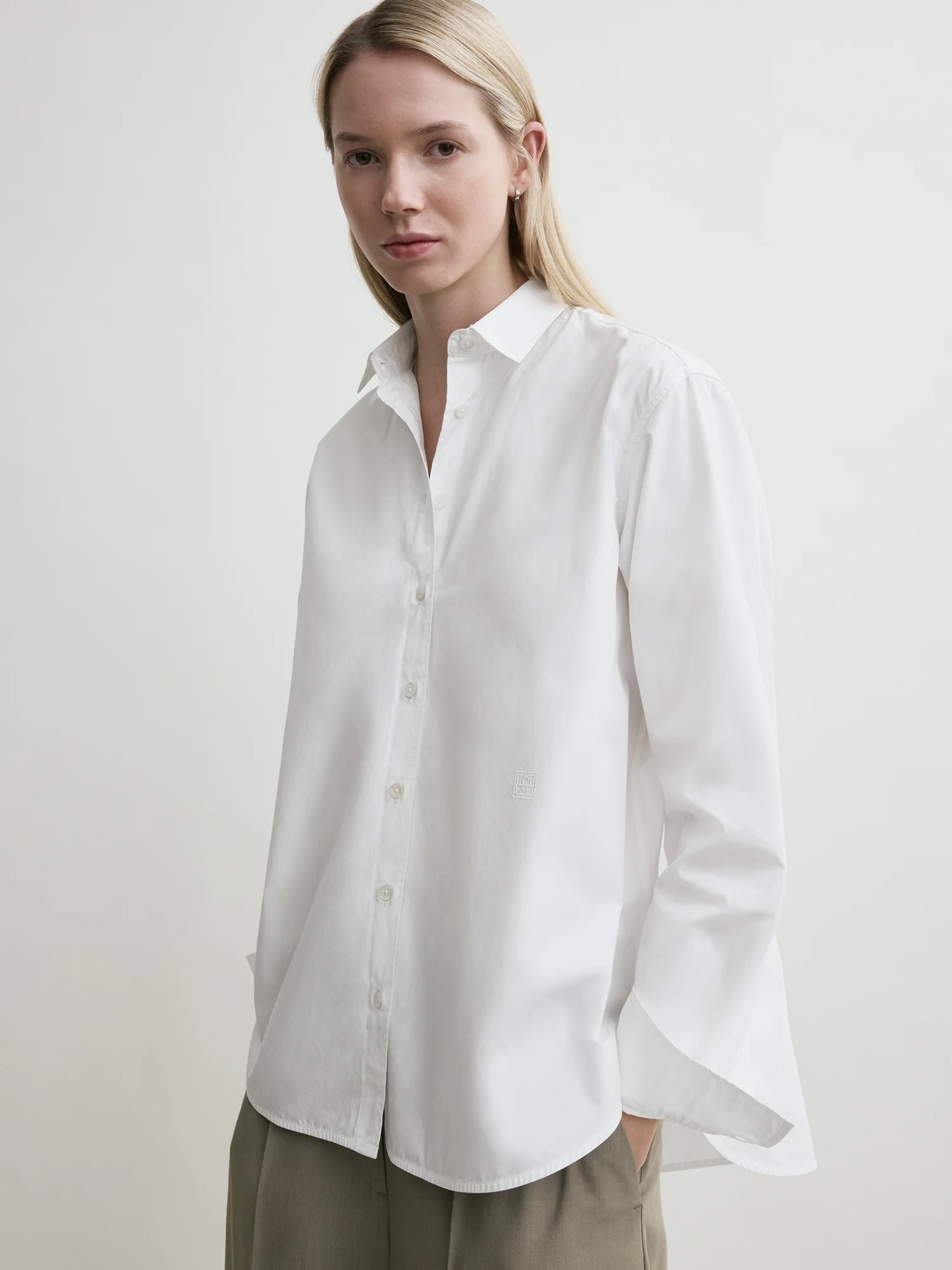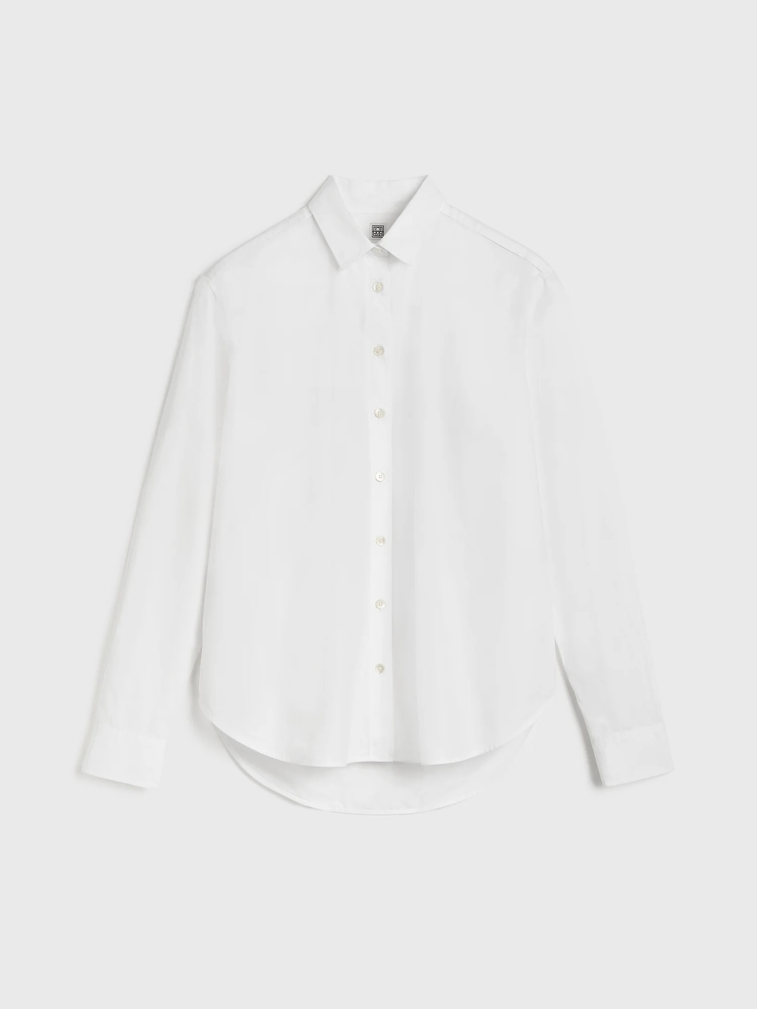 Signatur TOTEME-skjorte med en dyppet kant bak, noe som gir en elegant A-linjeformet profil. Den er laget i Portugal av sprø økologisk bomullspoplin og formet til en vid, overdimensjonert silhuett med perlemorknapper ved stolpe og mansjetter og et brodert monogram foran.