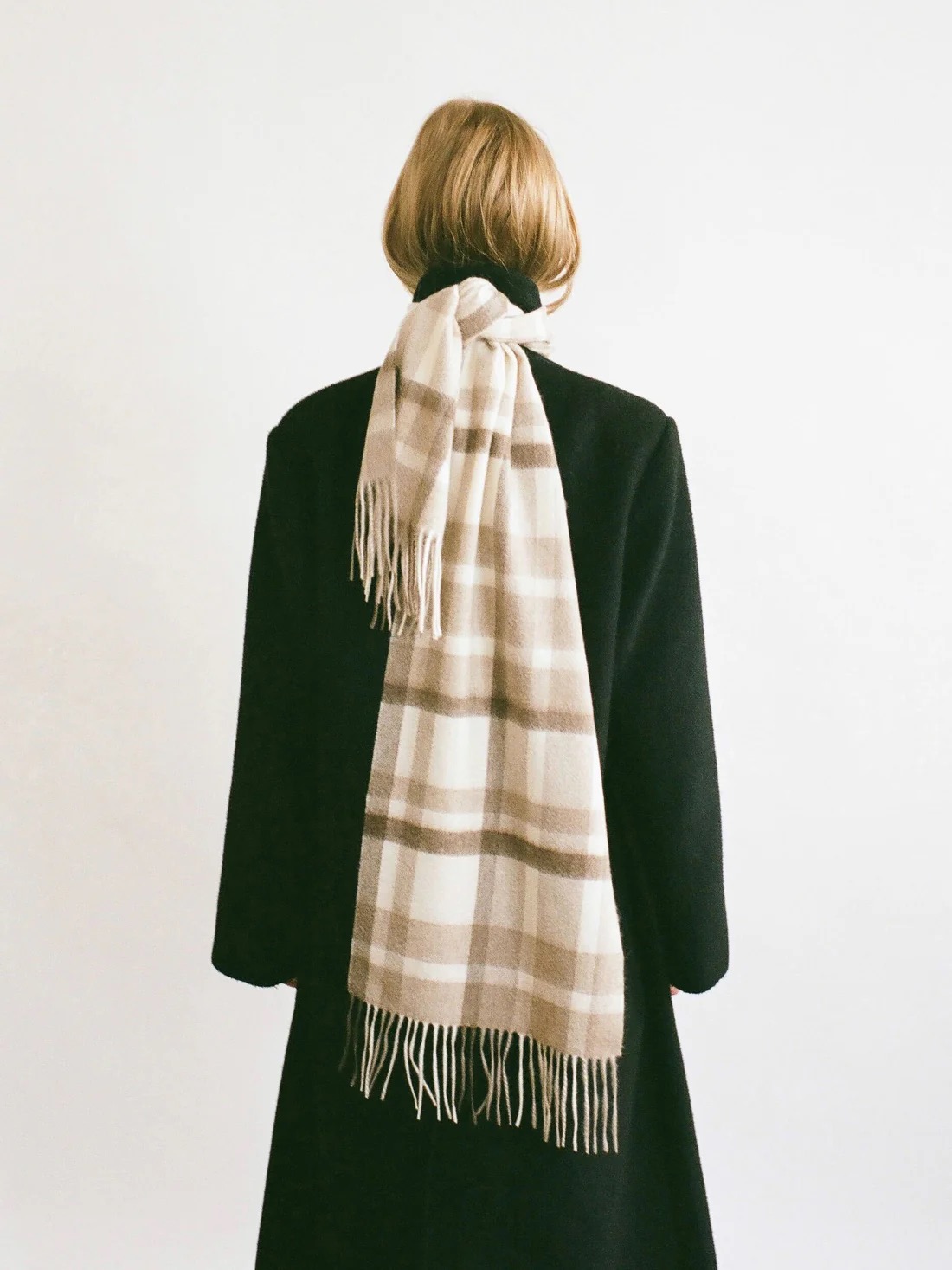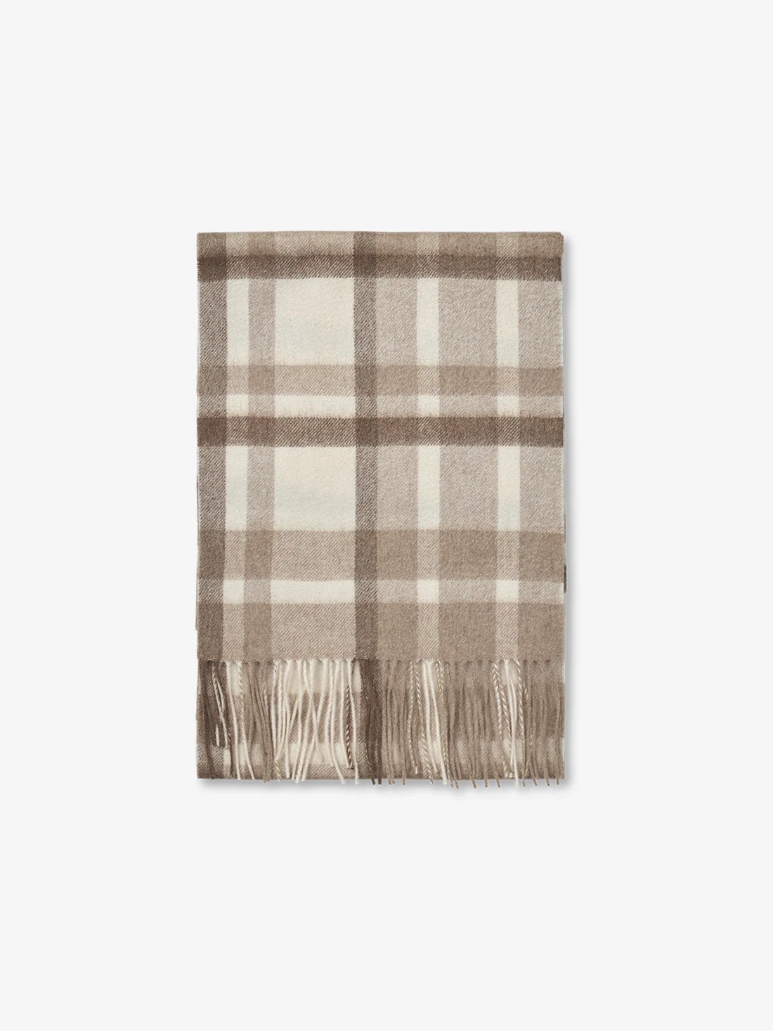 Cashmere Woven Scarf i checked sand er laget av 100 % premium kasjmir, og er luksuriøst mykt, lett og skånsomt mot huden. Den glatte, litt skinnende overflaten sikrer varig komfort og holdbarhet sesong etter sesong. Med frynser i endene passer dette skjerfet vakkert til ethvert antrekk og gir et subtilt og sofistikert preg. Den allsidige formen gir en rekke stylingalternativer, enten det draperes uanstrengt over skuldrene, pakkes tett rundt halsen eller brukes lagvis med yttertøy for ekstra varme.