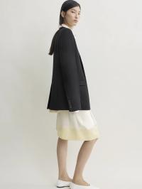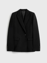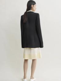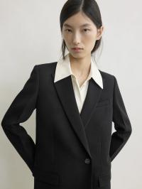 Blazer som blander skarpe skredderkoder og retningsbestemte proporsjoner. Laget av smidig viskoseull, har den en tettsittende silhuett fra livet og ned, med sterk skulderdefinisjon, pressede ermer og vinklede smale slag.