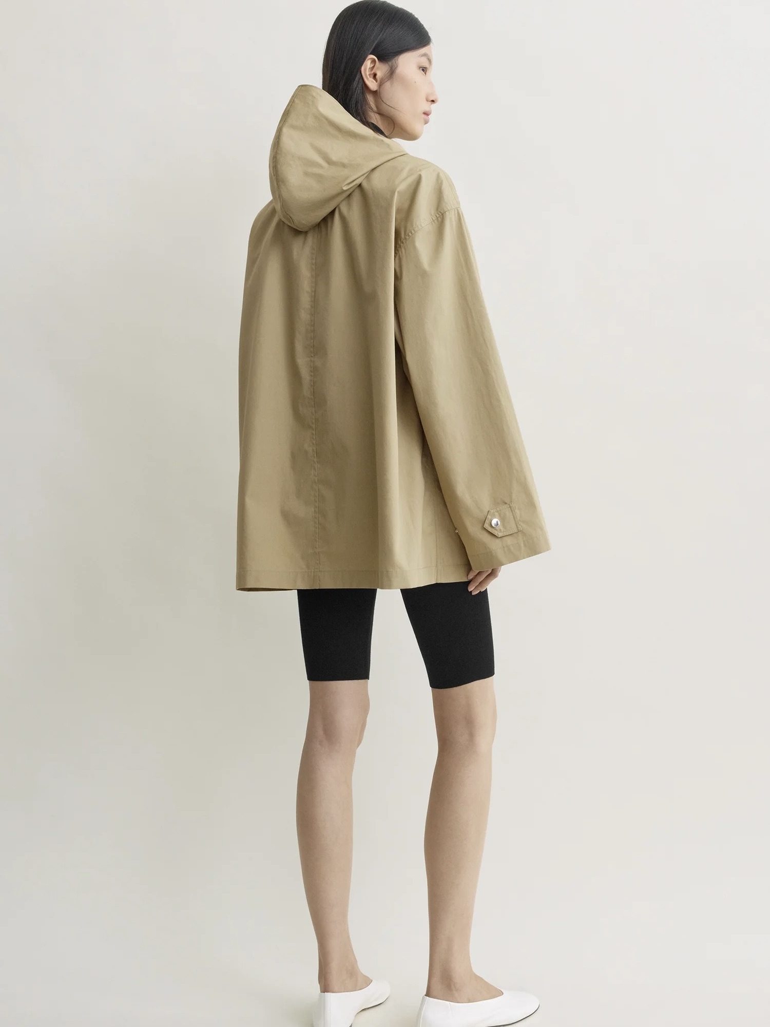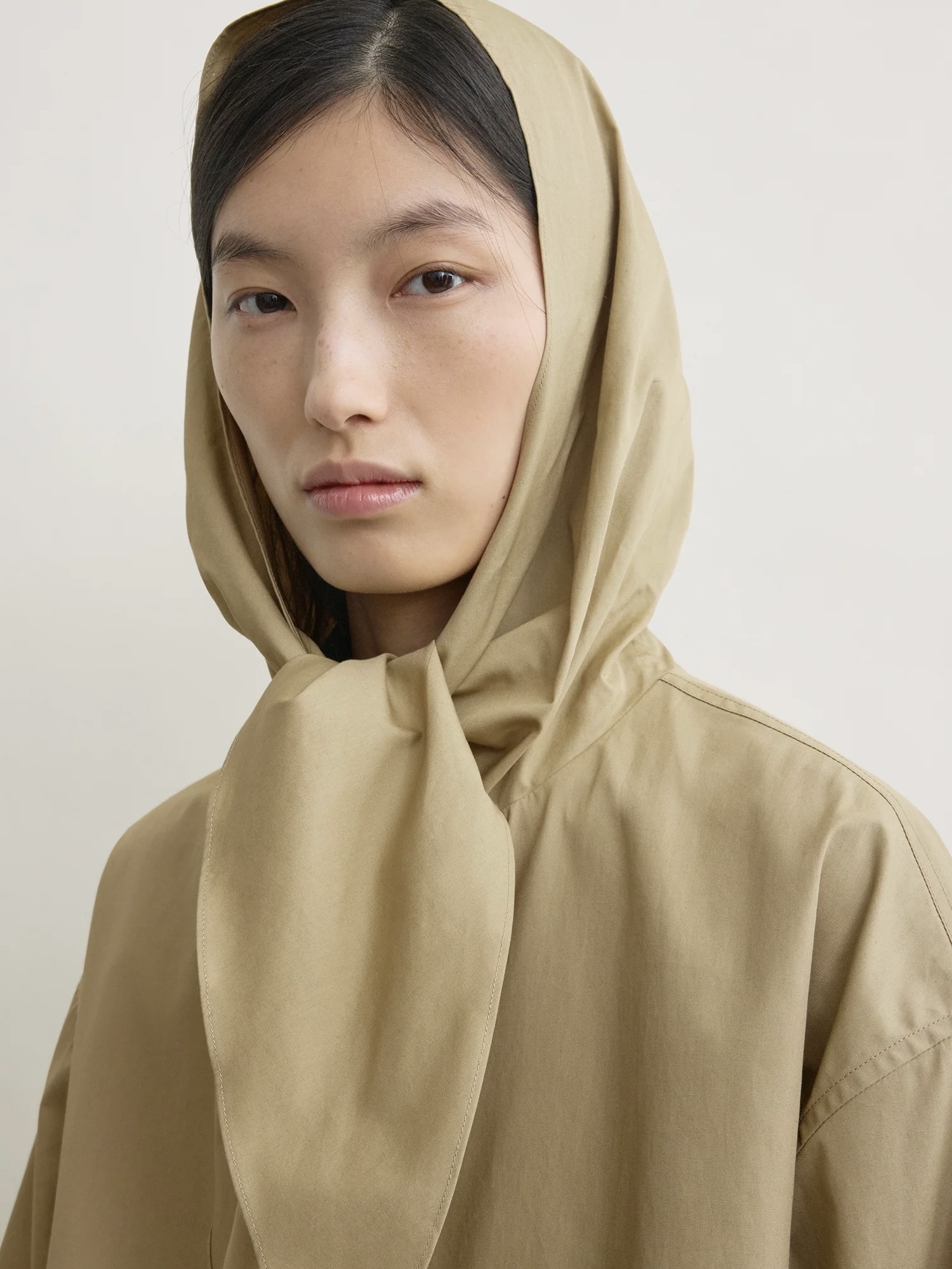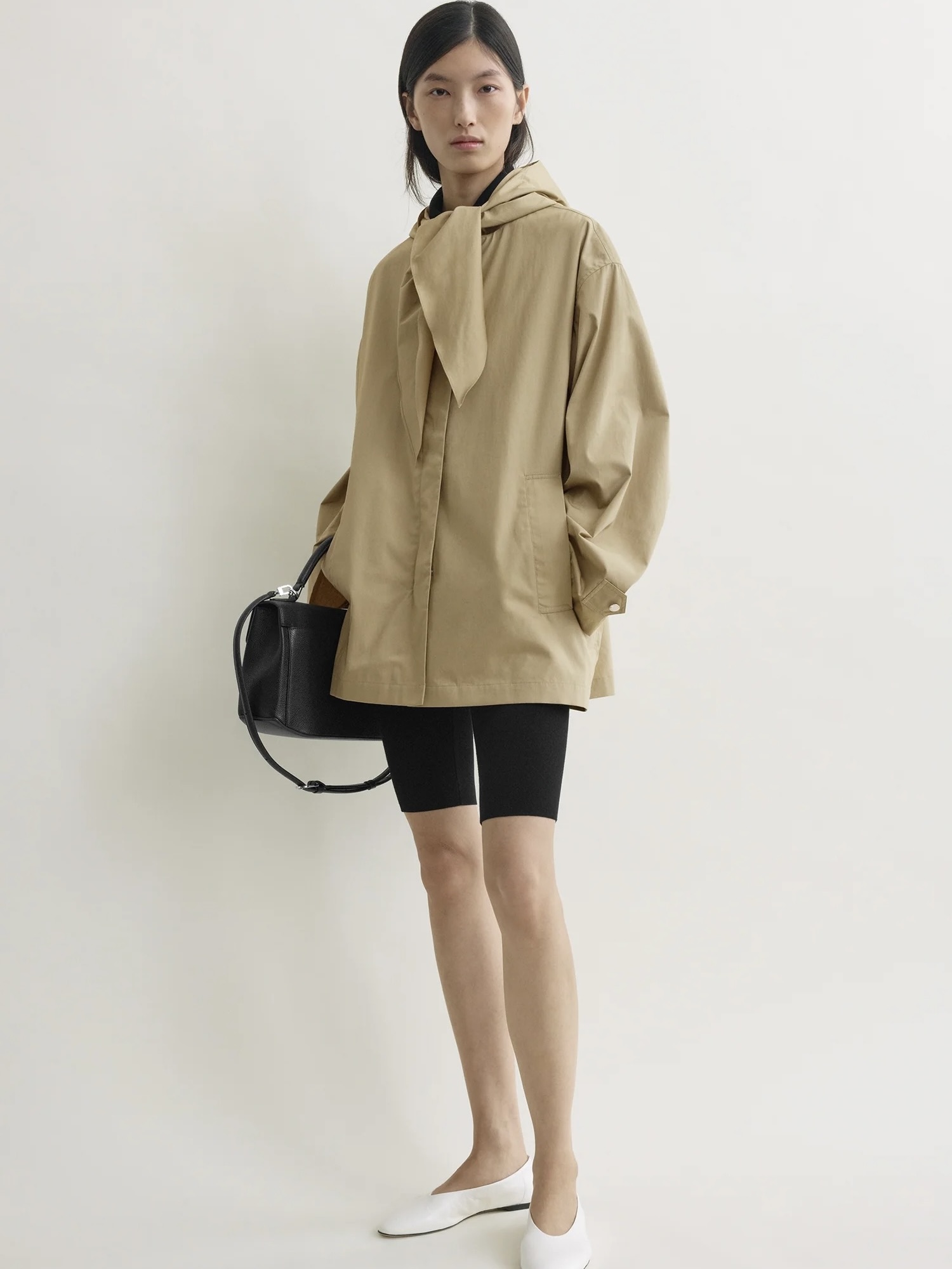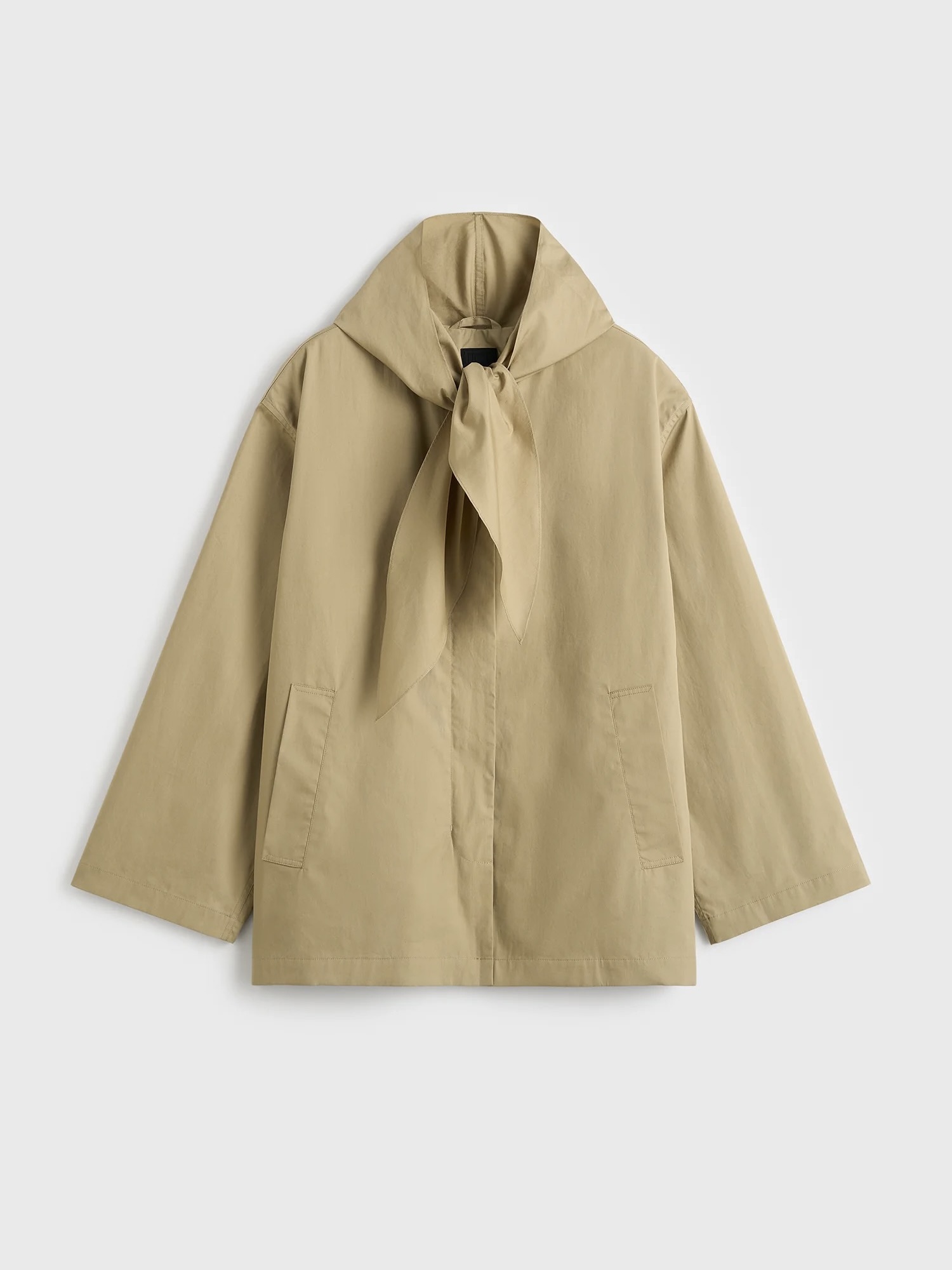 Teknisk variant av TOTEME sin signaturskjerfjakke, med hette med skjerfknytedetaljer. Den er laget av lett, værbestandig stoff i en firkantet silhuett, og har justerbare ermeklaffer og knytebånd som festes rent i halsen for en klassisk, men likevel retningsbestemt finish.