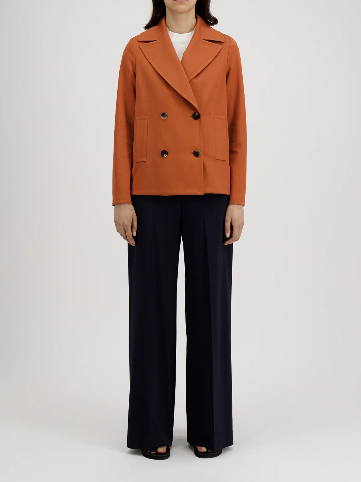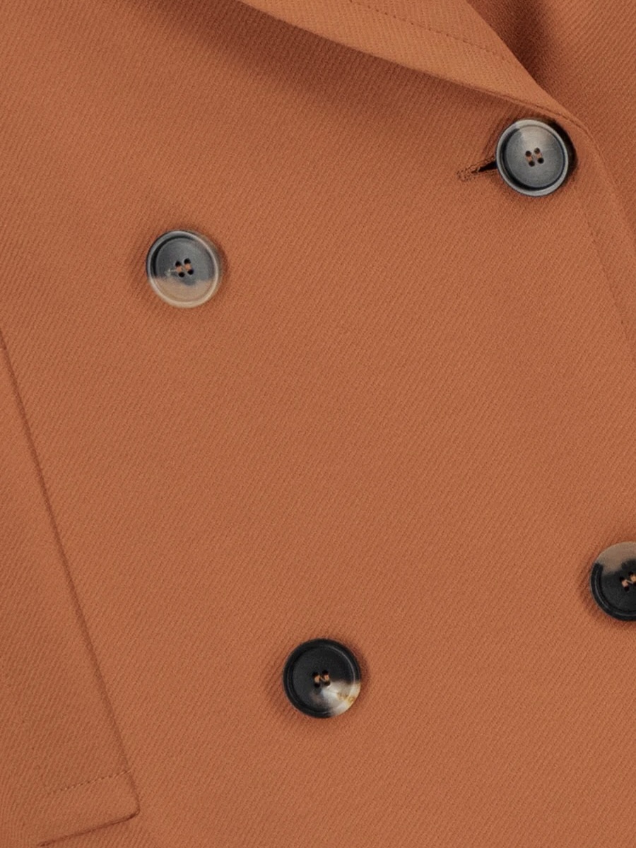 Peacoat, ufôret i strikket diagonal twill laget med Loro Piana-stoff. Dobbeltspent kort jakke, A-linjeformet med tettsittende lange ermer med passpolerte lommer, klassisk krageform, bredt slag og fireknappslukking. Ren finish. Laget i Italia med italiensk stoff.
