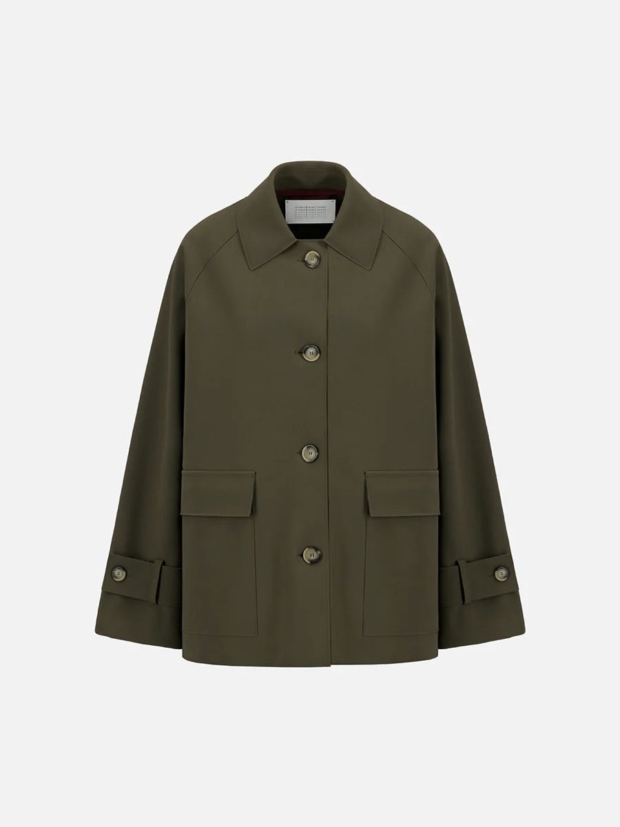 Overdimensjonert raglanjakke i strikket technic scuba. Enkeltspent lang jakke med vid, lang raglanerme med knappekrage med fire knapper og brede lommer med klaff. Rå kant. Laget i Italia med italiensk stoff.