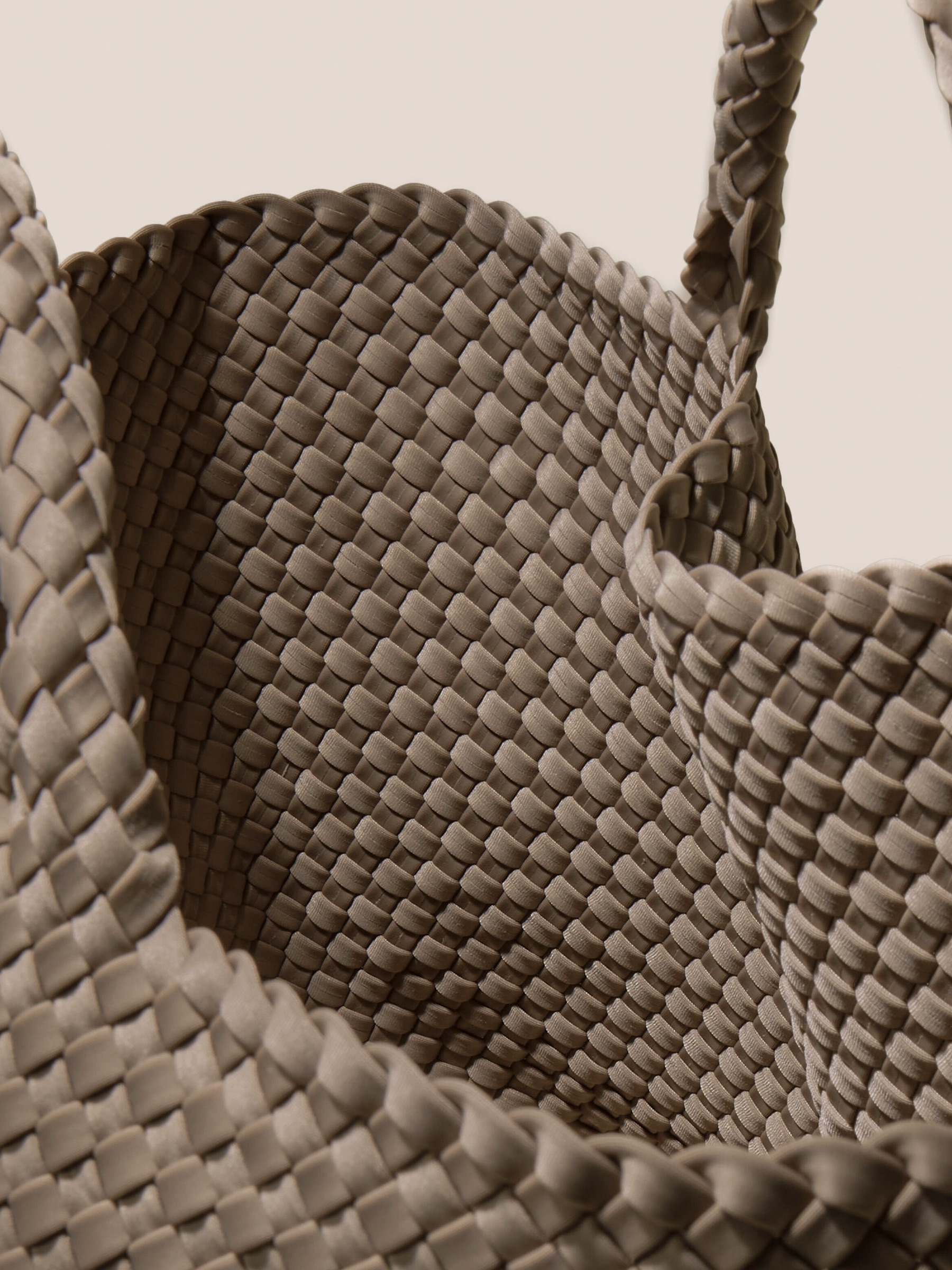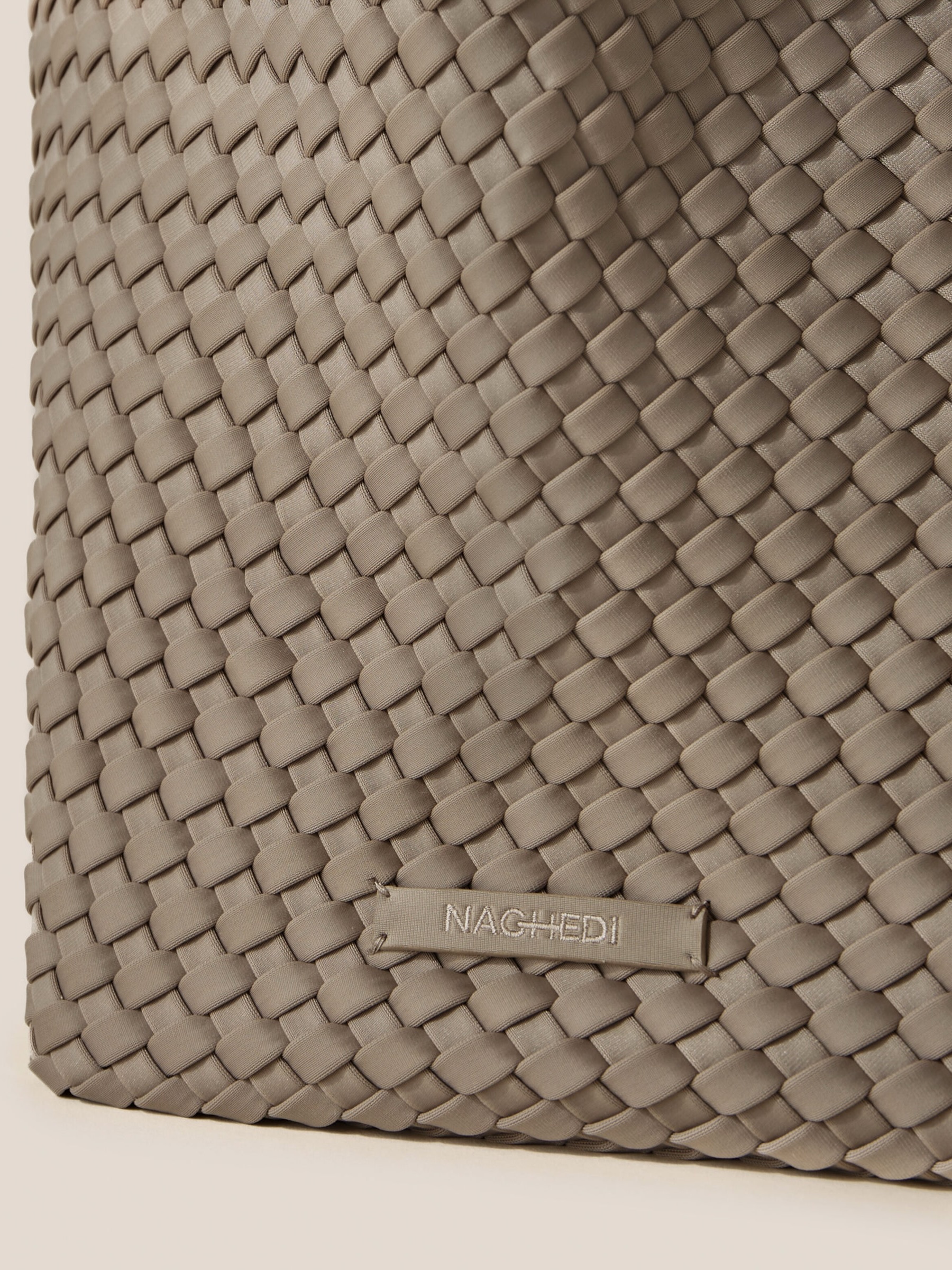 St. Barths Large Tote er håndvevd av Naghedi signaturneopren i taupe, og er en lett og allsidig stor toteveske – den ultimate bærevesken for jobb, reise eller stranddager. Denne vevde neopren-totevesken er romslig, men likevel myk i strukturen, og er designet for å romme alt du trenger, samtidig som den ser uanstrengt og elegant ut.
