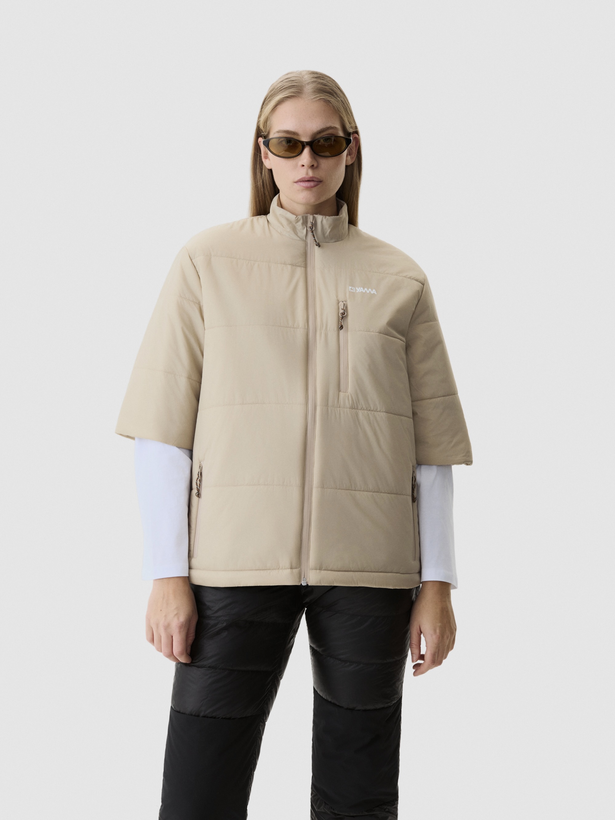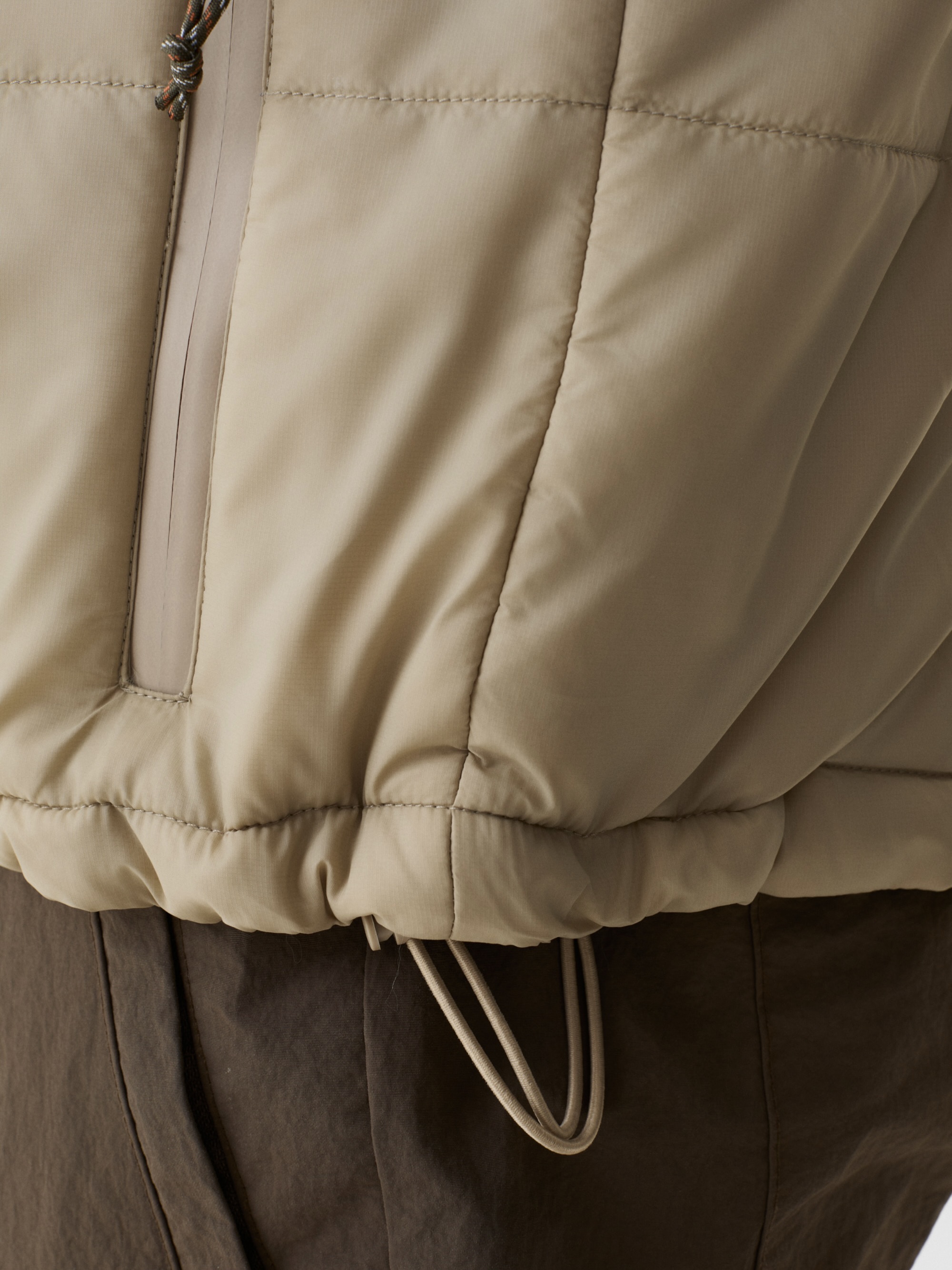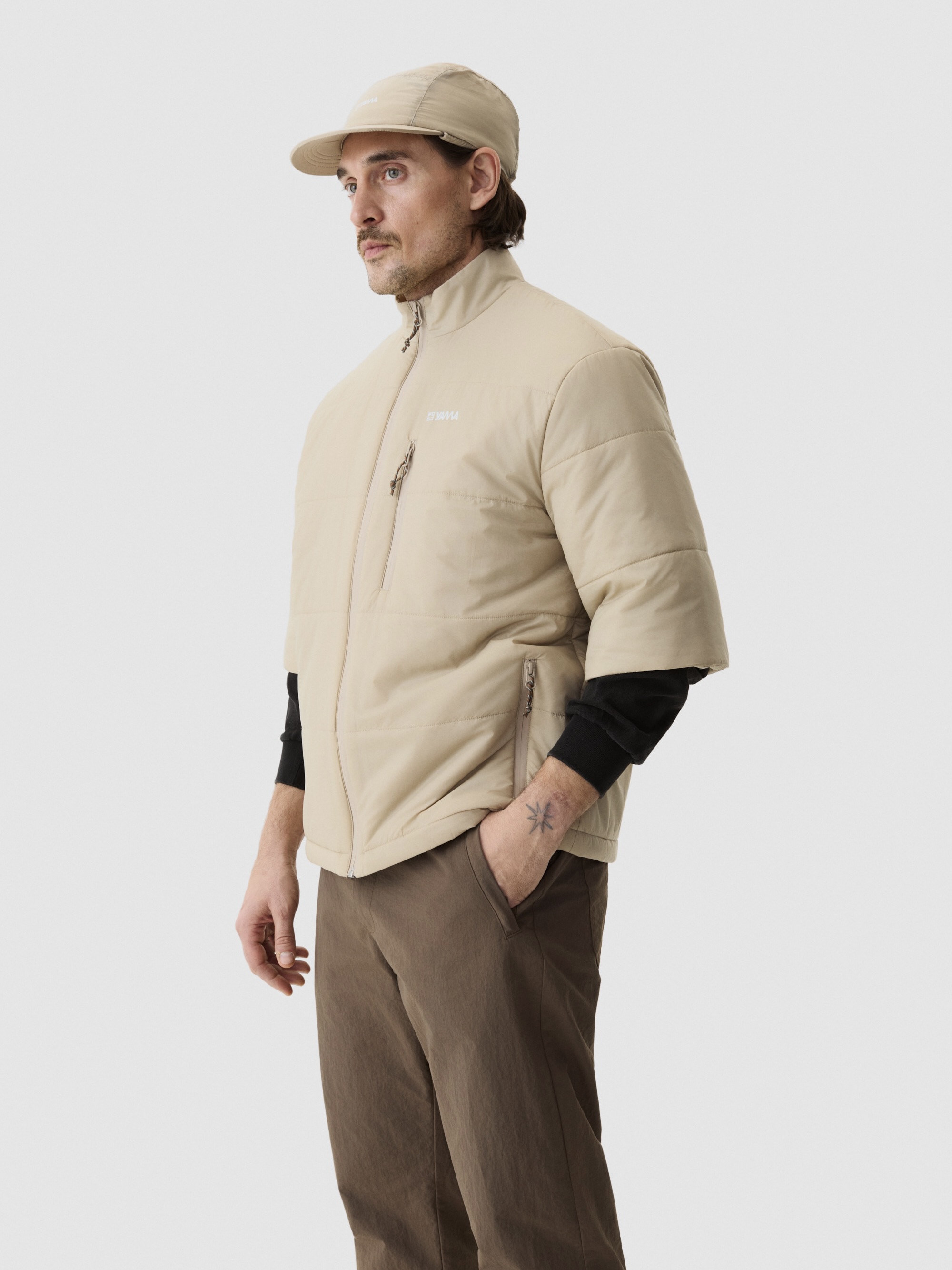 Horisontale pufferkanaler fordeler isolasjonen jevnt. Holder på varmen i fuktige forhold. Mikroripstop-skall blokkerer vind og vann. Korte ermer løser et lag-på-lag-problem – kjernevarme uten å være voluminøs ved håndleddene. Bruk over tekniske basislag eller merinoull. Stående krage. Tre lommer med glidelås. Justerbar kant holder været ute. Vanntette YKK-glidelåser. Quiltingen gir struktur og visuell tekstur samtidig som den opprettholder pakkbarheten. Et allsidig mellomlag for varierende vær. Laget for å tåle gjentatt bruk.