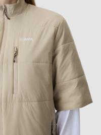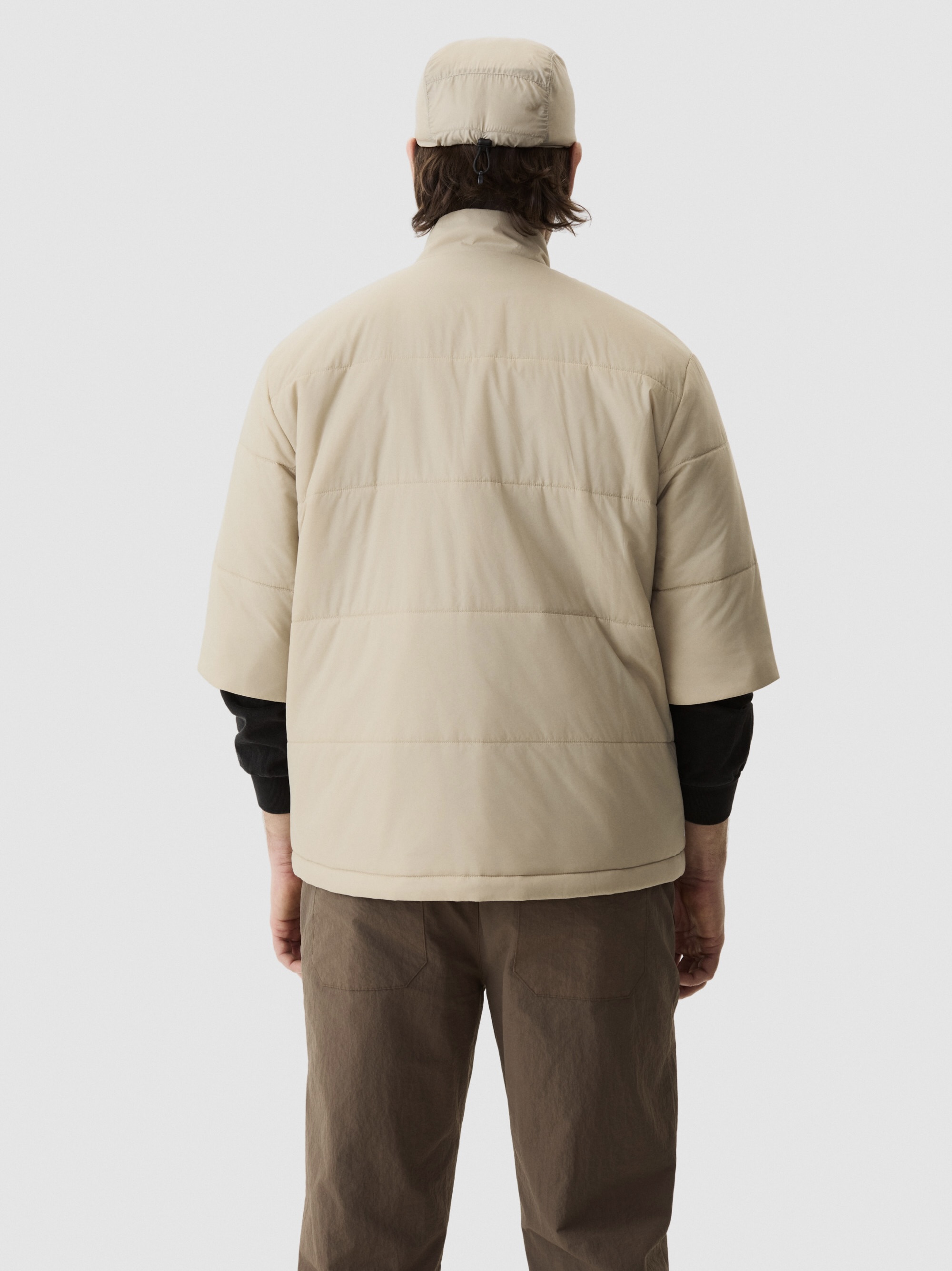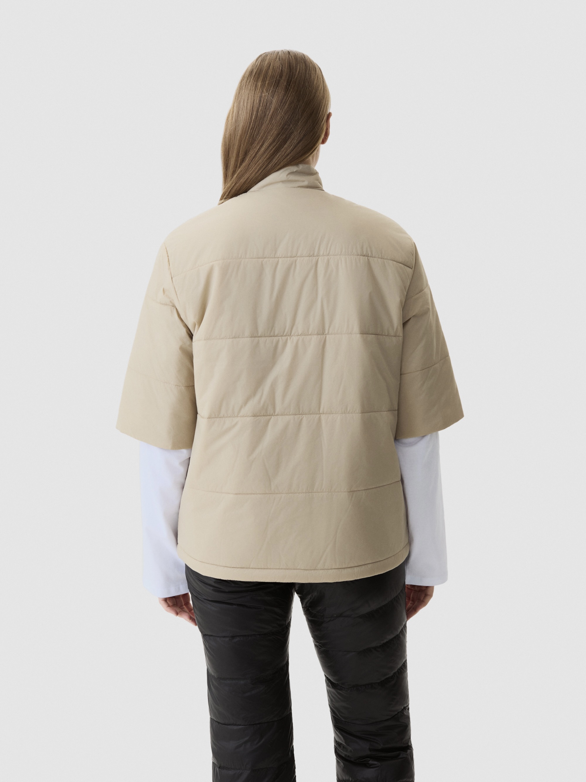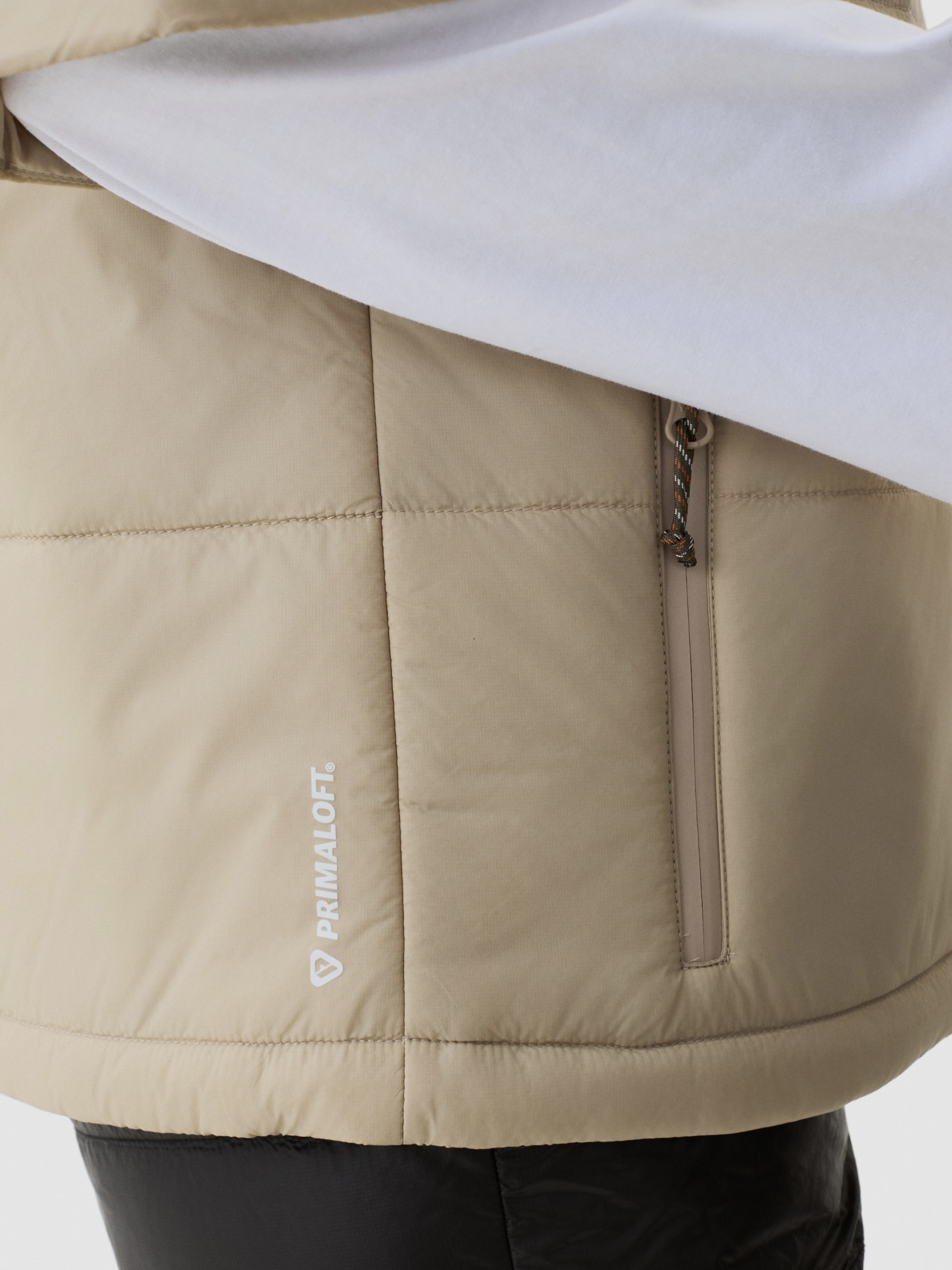 Isolerende varme med puffervolum. Korte ermer med horisontal quilting – 60 g PrimaLoft® fordelt for jevn varme. Stående krage holder kulde ute. Justerbar kant. Urban silhuett for kjølige til kalde forhold. Lag over lange ermer. Varme der du trenger det, bevegelse der du vil ha det.