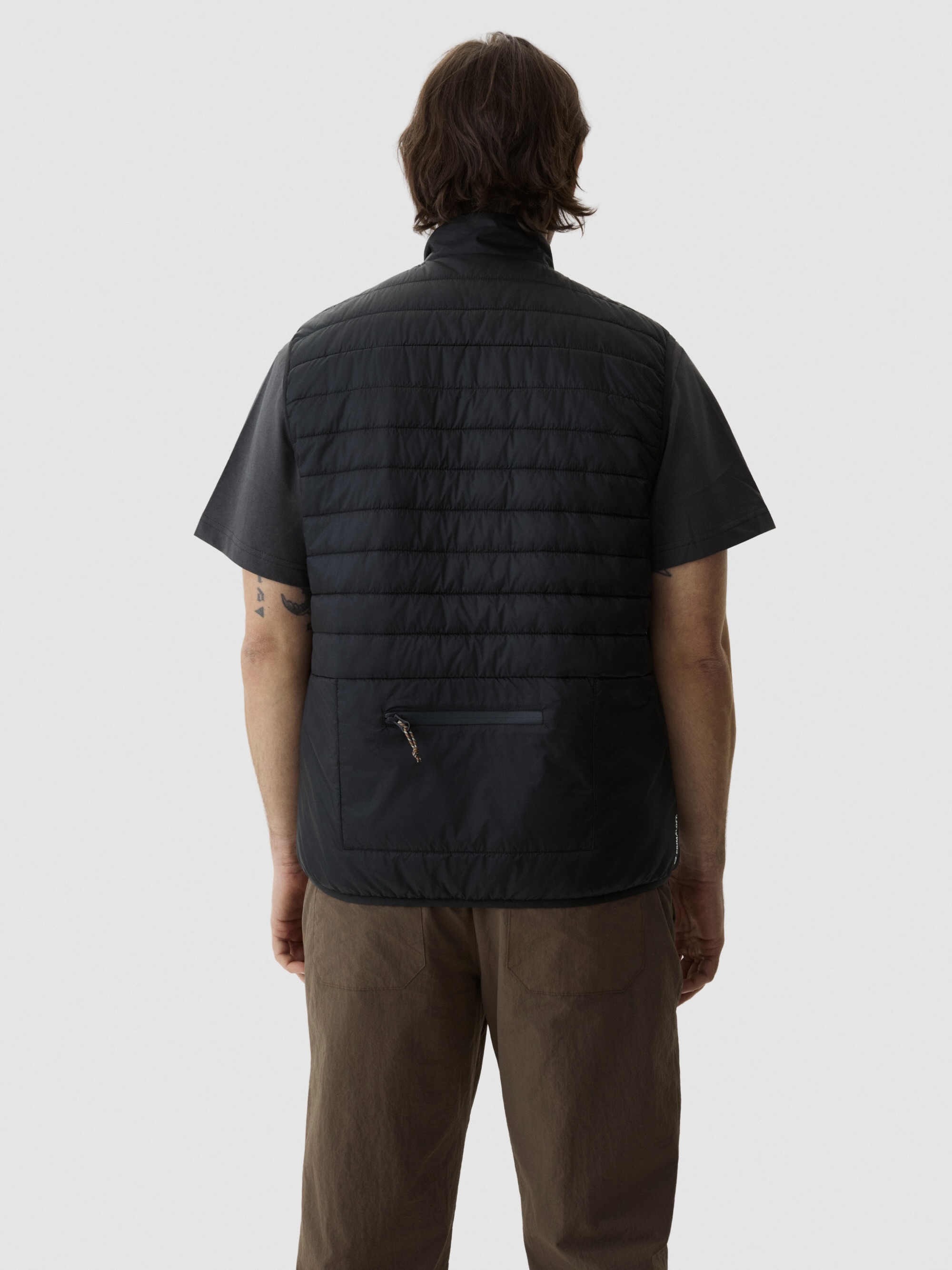 Horisontale pufferkanaler skaper struktur og varme. Opprettholder isolasjon under fuktige forhold. Mikroripstop-skall blokkerer vind og lett regn. Ermeløs design gir kjernevarme uten å begrense skuldre eller armer. Elastiske armbånd sikrer komfortabel og fleksibel passform. Bruk over tekniske skjorter eller strikkeplagg.
