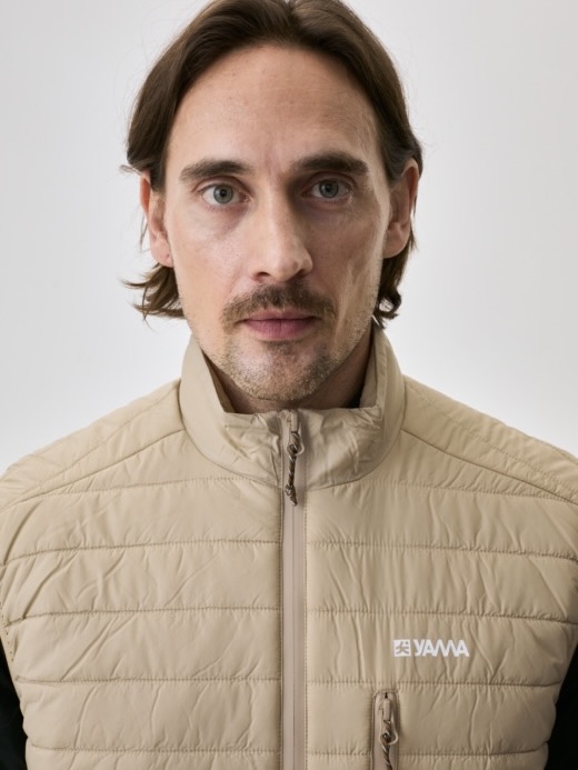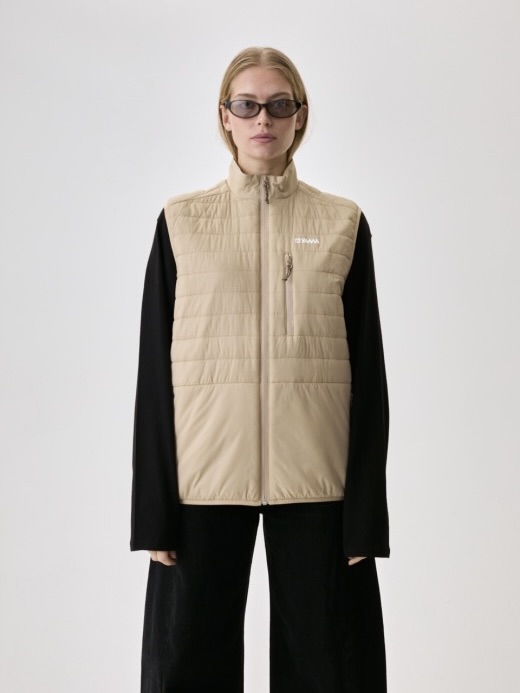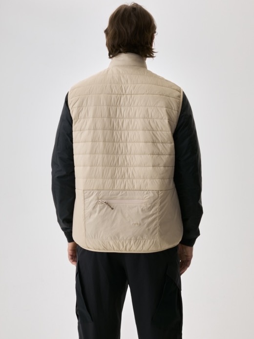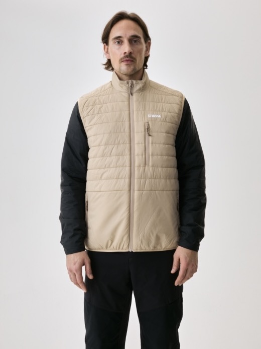 Horisontale pufferkanaler skaper struktur og varme. Opprettholder isolasjon under fuktige forhold. Mikroripstop-skall blokkerer vind og lett regn. Ermeløs design gir kjernevarme uten å begrense skuldre eller armer. Elastiske armbånd sikrer komfortabel og fleksibel passform. Bruk over tekniske skjorter eller strikkeplagg.