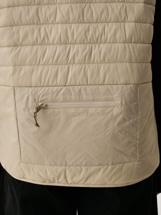 Avsmalnet silhuett – bredere ved brystet, smalere nederst. Ståkrage holder kulde ute. Fire glidelåslommer gir sikker oppbevaring. Vanntette YKK-glidelåser. Quiltingen gir visuell tekstur samtidig som den opprettholder pakkbarheten. Konstruert for holdbarhet. En vest designet for variable forhold.