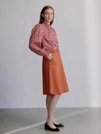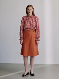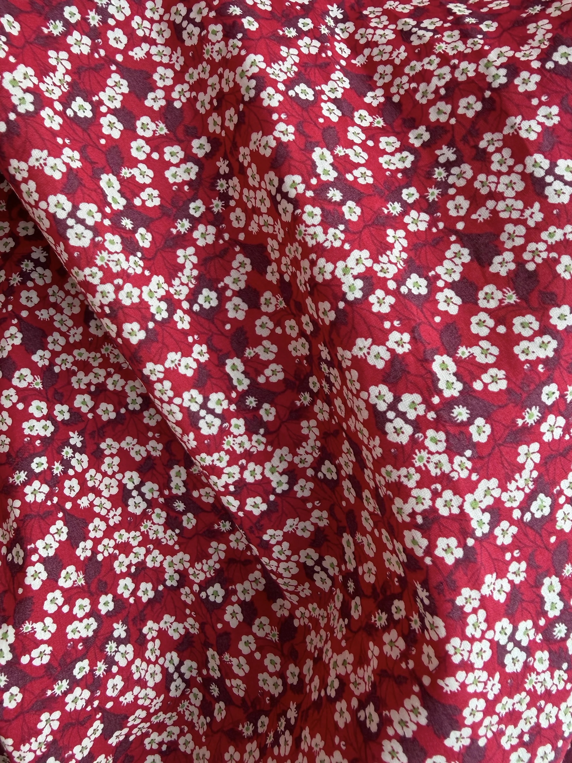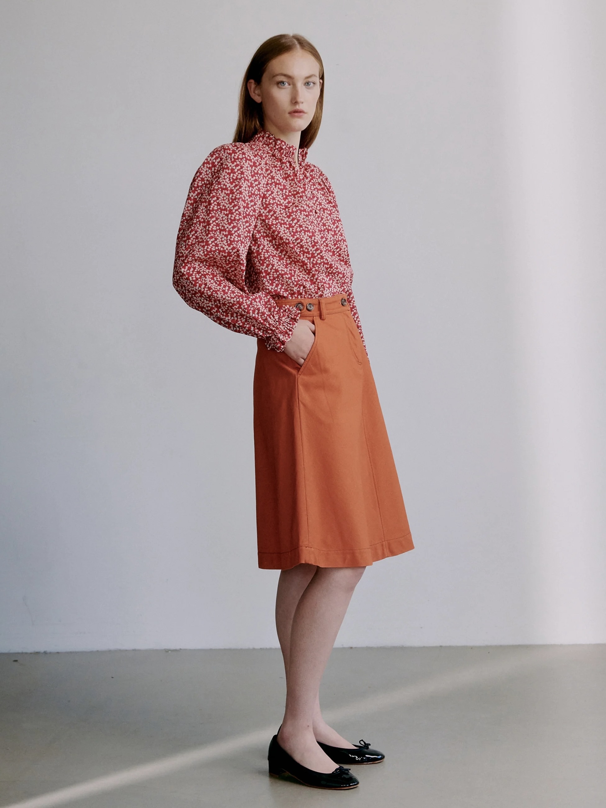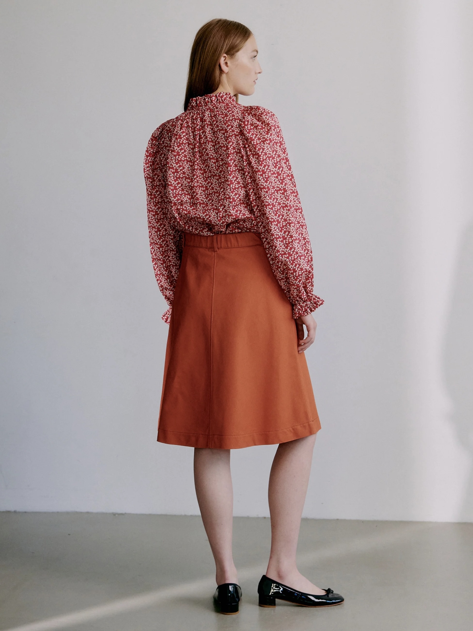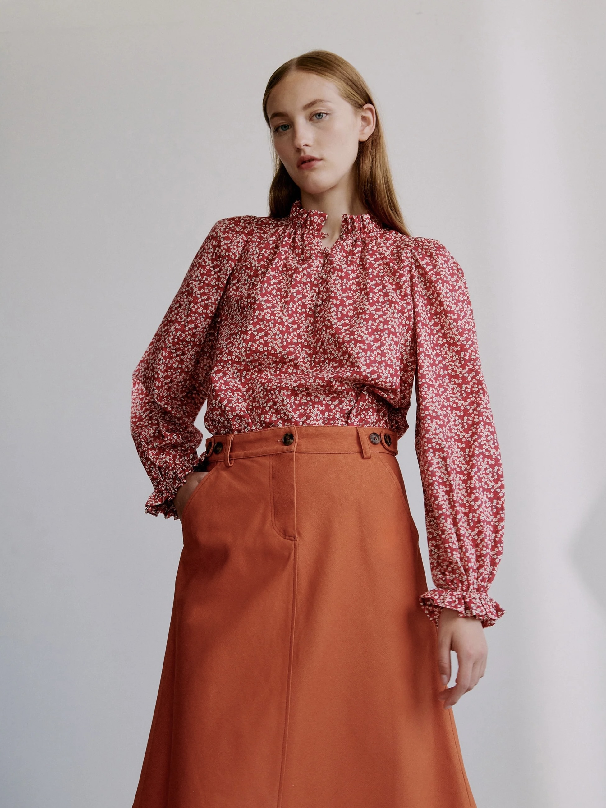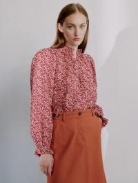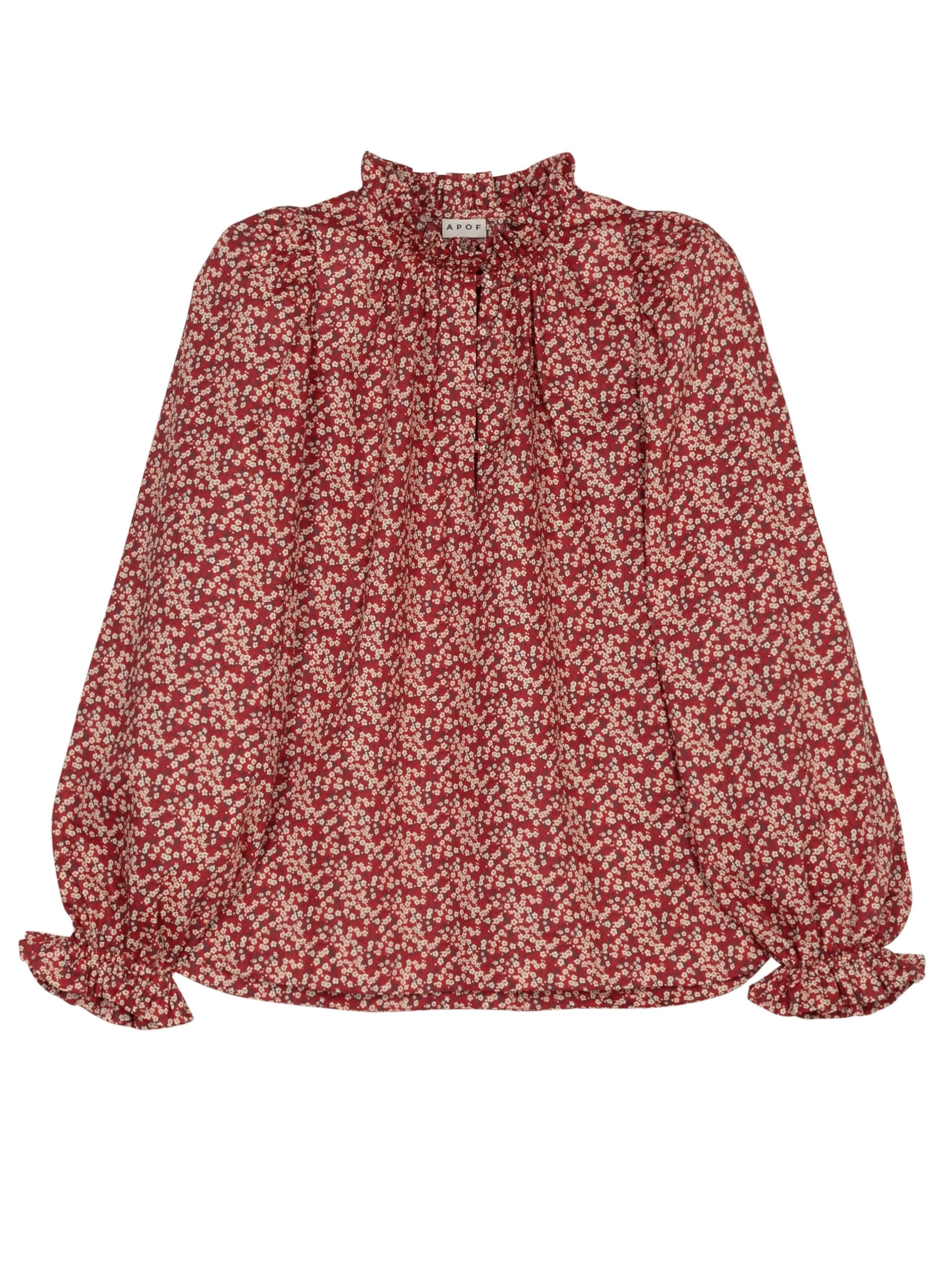 Annabella-blusen i Mitsi Valeria-trykk har en dyp rød base utsmykket med små hvite blomster. Rysjedetaljene ved halsen og mansjettene kombinert med en litt avslappet passform skaper en romantisk, men tidløs bluse.