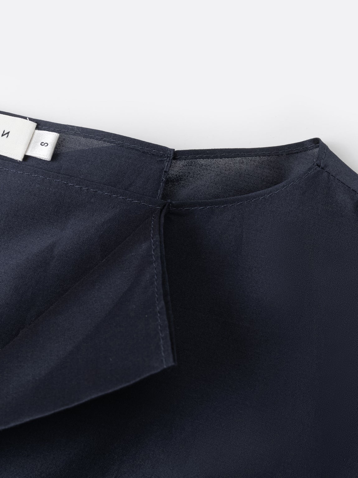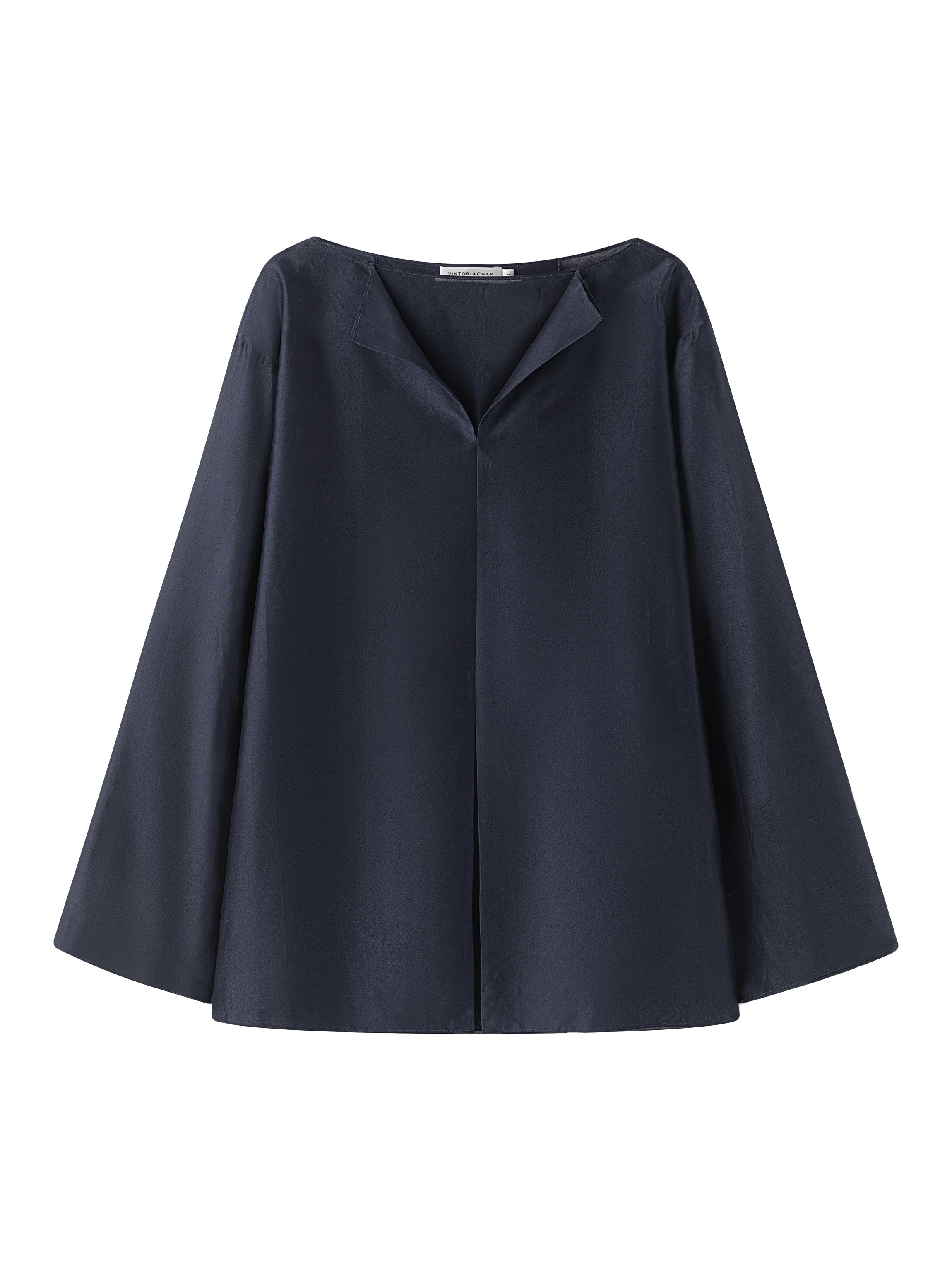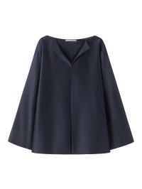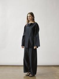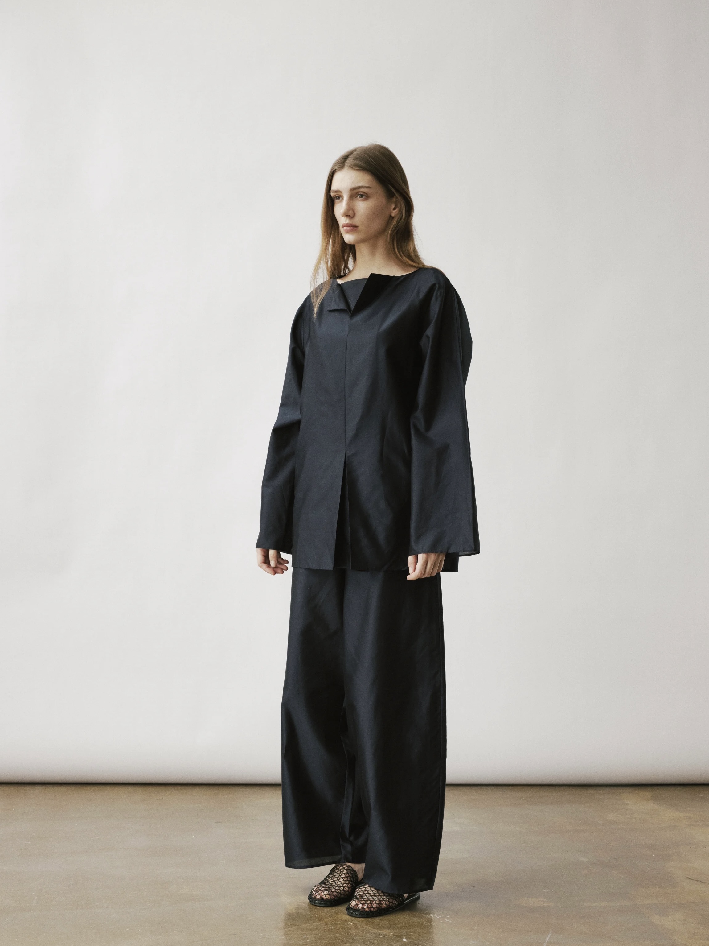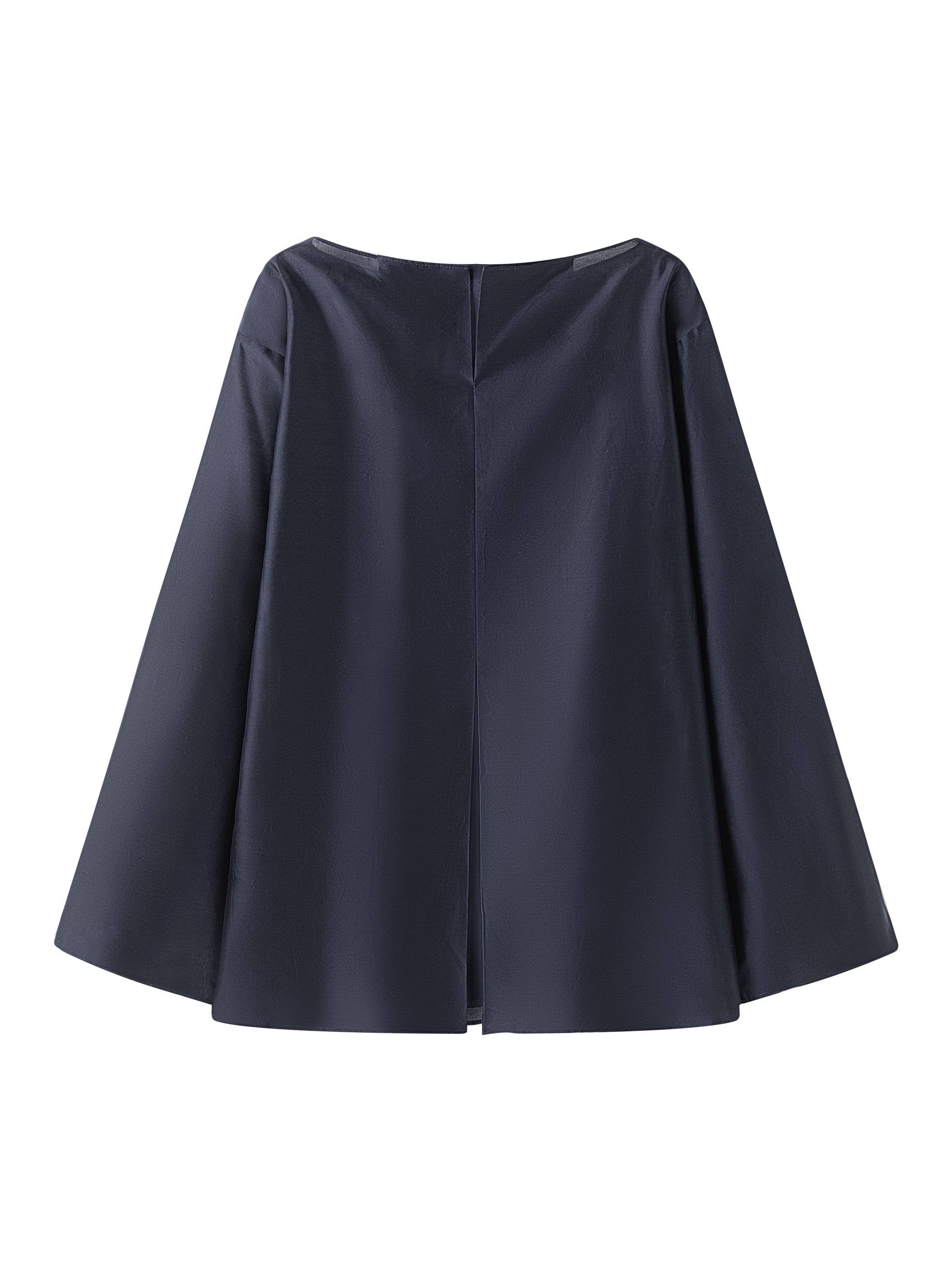 En oversized skjorte med en tykk, teksturert blanding av silke og bomull og en strukturert silhuett. Halsåpningen viser en åpning foran som avslører et indre lag med et fast stoff. En matchende splitt nederst gir skjorten balanse og bevegelse.