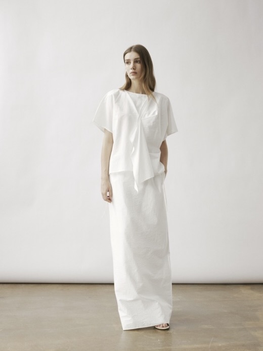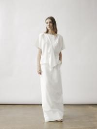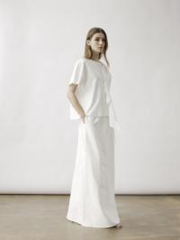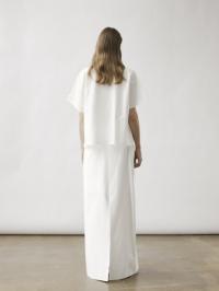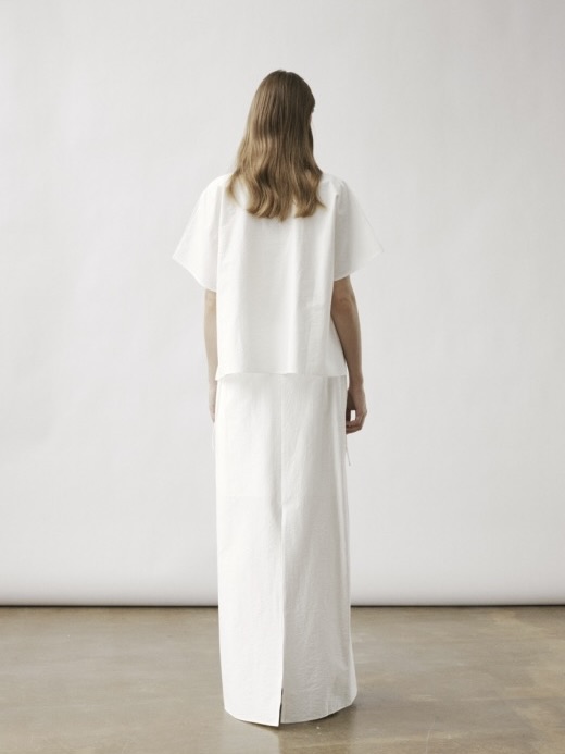 En oversized T-skjorte med vide, korte ermer og en dristig, stor, brettet detalj foran. Denne dramatiske folden strekker seg nedover til en lang legg, noe som gir et skulpturelt element til den avslappede passformen.