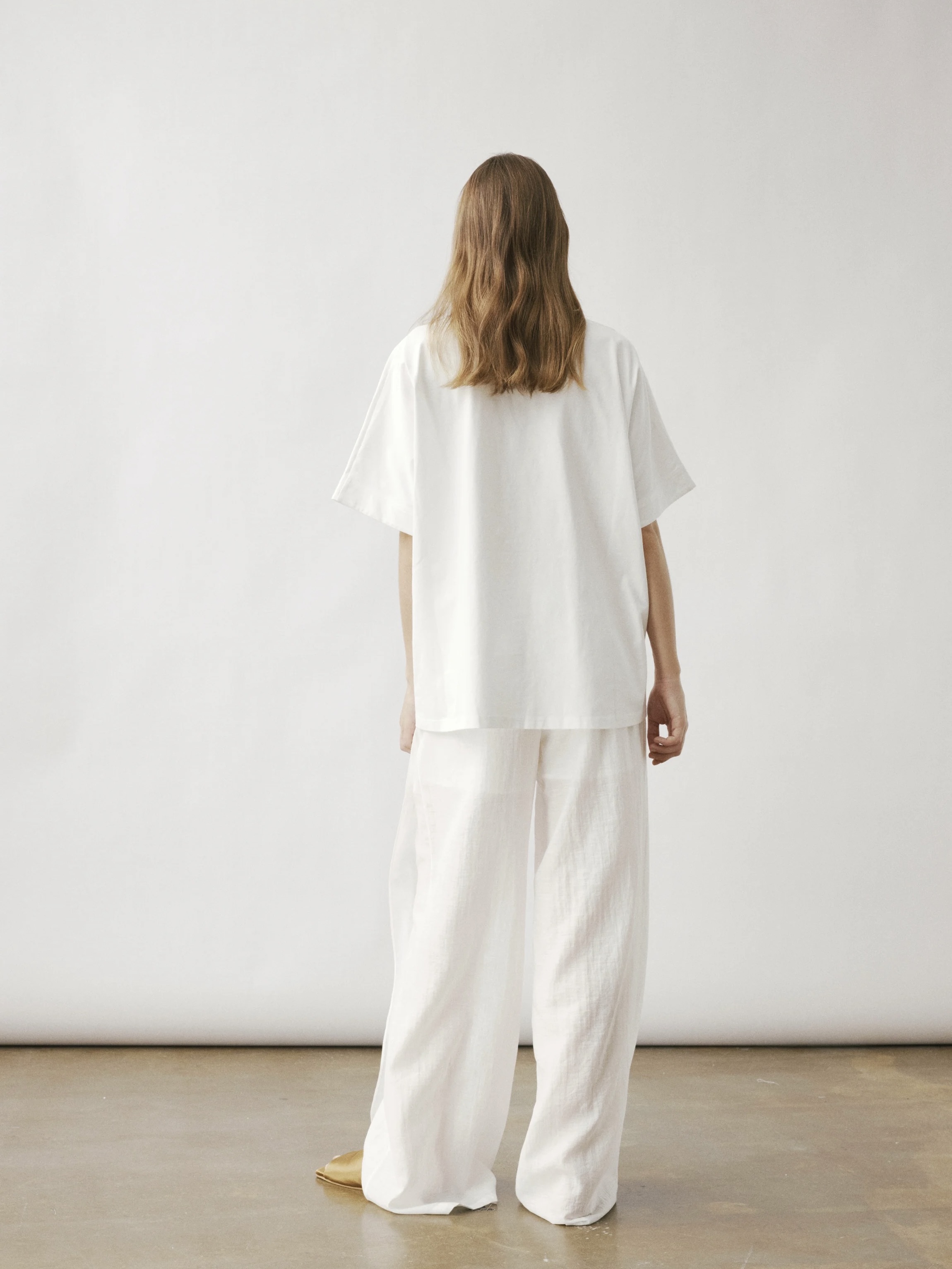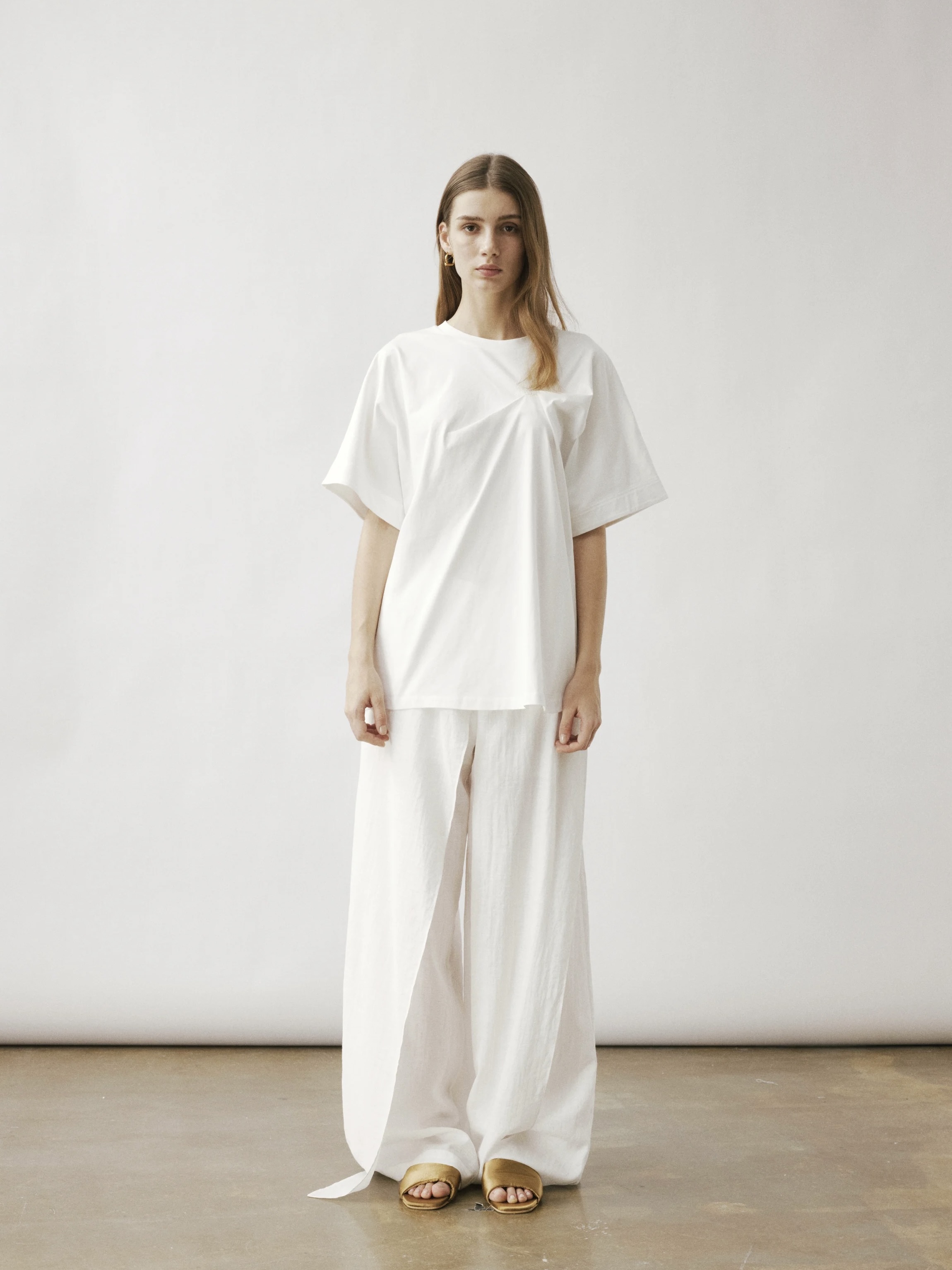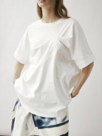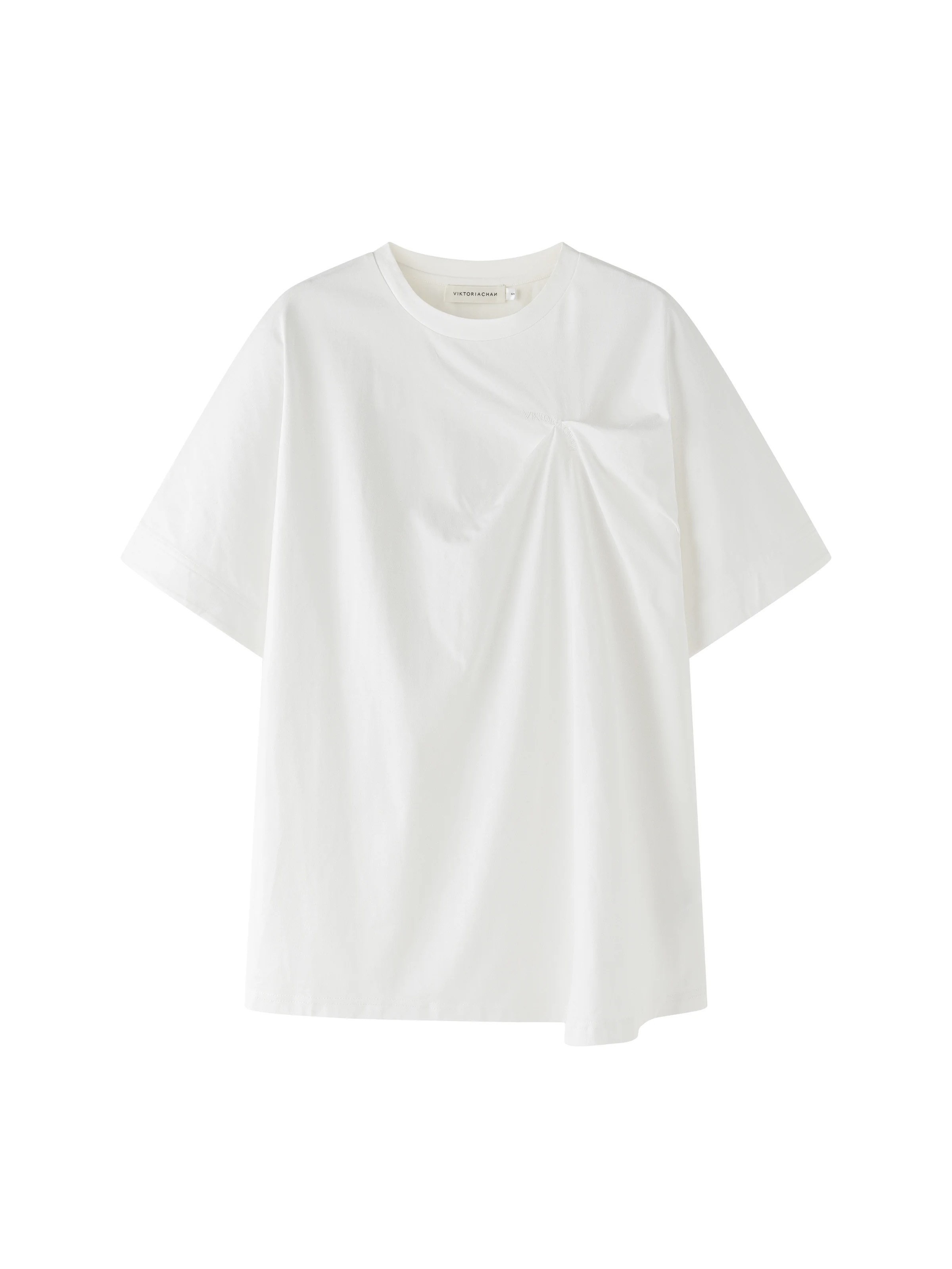 En oversized T-skjorte med vide ermer, med en rynket vriddetalj på den ene siden av brystet, som gir effekten av at merkets logo subtilt drar og vrir i stoffet.