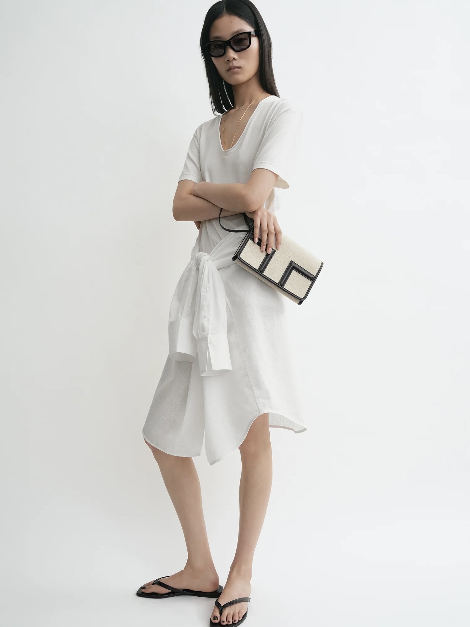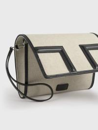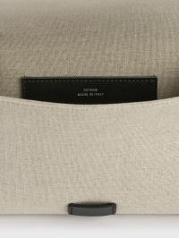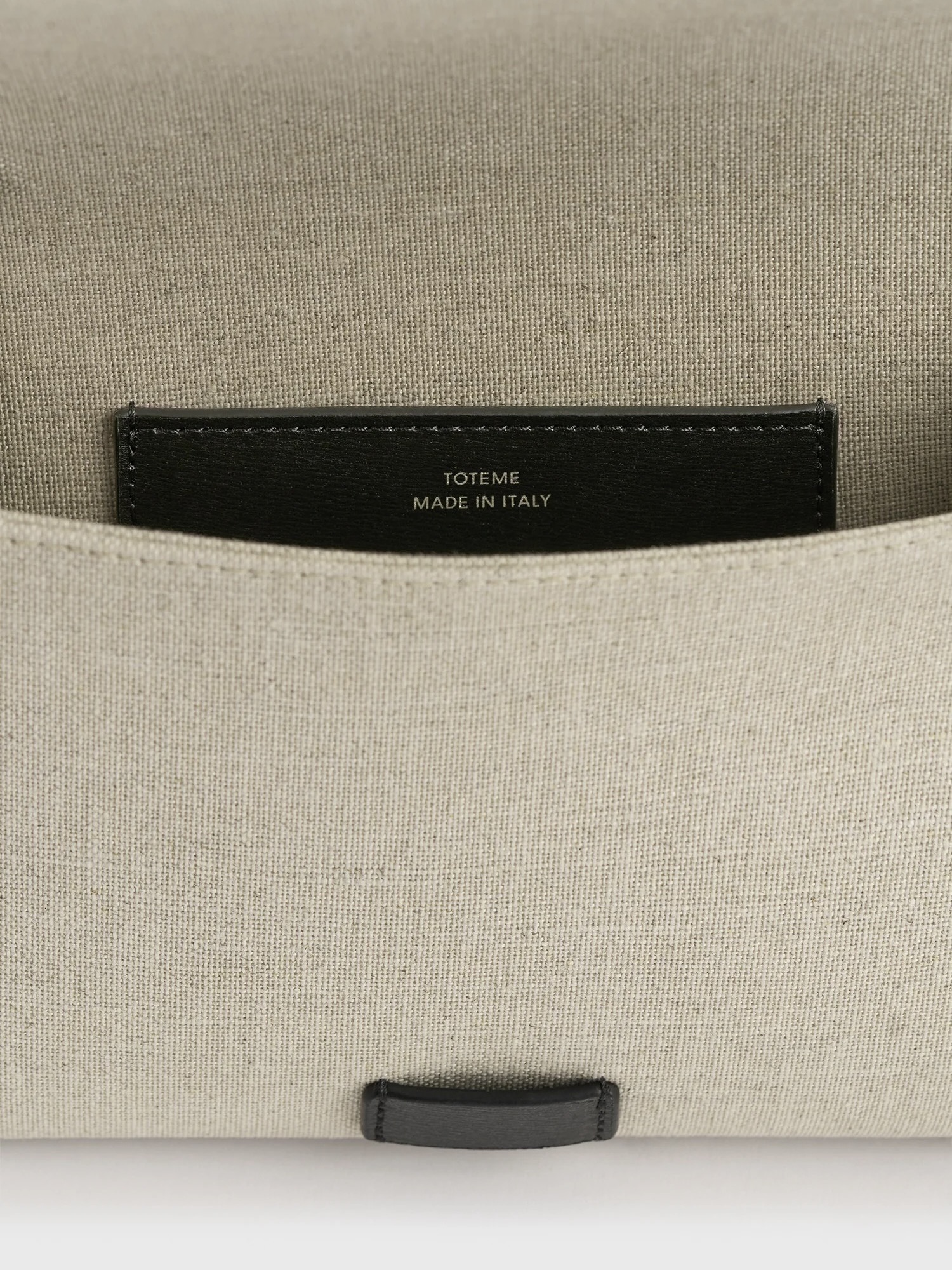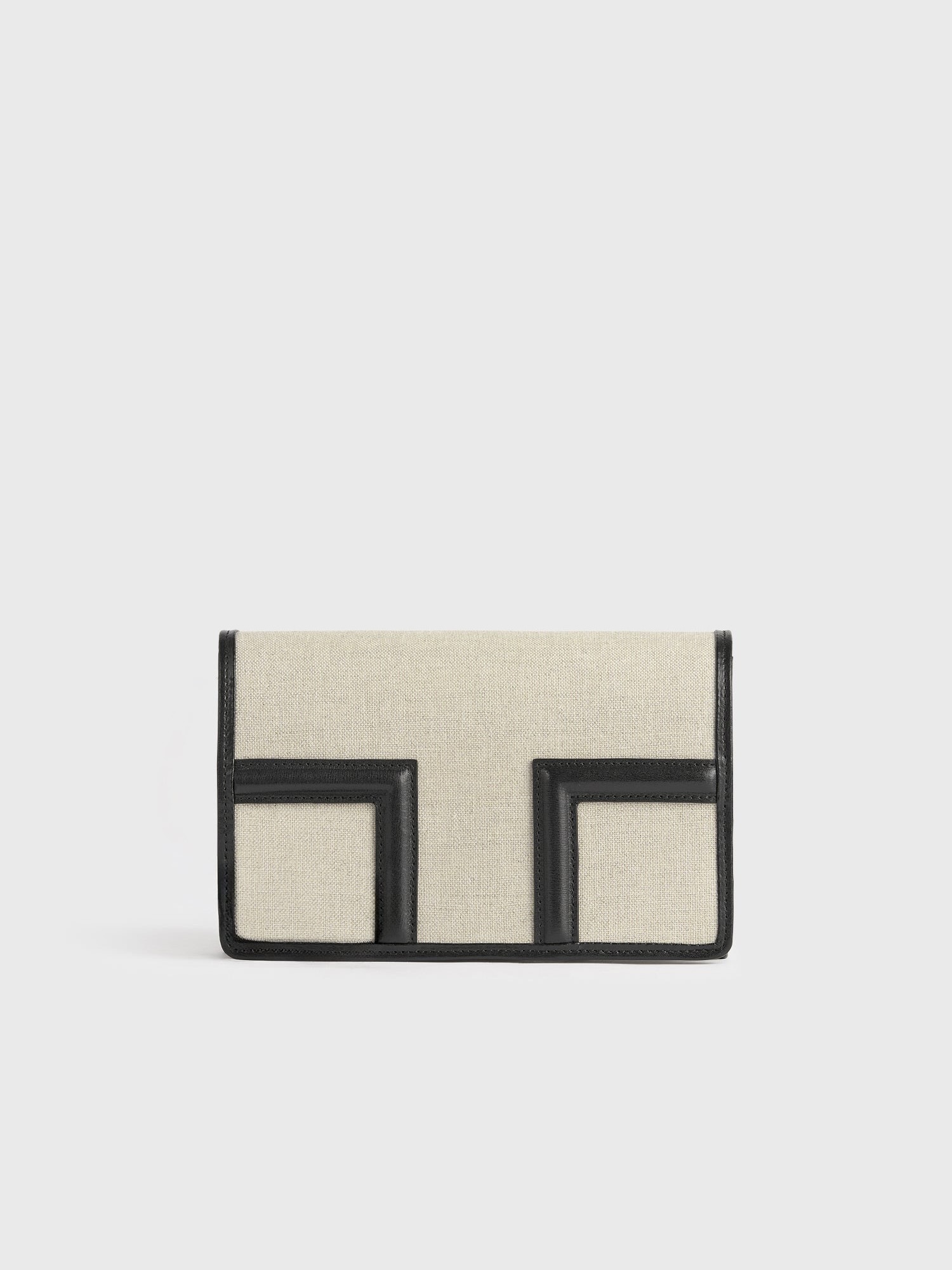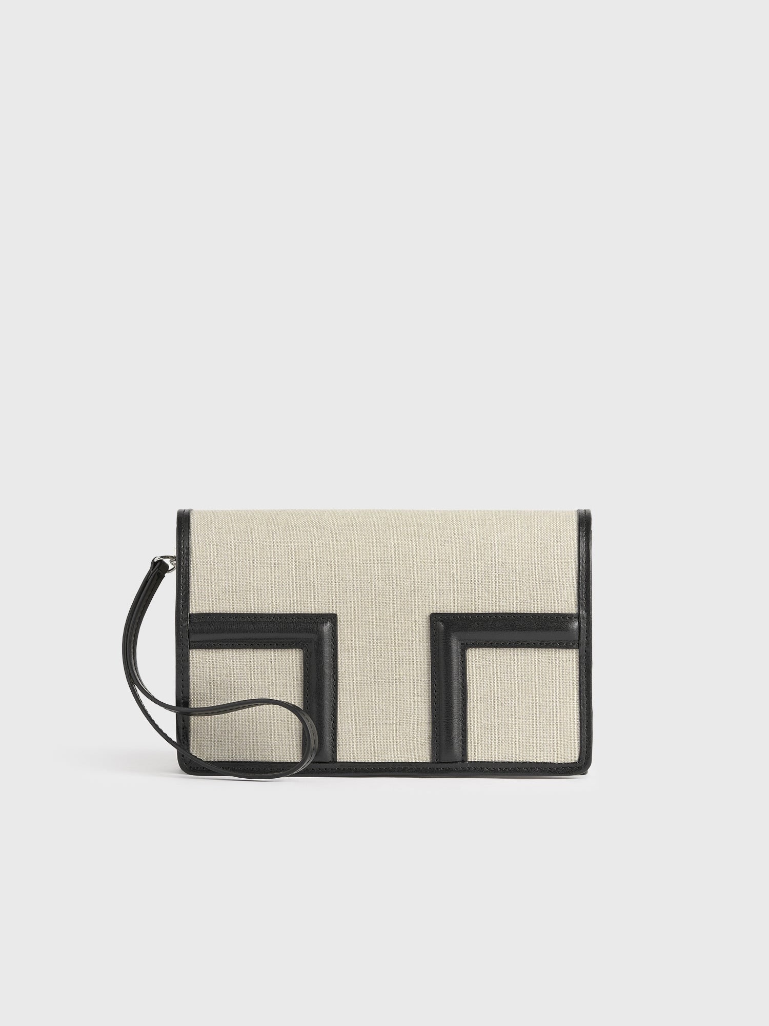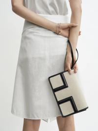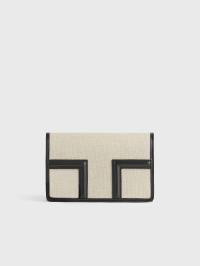 Designerens merknad: «T-klaffvesken er omtolket som en sommerclutch for TOTEME Garderob-kuratasjonen. Laget av lerret i en konvoluttsilhuett med svart skinndetaljer, har den en avtakbar håndleddsstropp for allsidig styling. Kombiner den med ton-til-ton separate antrekk til lunsj.»