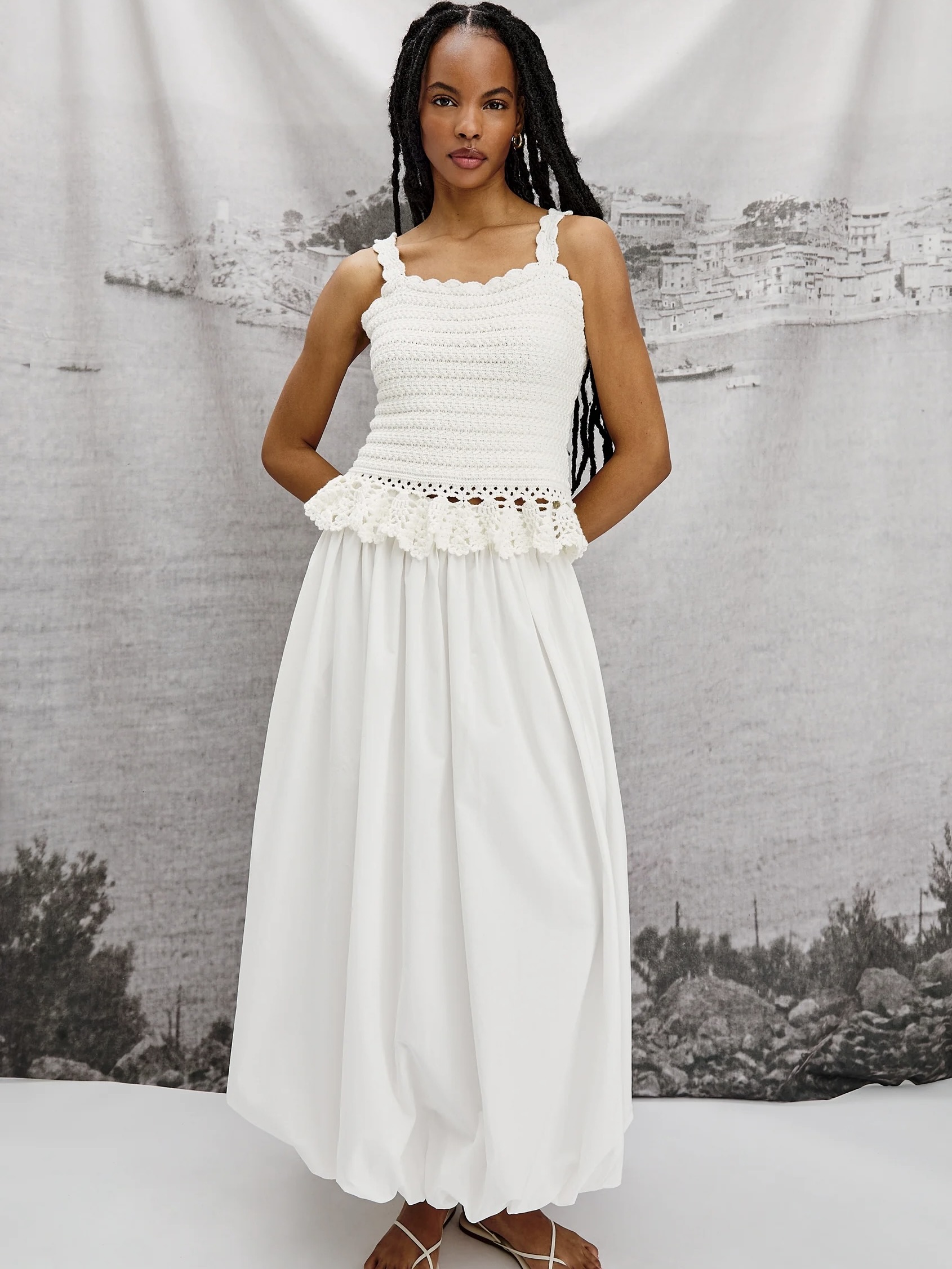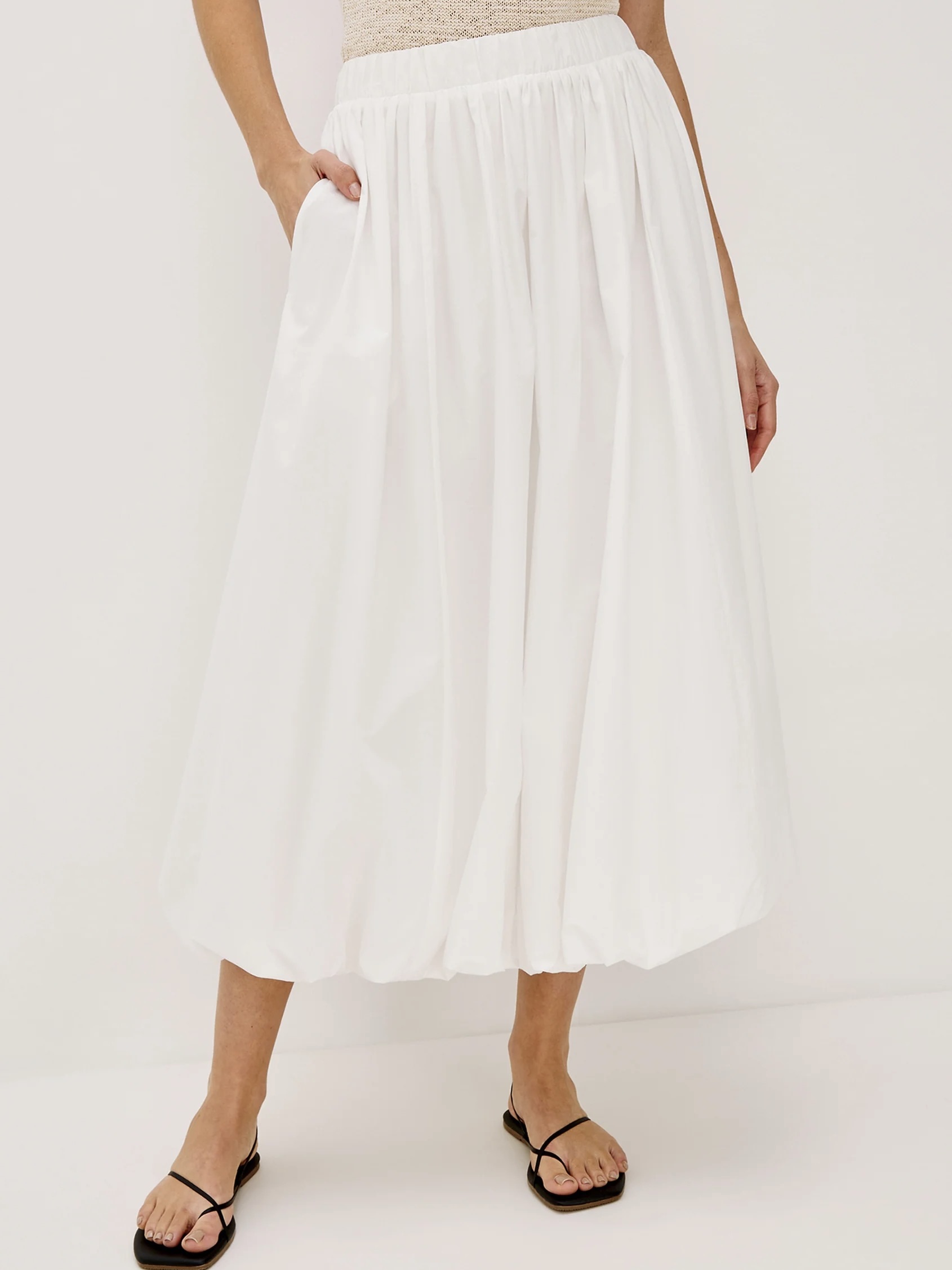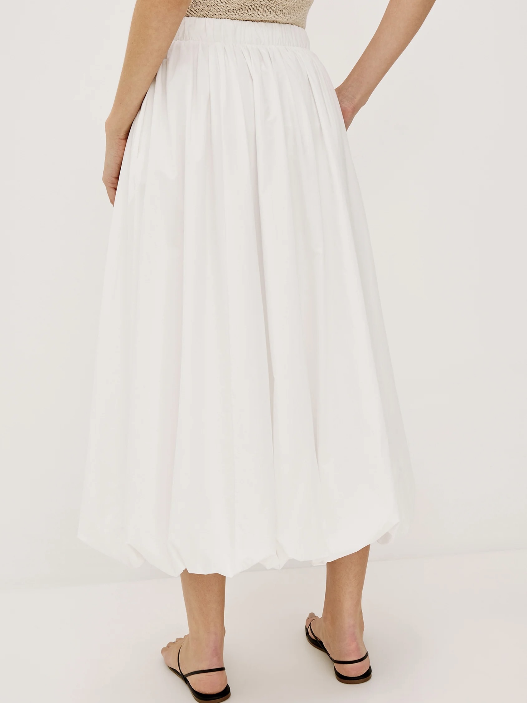 Bomullspoplinen Cala er et vidt midiskjørt designet med boblekant. Avsluttet med en elastisk linning for ekstra komfort – pluss lommer.