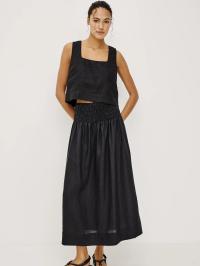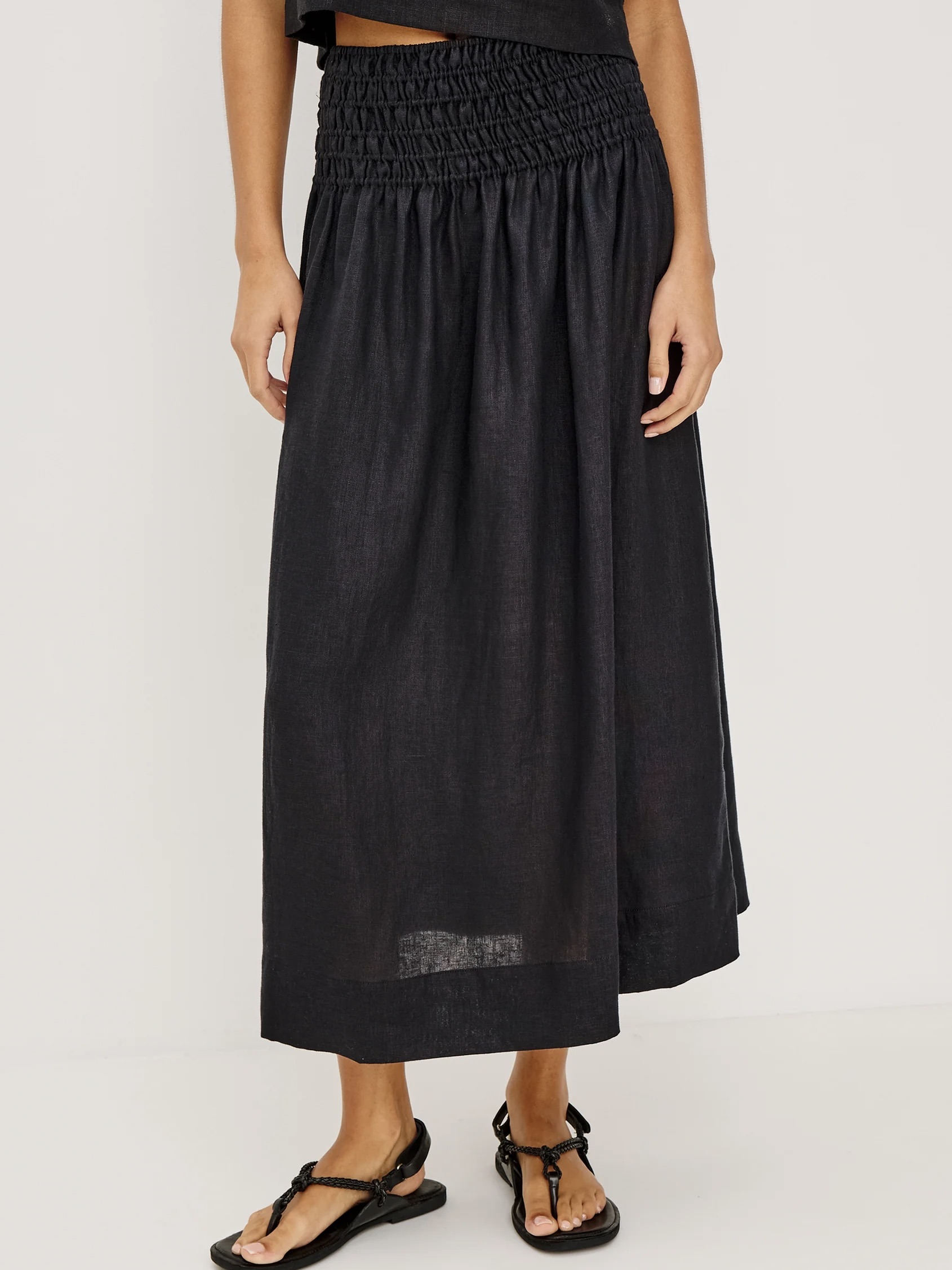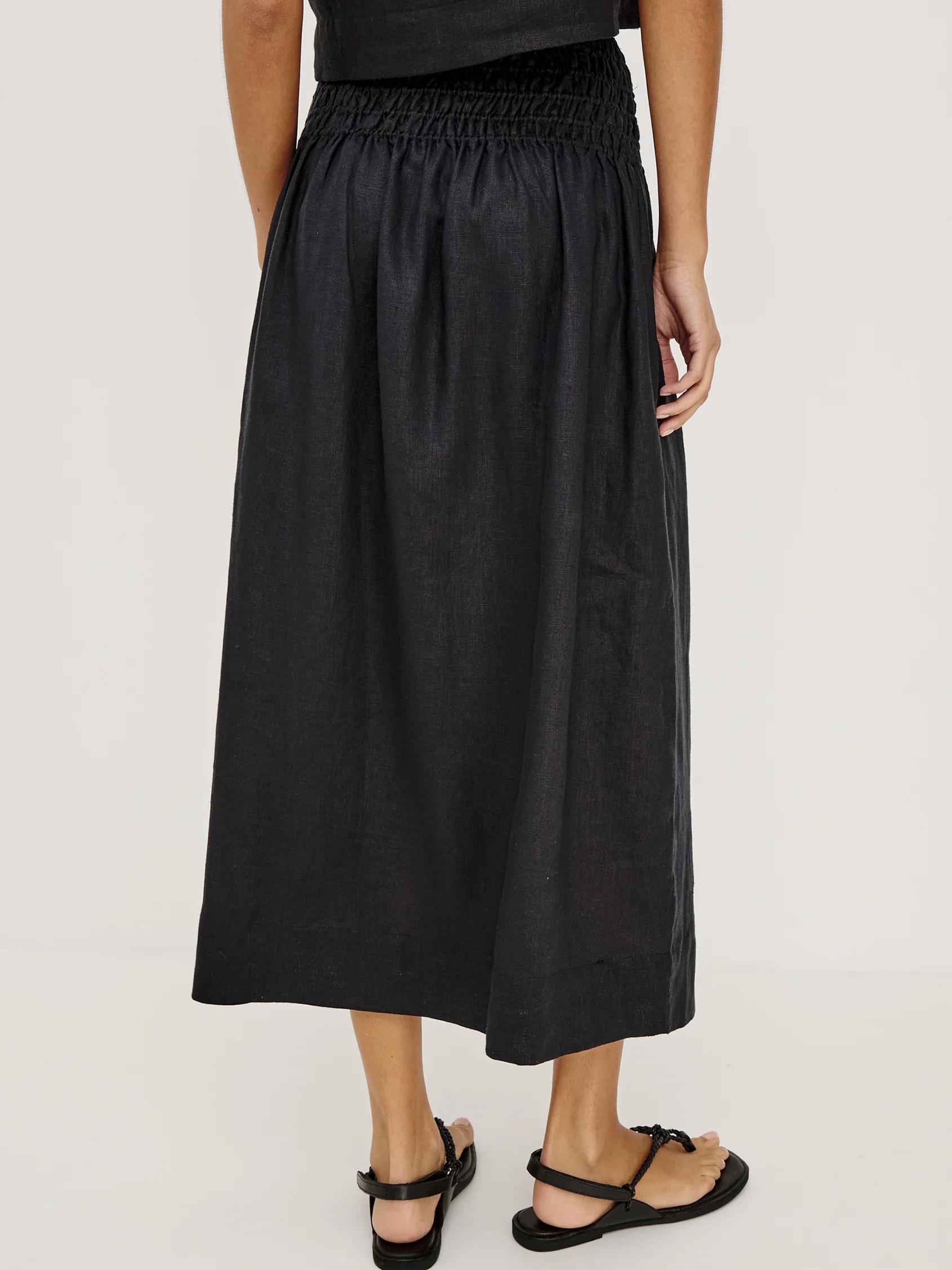 Alessa-skjørtet er et A-formet midi-skjørt med høy midje i lett strukturert lin, helfôret med en smockkant i midjen.