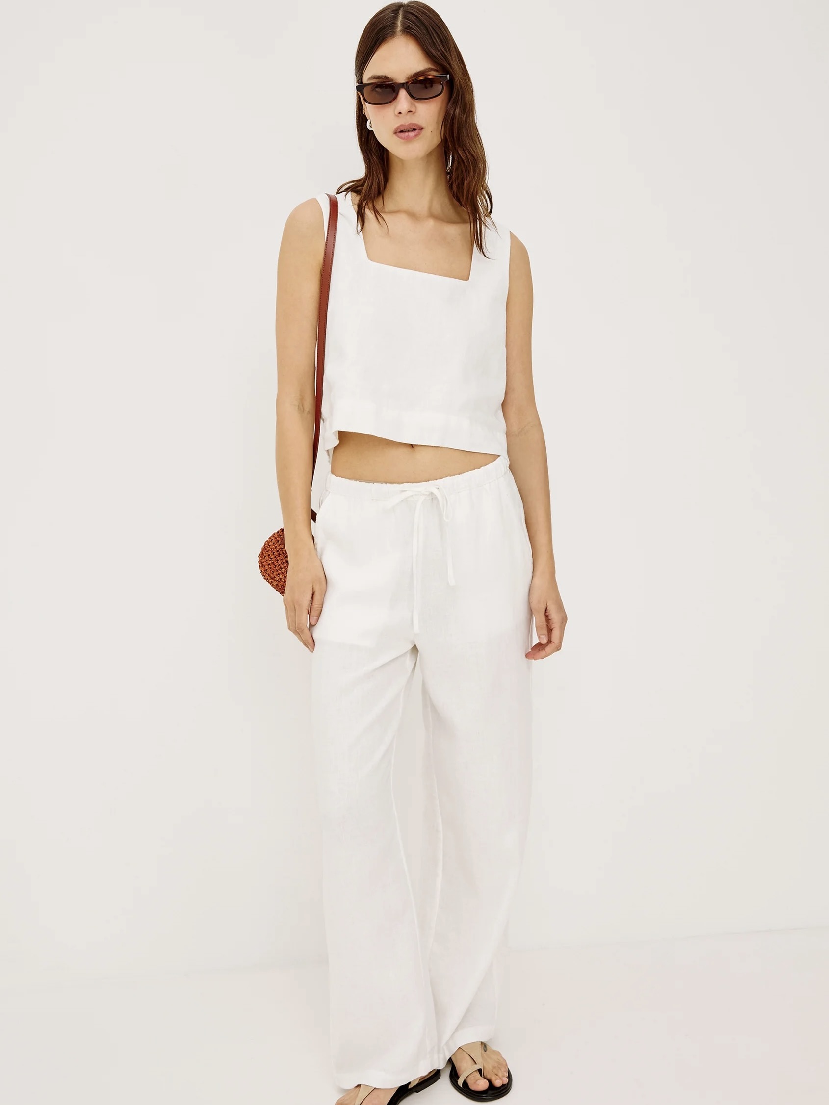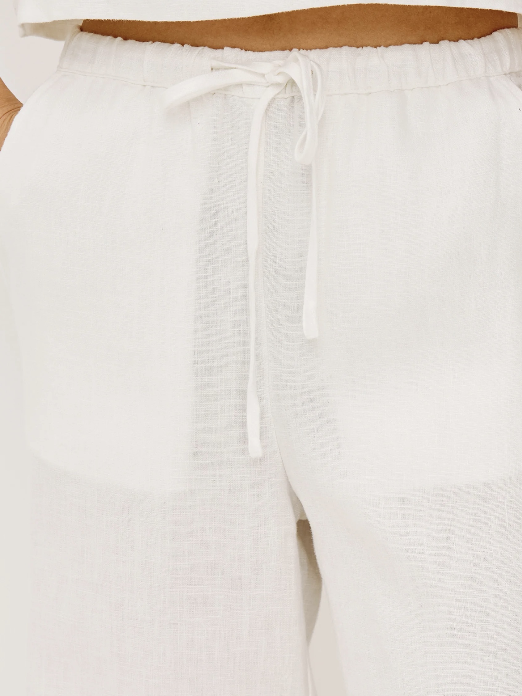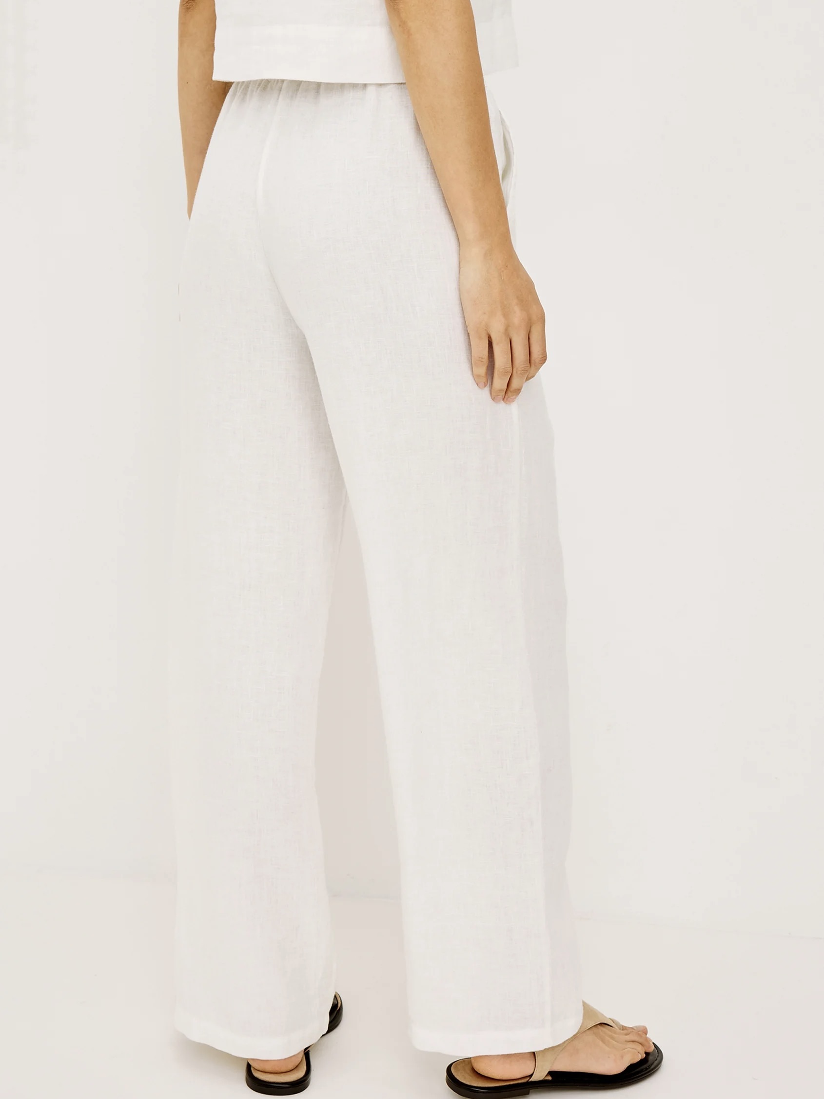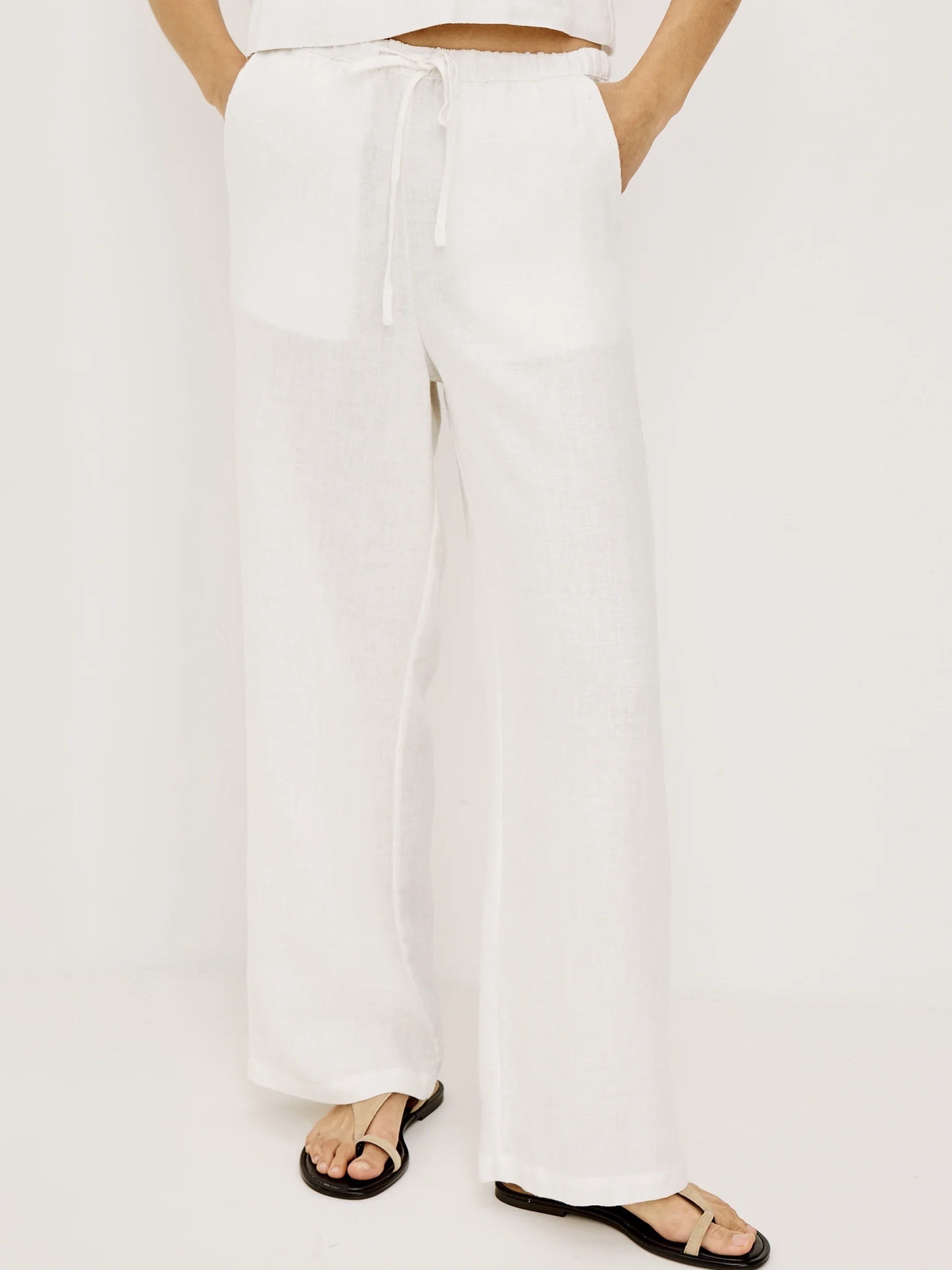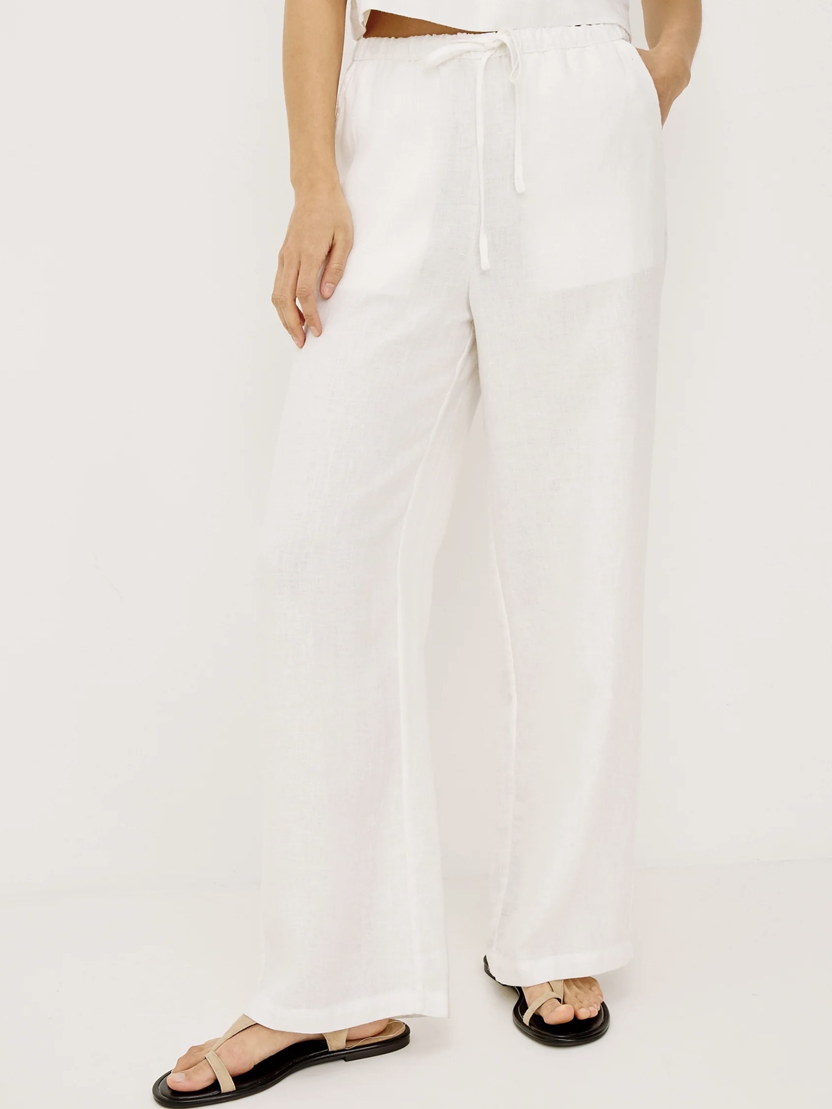Emmie er en høy, vid bukse med vide ben, laget av ufôret lin med myk struktur, med en avslappet passform rundt hofte og lår, sidelommer og justerbar snøring i midjen.
