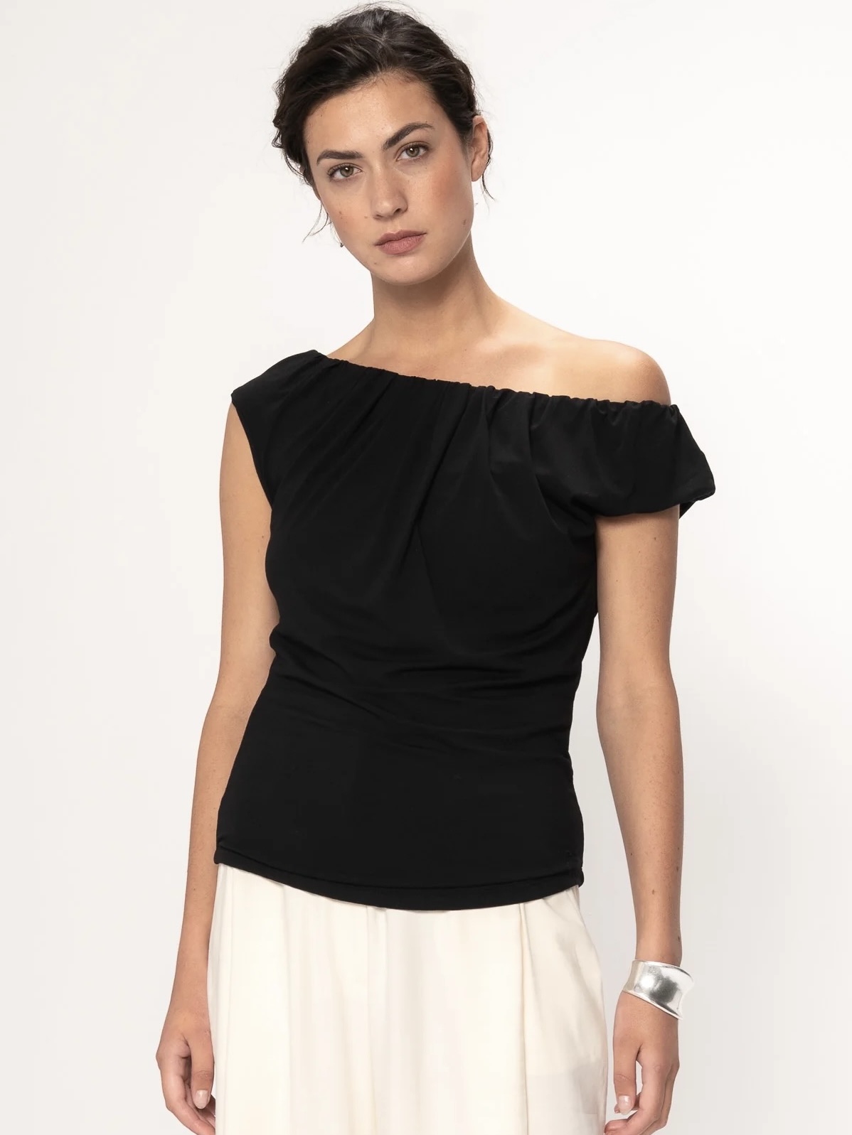 En ermeløs topp med en bred, mykt rynket halsutringning, kuttet av VIVEHs signatur ECOVERO™ viskosejersey. Halsutringningen kan brukes rett over skuldrene eller styles asymmetrisk. Designet som et uanstrengt plagg for et elegant hverdags- eller kveldsantrekk.
