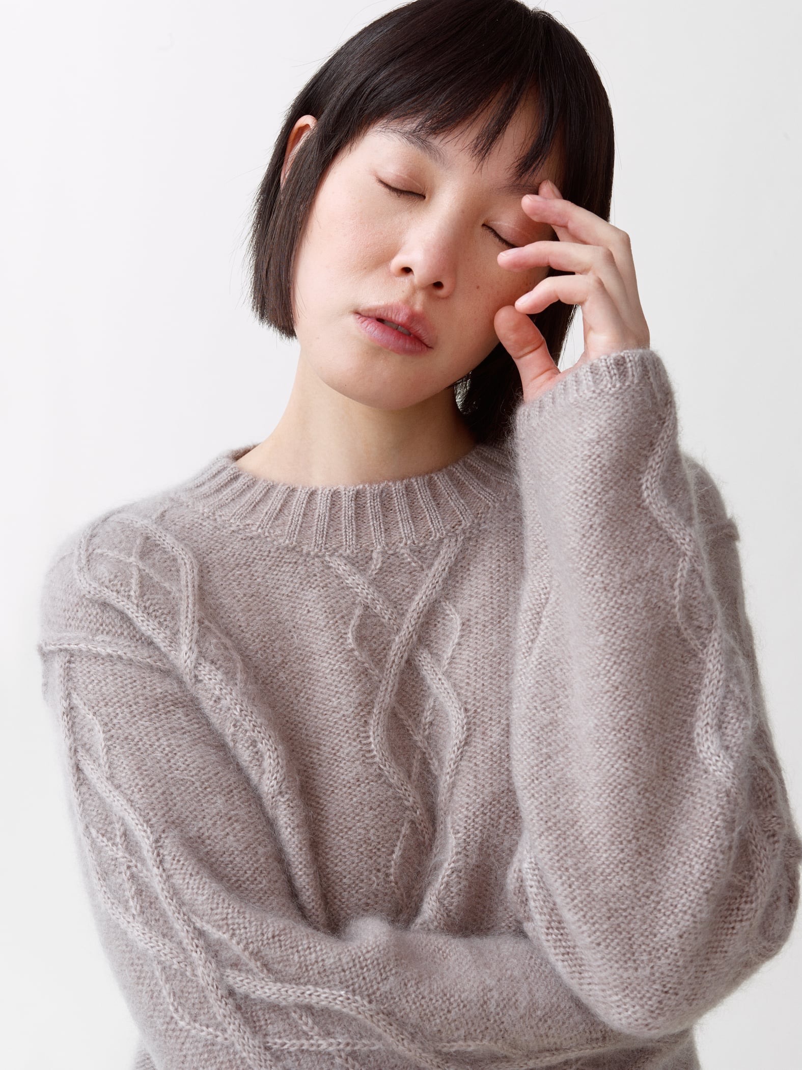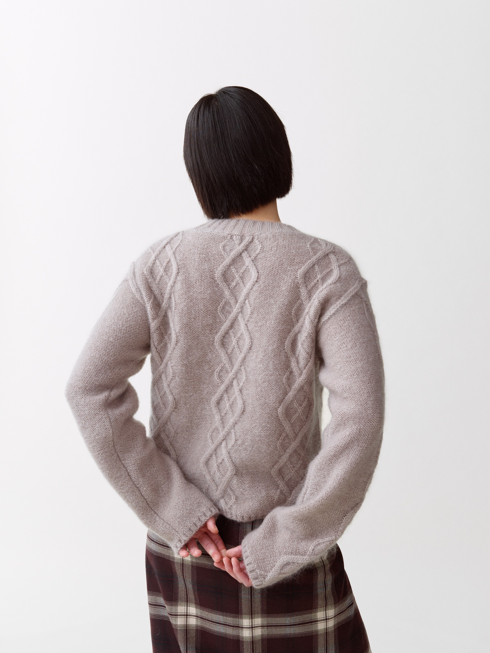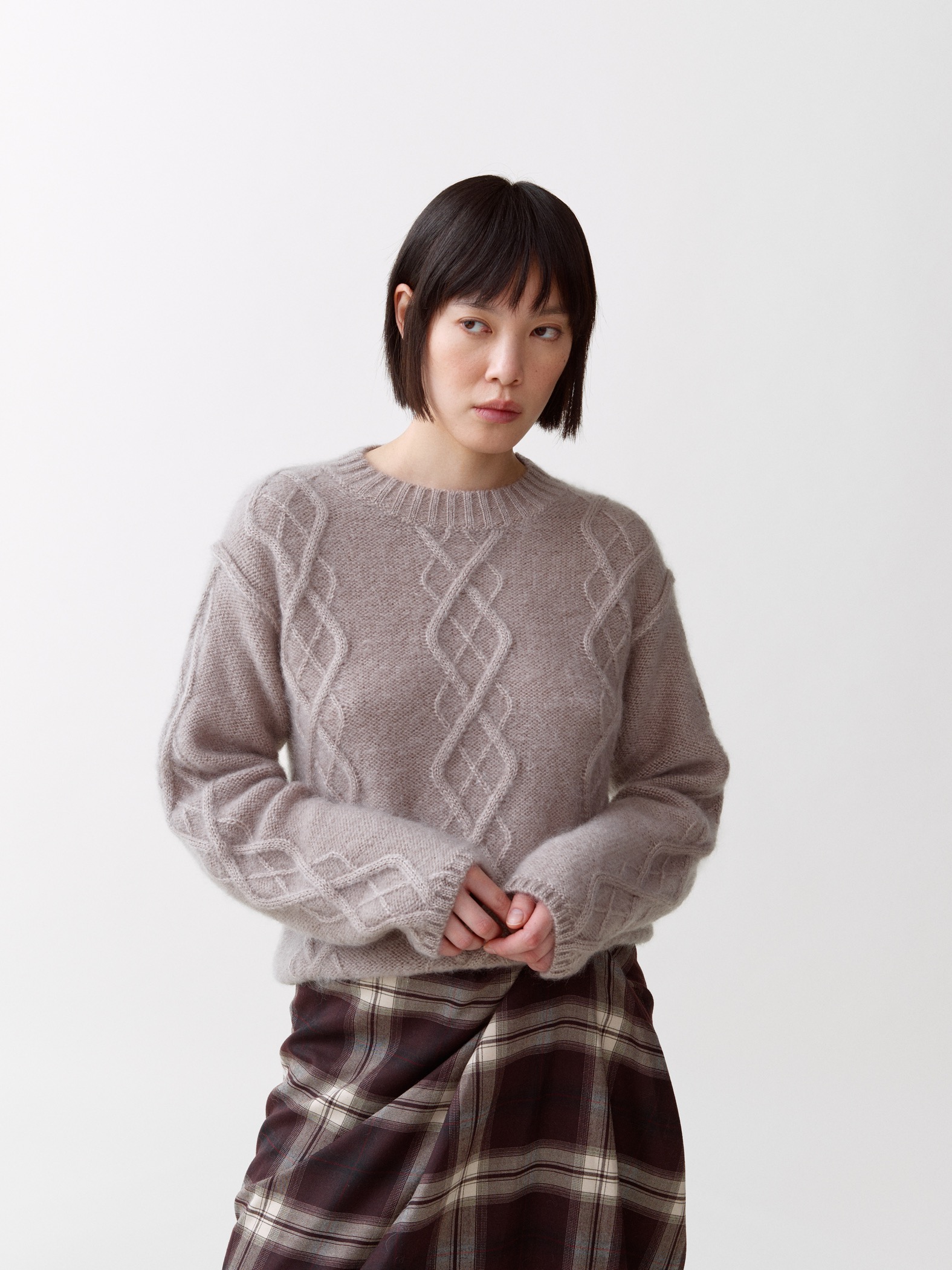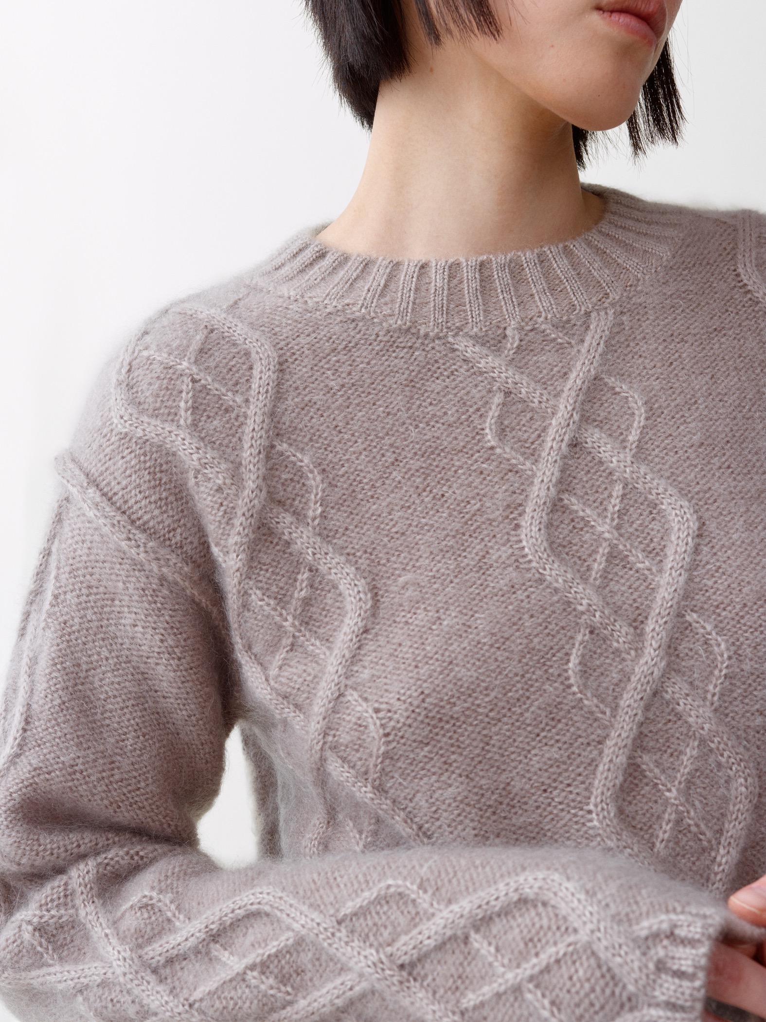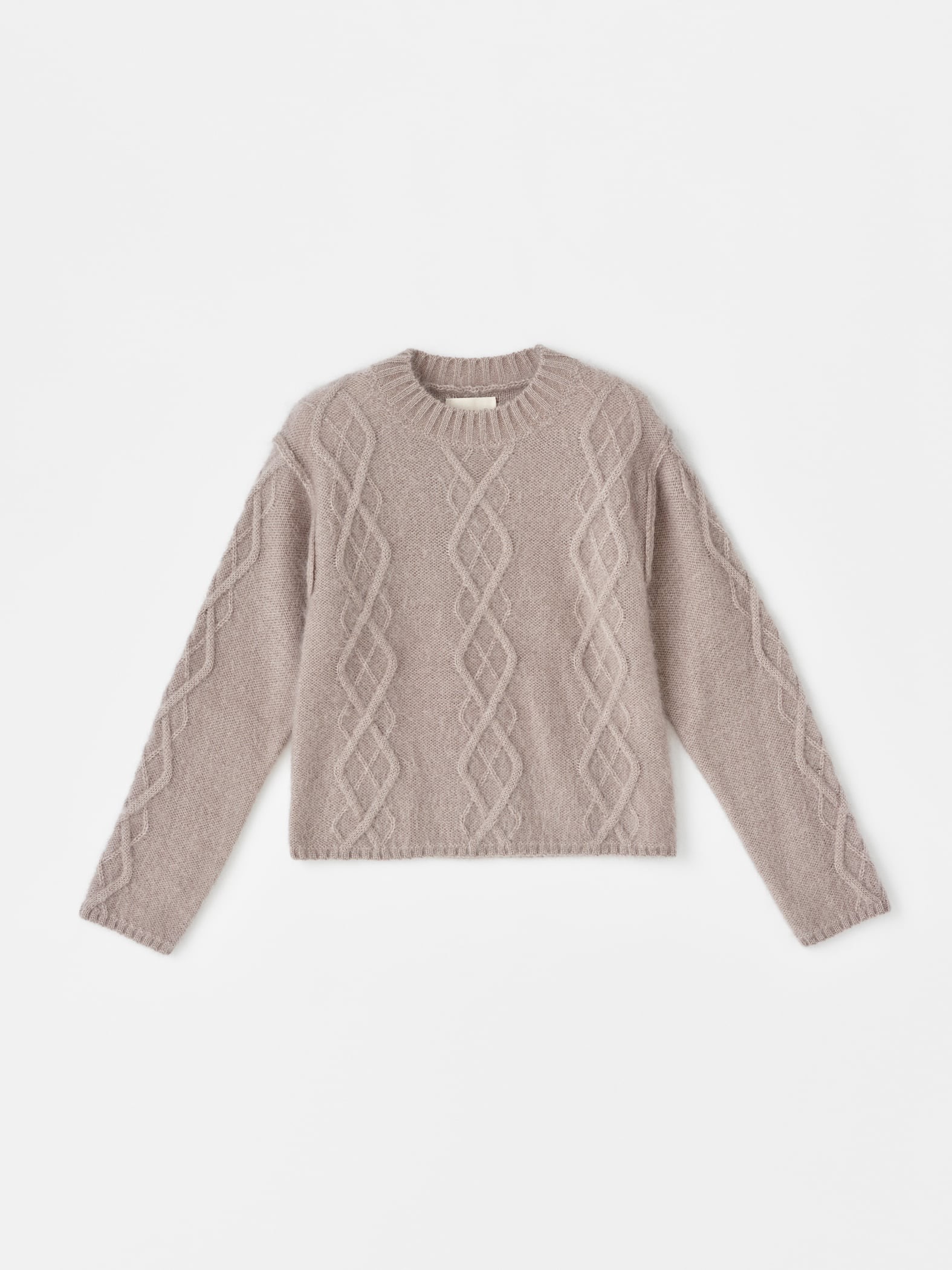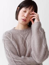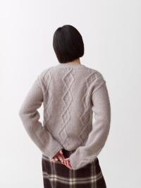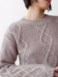 Yr er en lett flettestrikket genser inspirert av norske mønstre. Strikket av en fin blanding av mohair og silke, noe som gir en luftig og raffinert følelse. Detaljert med litt senkede skuldre og synlige sømmer for et moderne uttrykk. Finnes i sand og lyseblå.