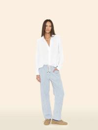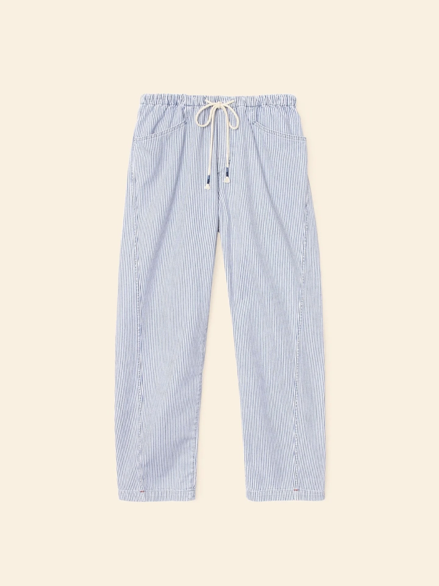Denim Days. Baxter er oppdatert denne sesongen i vår jernbanestripete denim. Denne litt avkortede pull-on-buksen har elastisk snøring i midjen med taudetaljer, firkantede lommer foran, lommer med klaff og knappelukking bak og et diskret tønneben.