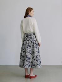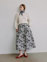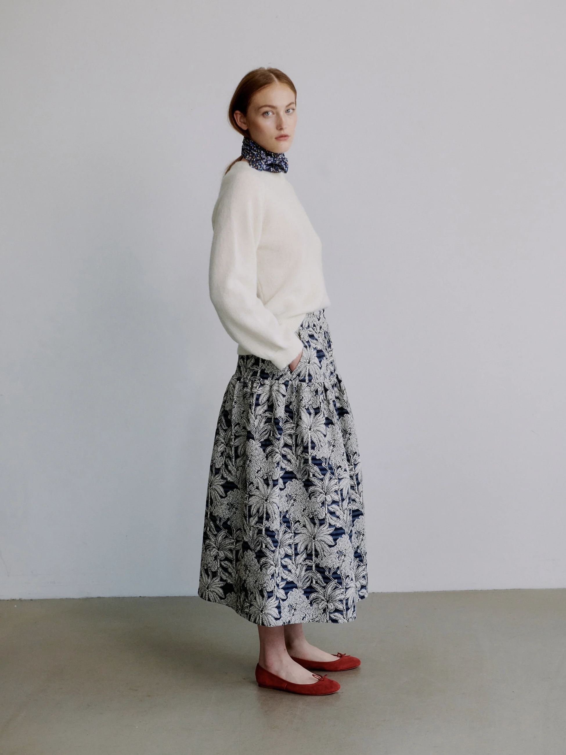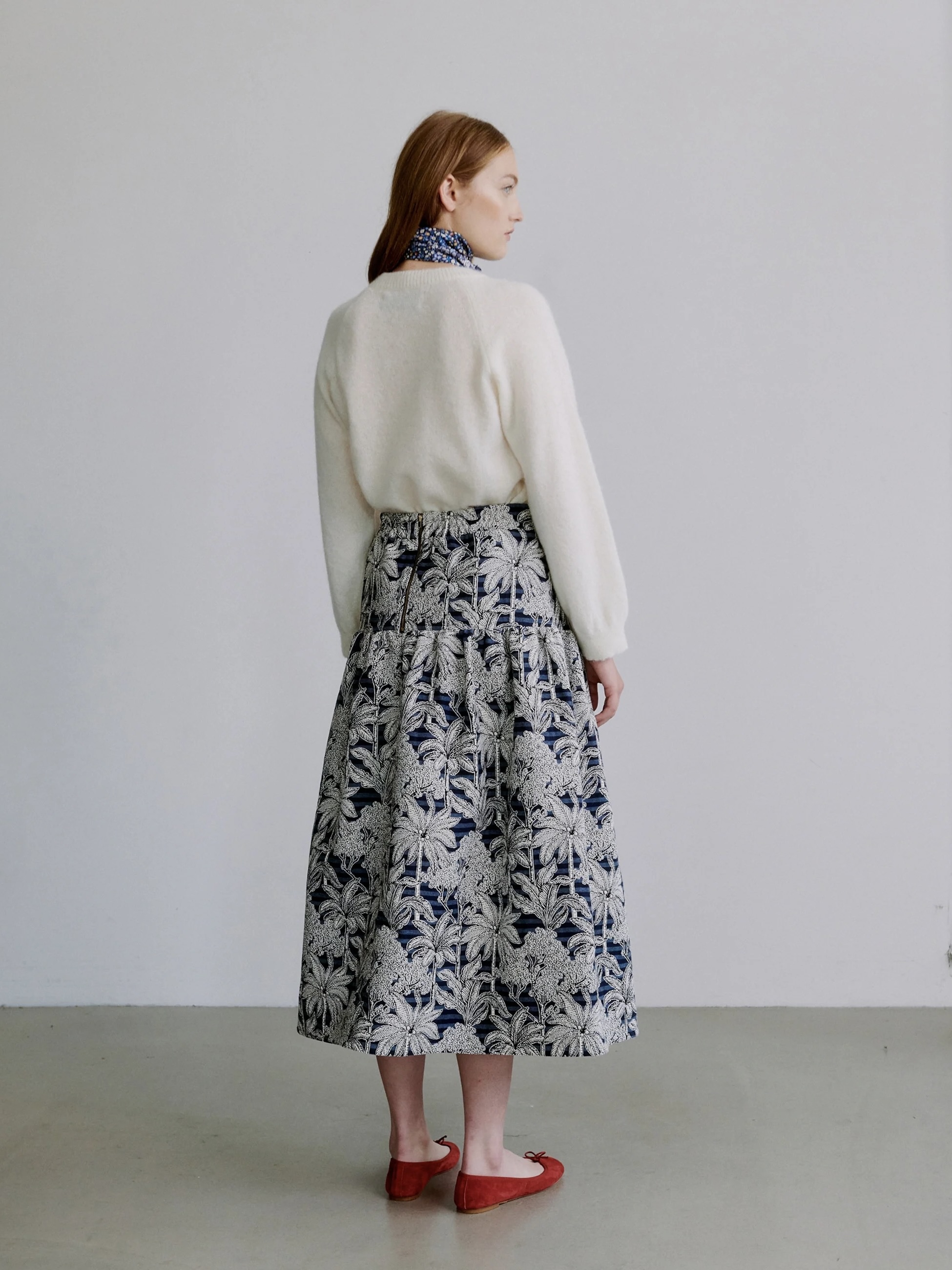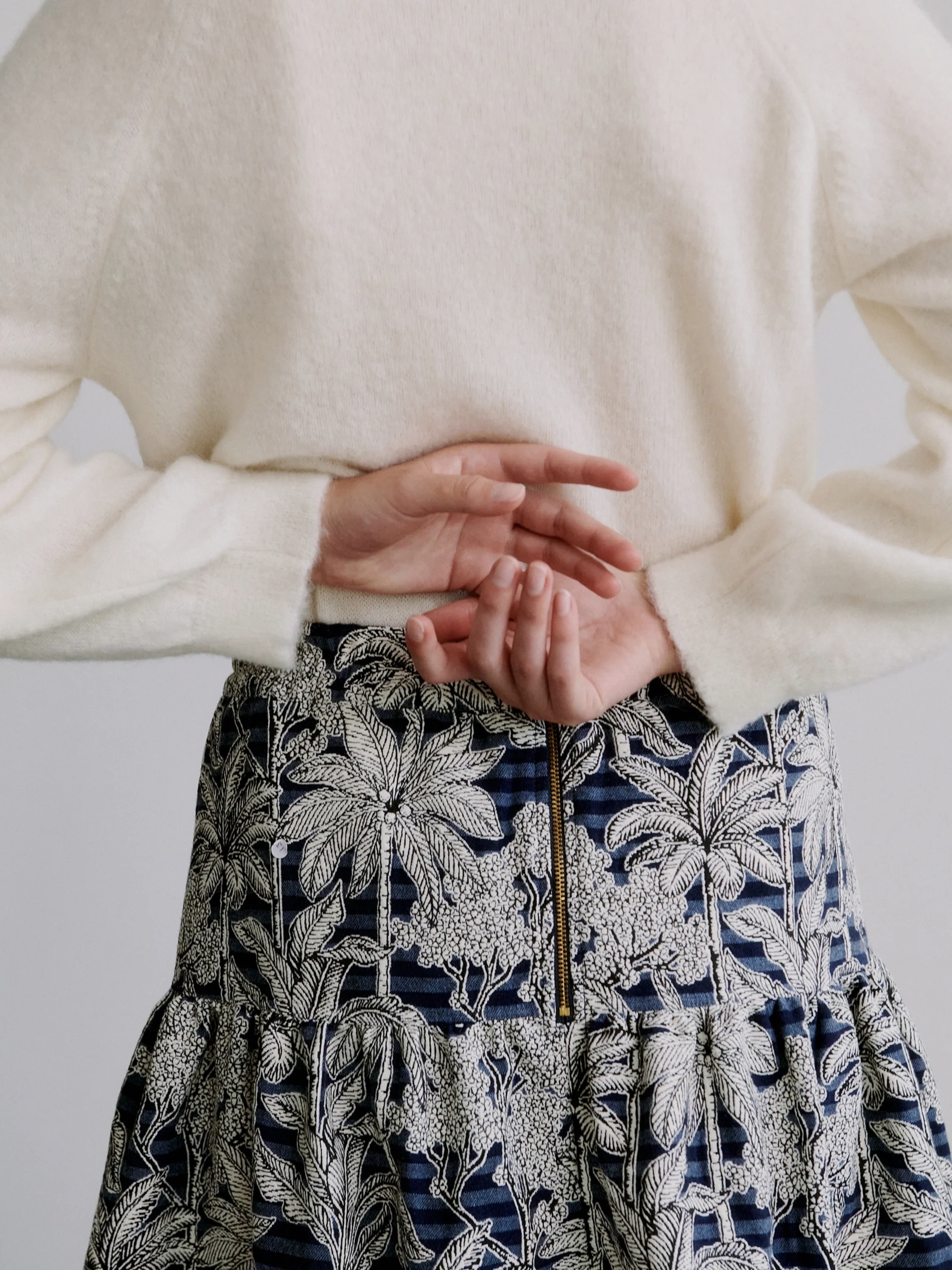 Bodil-skjørtet i Blue Palm Escape er laget i en strukturert jacquardblanding, noe som gir henne en flatterende fasong med hverdagskomfort. Den elegante A-linjesilhuetten og det grafiske palmetrykket gjør henne til en allsidig favoritt.