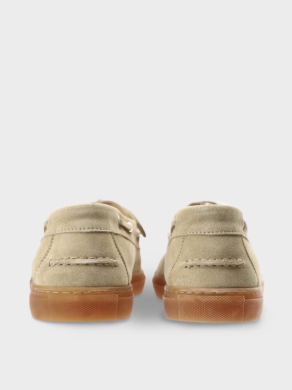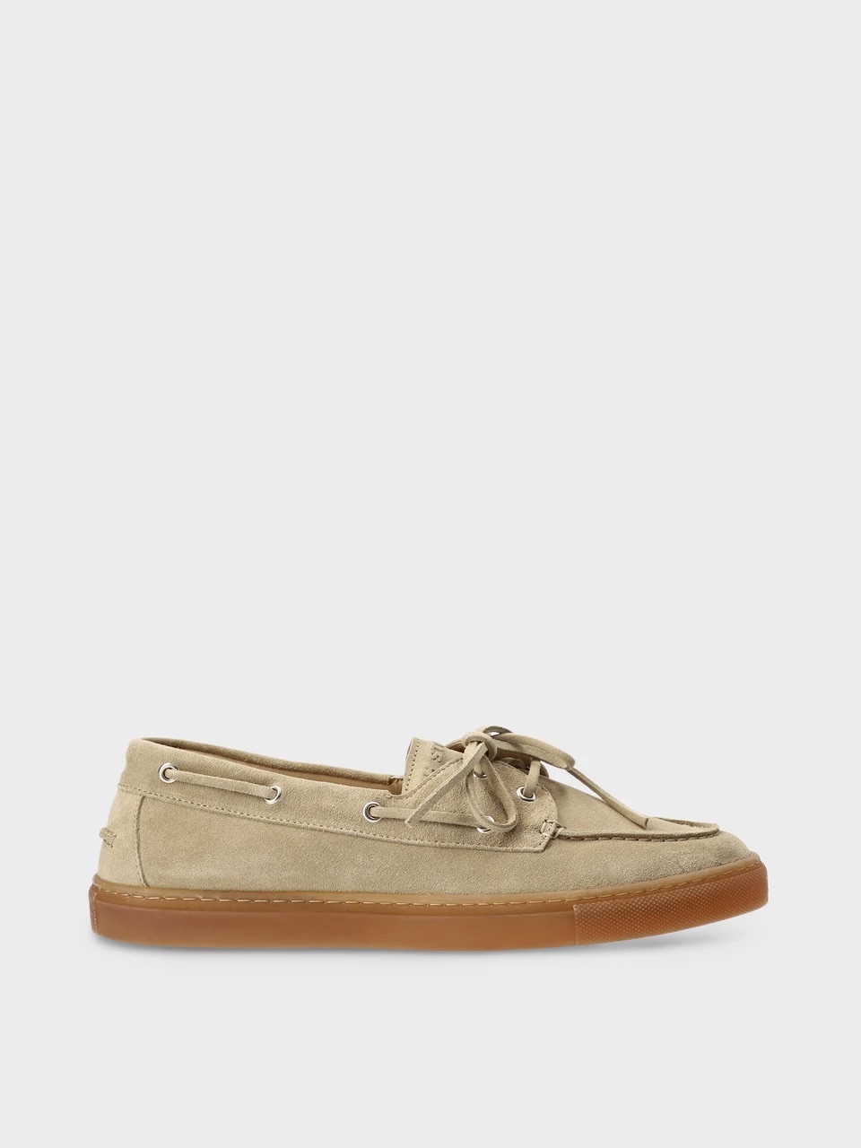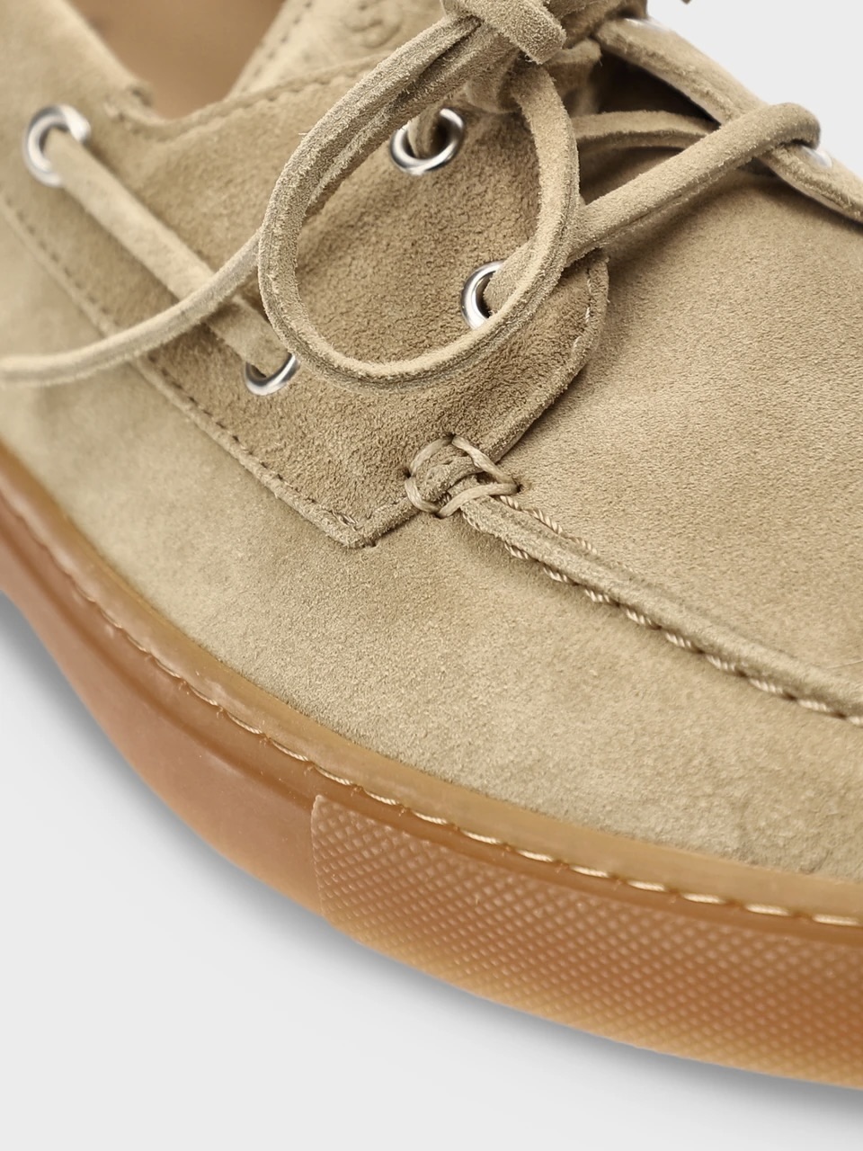 Båtsko i mykt semsket skinn med en avslappet silhuett. Minimalistiske elementer med broderte detaljer og den hevede sømmen foran gir designet et særegent preg. Logodetaljer på pløsen og innersålen gir subtile aksenter. Komfortabel slip-on-modell med dekorativ snøring og metalldetaljer, rund tå og en flat, teksturert såle – stilige loafers for et avslappet sommerutseende.