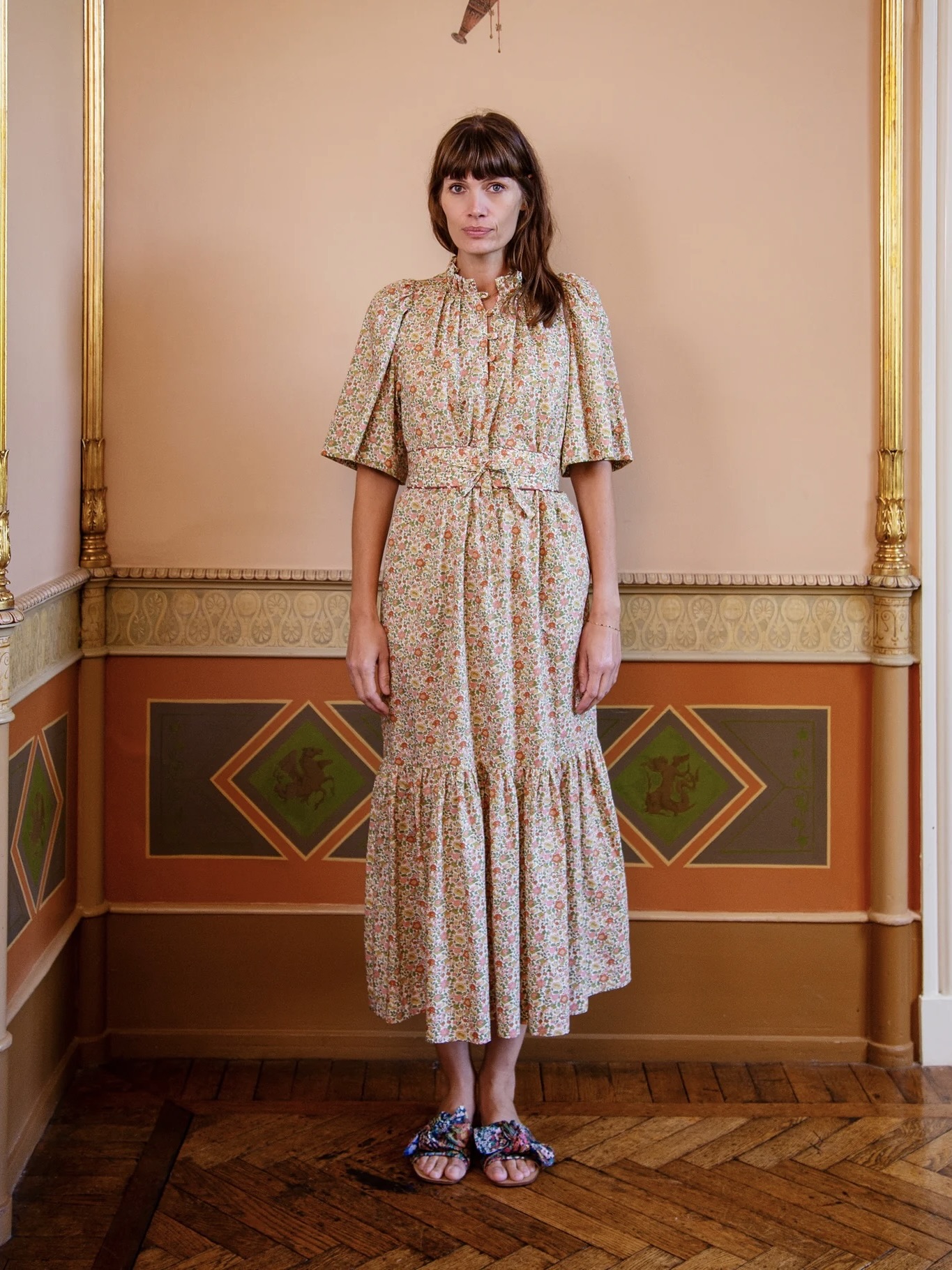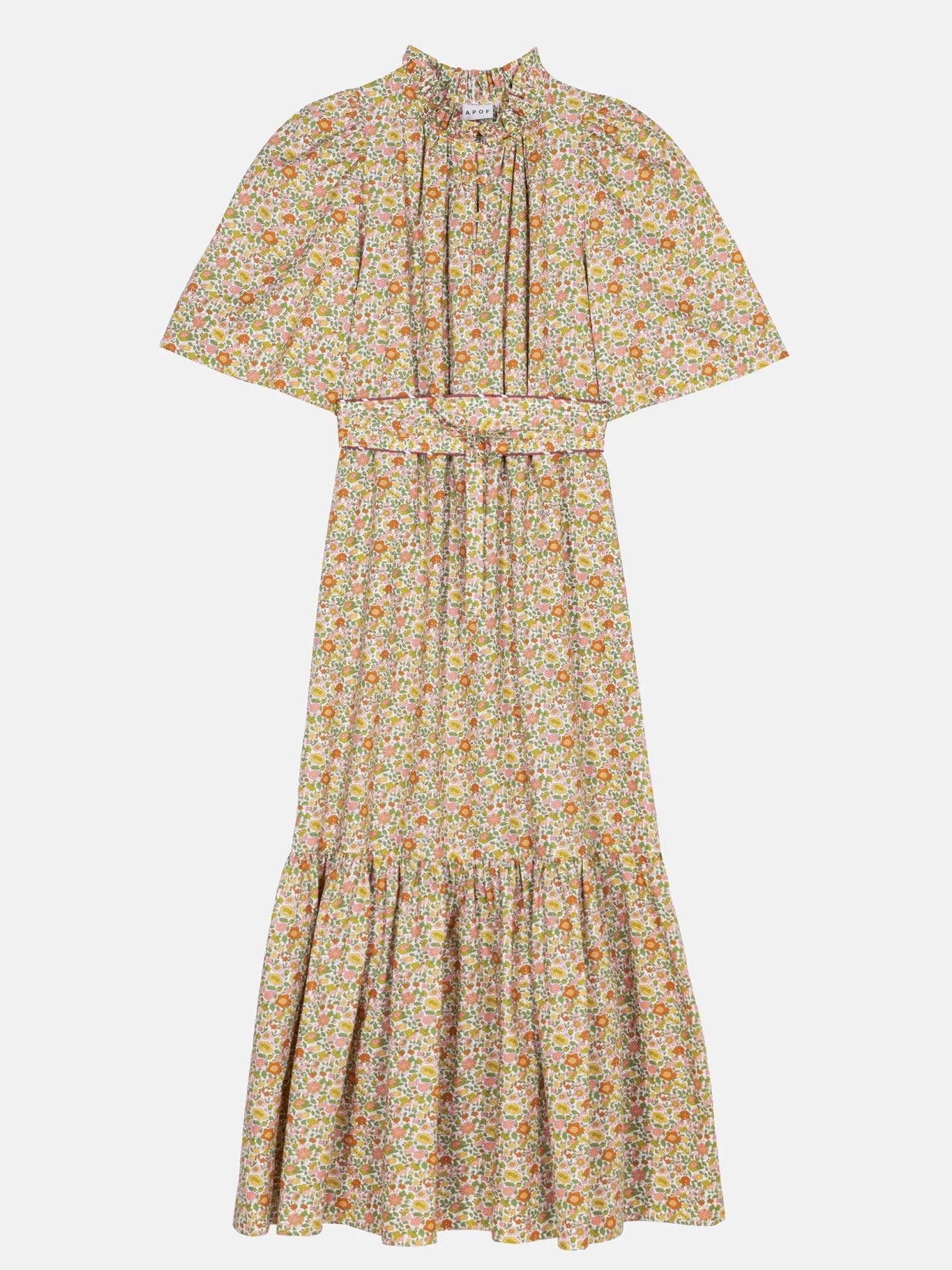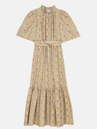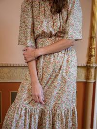 Inga Dress i Theresa er en feminin midikjole med høy hals, delikate folder foran og knappelukking på brystet. Med korte ermer, sidelommer og et avtakbart belte, kan hun brukes både med eller uten skjørt.
